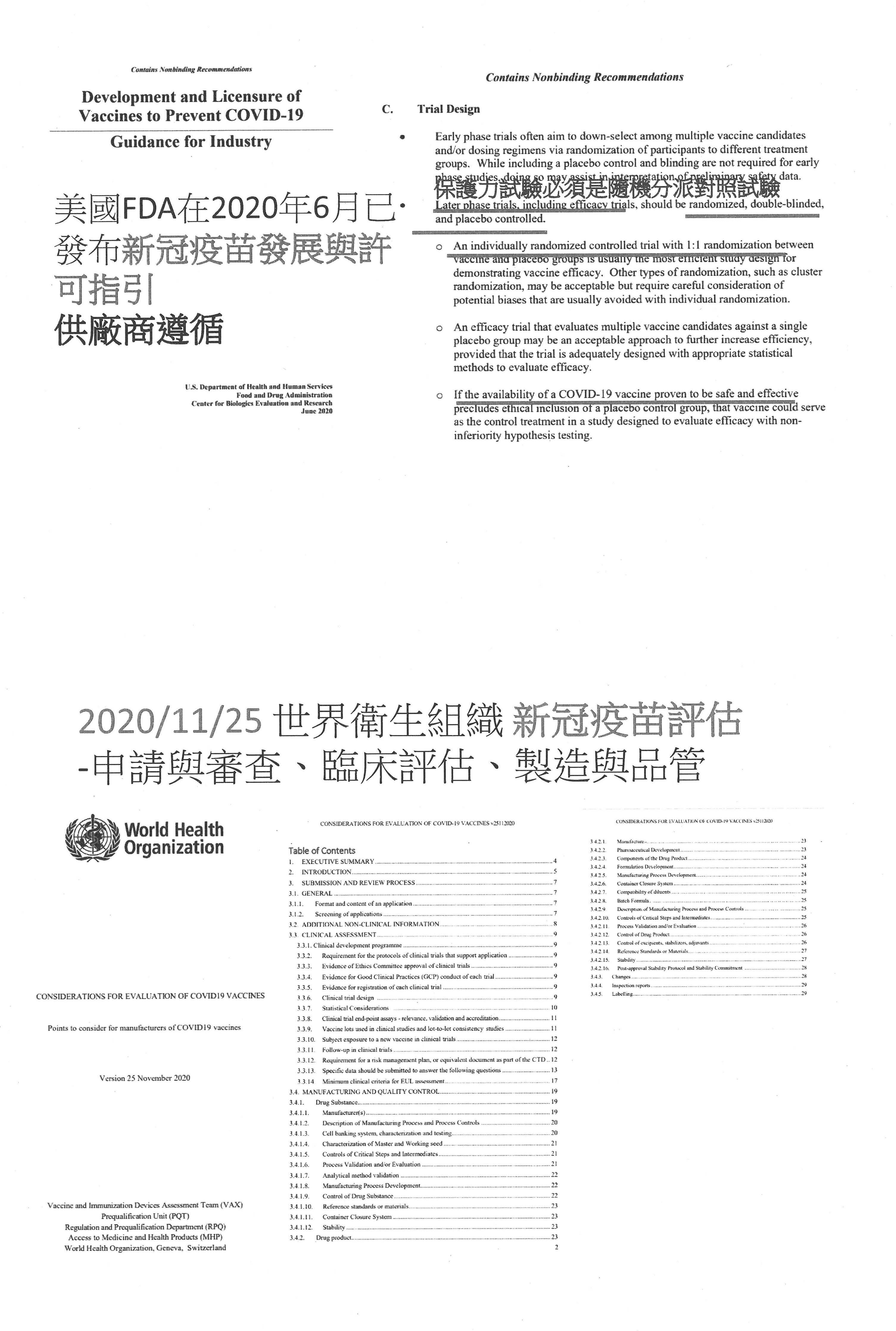 (二)食藥署綜合考量國際法規趨勢與國內疫情環境,經專家會議共同討論,權衡COVID-19疫情的威脅風險與疫苗療效評估的法規科學理論基礎,訂定「我國對COVID-19疫苗EUA審查及療效評估基準」,作為廠商研發的參考依據。