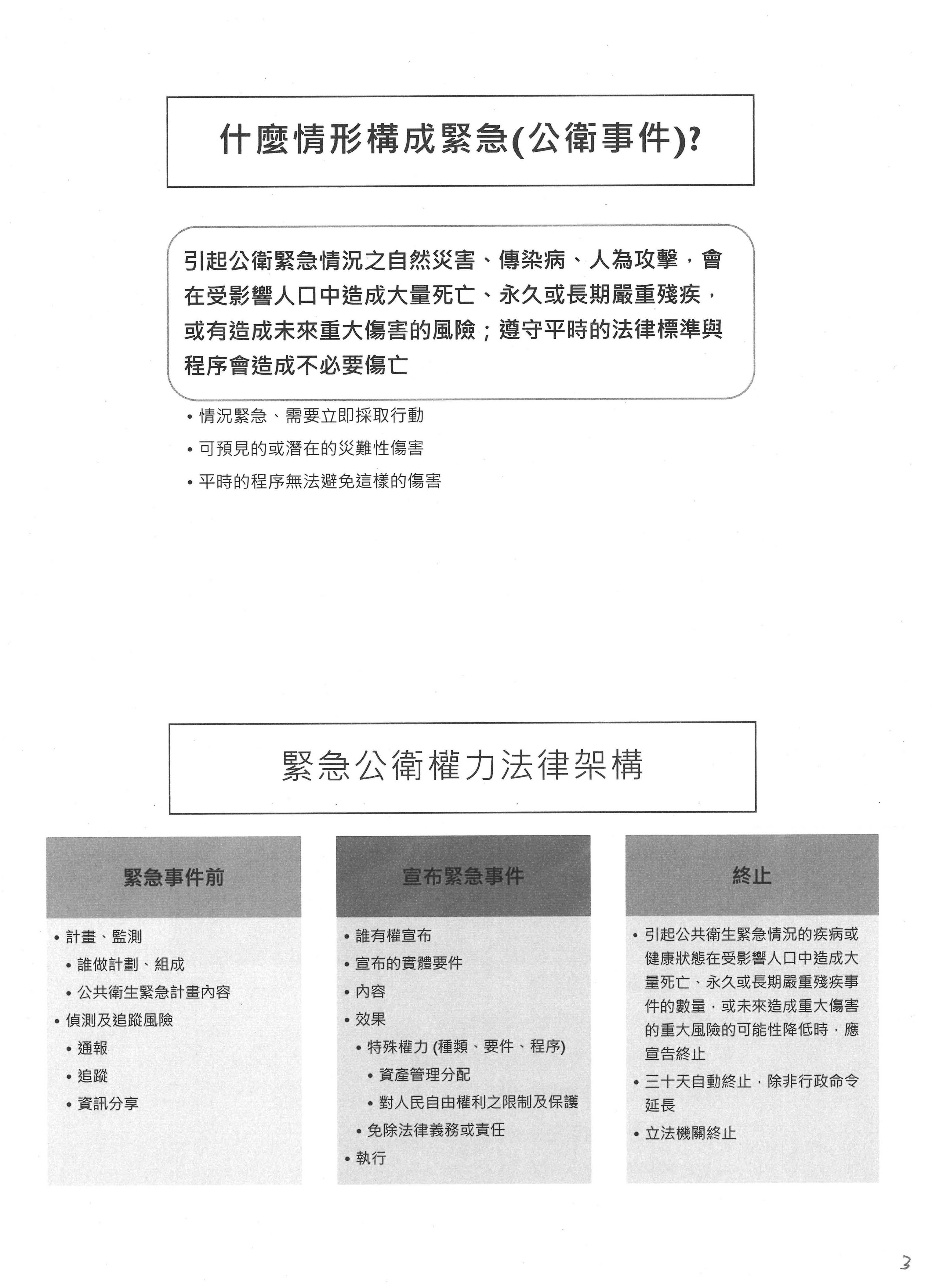 問題是,如果我們今天要往前走、我們要向前看,如同剛剛林靜儀委員說的,我們接下來要面臨的是更頻繁的新興傳染病威脅的時候,那我們應該要怎麼做?今天一個很大的重點其實是要來討論解方啦!討論如何解決,那麼我認為現階段我們能夠做的事情,是好好地去釐清到底什麼情形之下可以叫做緊急公共衛生事件,那構成緊急公共衛生事件的時候,政府的組織權力應該有什麼樣的調整,這個可能是我們接下來可以做的事情。所以第一個我們想要討論的就是什麼叫做緊急?因為我們的疫情和國外非常不一樣,我們看到歐美各國從三年前就一直陸陸續續發布緊急,世界衛生組織也說這是一個緊急公衛事件,那到底什麼叫緊急?我們把緊急的定義、要件想清楚了之後才能夠解決後面的問題,其實所謂的緊急指的是什麼呢?有可能包含自然災害,不僅僅是新興傳染病,也有可能是人為的攻擊,這些都可能帶來公衛上的威脅,而這樣的威脅有可能在短時間之內造成大量死亡或大量死傷,這個時候才叫做緊急,所以緊急應該包含三個很重要的要素,一個就是我們需要立即採取行動,不然會有很大程度的傷亡,而我們如果按照平常的程序是沒有辦法避免這樣的傷害的,在構成這樣的要件的情形之下,我們就會說它是一個緊急的公衛事件。