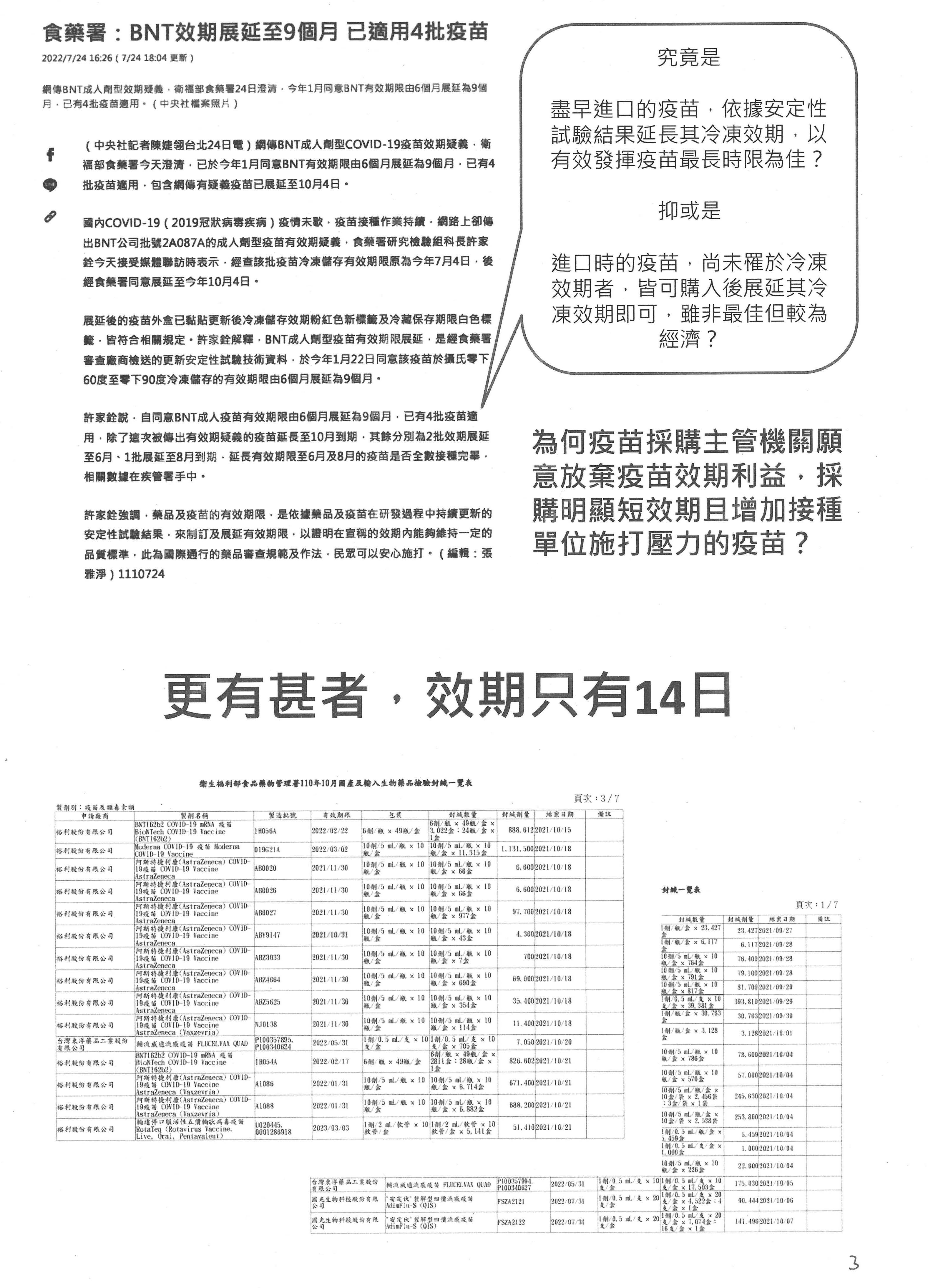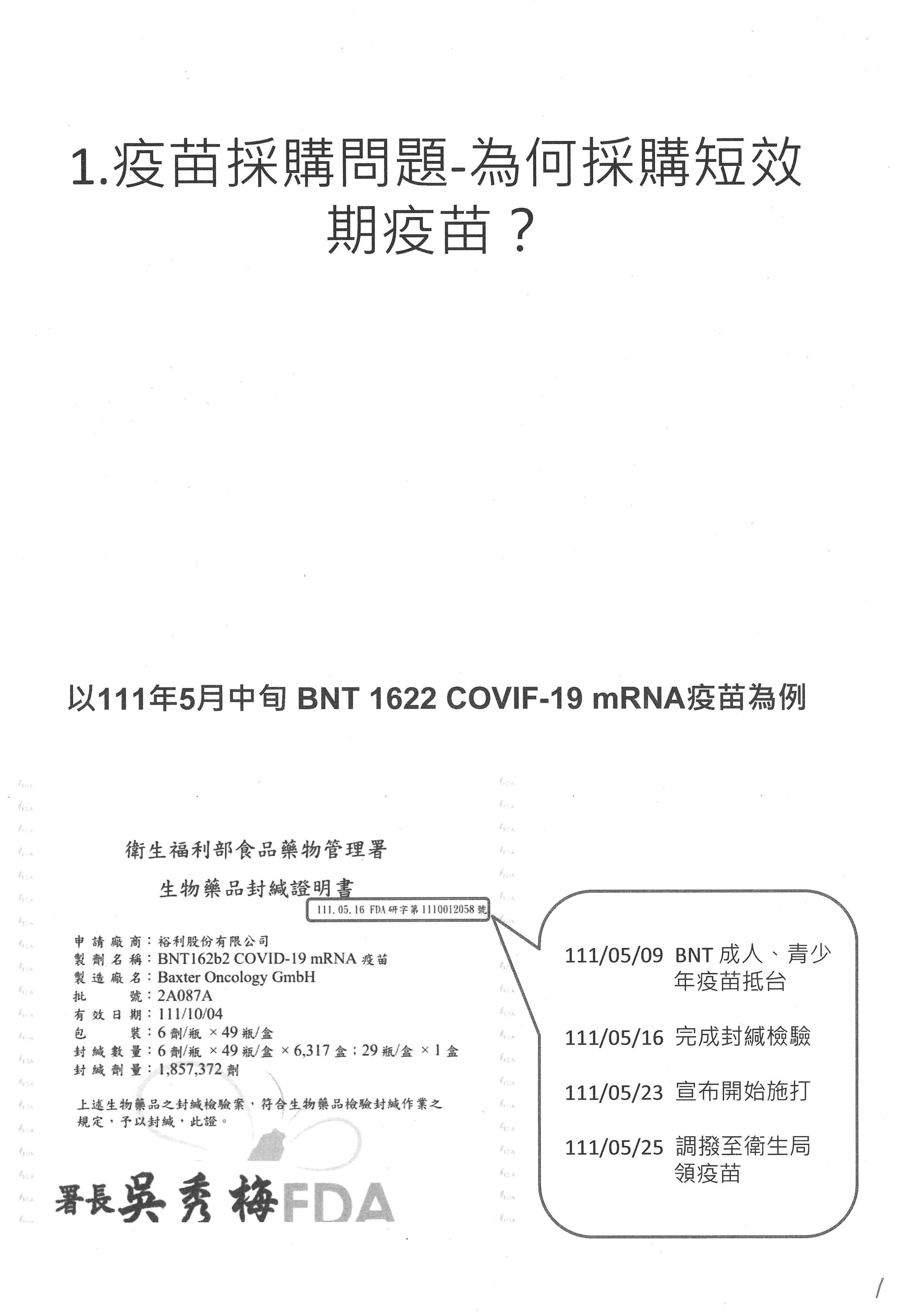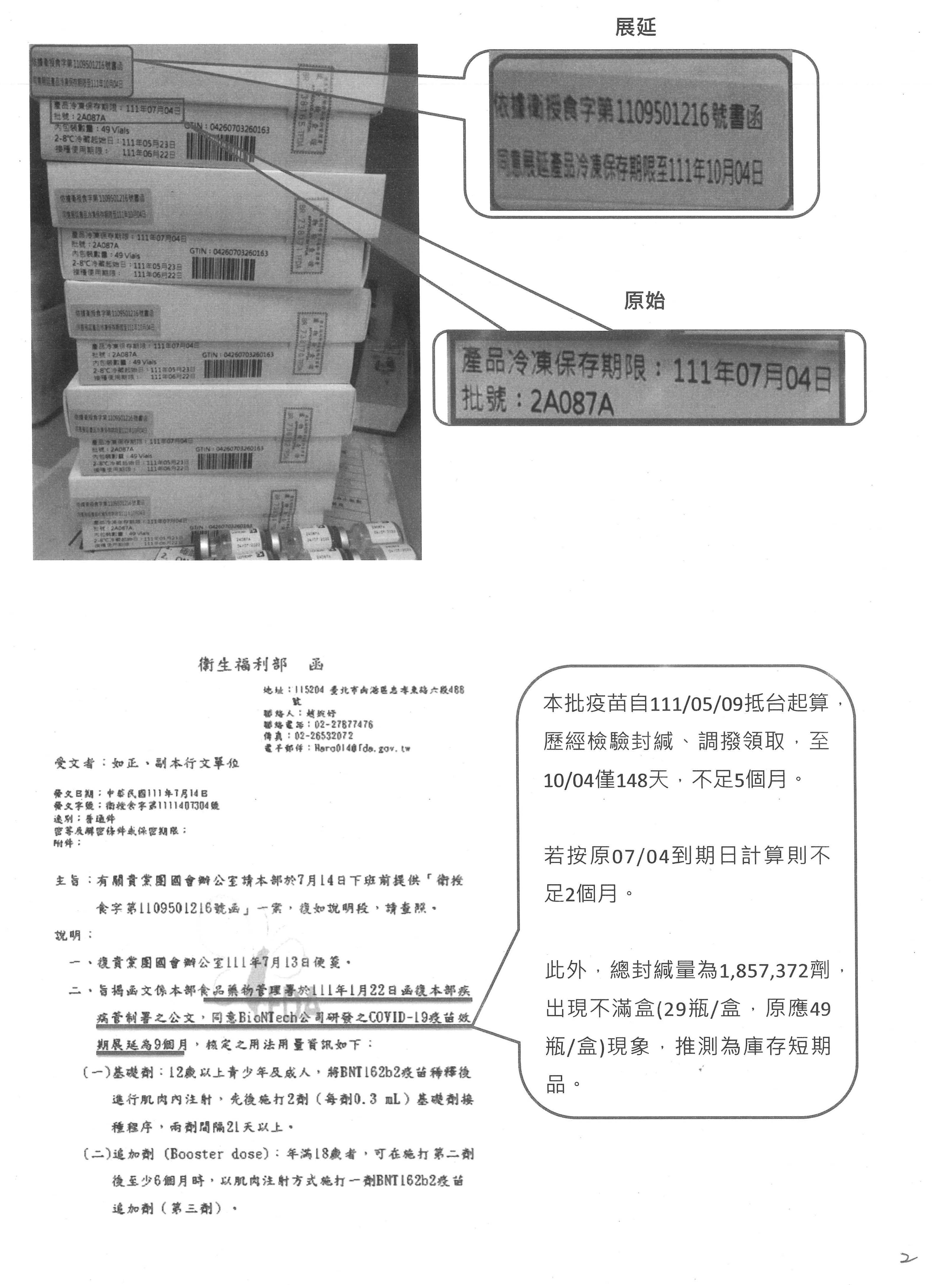 今天回歸到我的報告項目,第一個,食藥署在每一批疫苗進來的時候都有一個封緘證明書,今(111)年在台積電、鴻海還有慈濟所捐贈的疫苗用完之後,當時社會在詢問下一批疫苗在哪裡?因此政府緊急採購,5月9日第一批政府採購的BNT成人及青少年疫苗抵達臺灣,5月16日完成封緘檢驗,5月23日宣布開始施打,調撥至衛生局領到疫苗的時候是5月25日。請各位看一下包裝疫苗的盒子,這些都是護理人員告訴我的事情,我在反映護理人員的問題,他們在上面看到一個粉紅色的標籤寫著「依據衛授食字第1109501216號書函」,同意將這批疫苗的冷凍保存期限從原本的7月4日直接展延到10月4日。有很多診所沒有拿到這個紙盒,因為它打的劑量少,因此拿到的是一瓶一瓶的,在瓶身上沒有看到紅色標籤,所以當天我就接到很多診所醫師的詢問電話,說看到上面冷凍保存期限是到7月4日,效期是不是到7月4日而已?我指的是瓶身,他們因為沒有紙盒,所以看不到這個粉紅色標籤,這個粉紅色標籤引發的爭議是什麼?就是為什麼在一開始封緘檢驗的時候,就直接展延它的冷凍保存期限三個月的時間?從5月25日、5月26日醫院拿到疫苗開始計算,如果到原本的期限7月4日,其實不足兩個月;依照這個粉紅色標籤延長到10月4日,仍然只有148天,冷凍保存期限不足五個月。