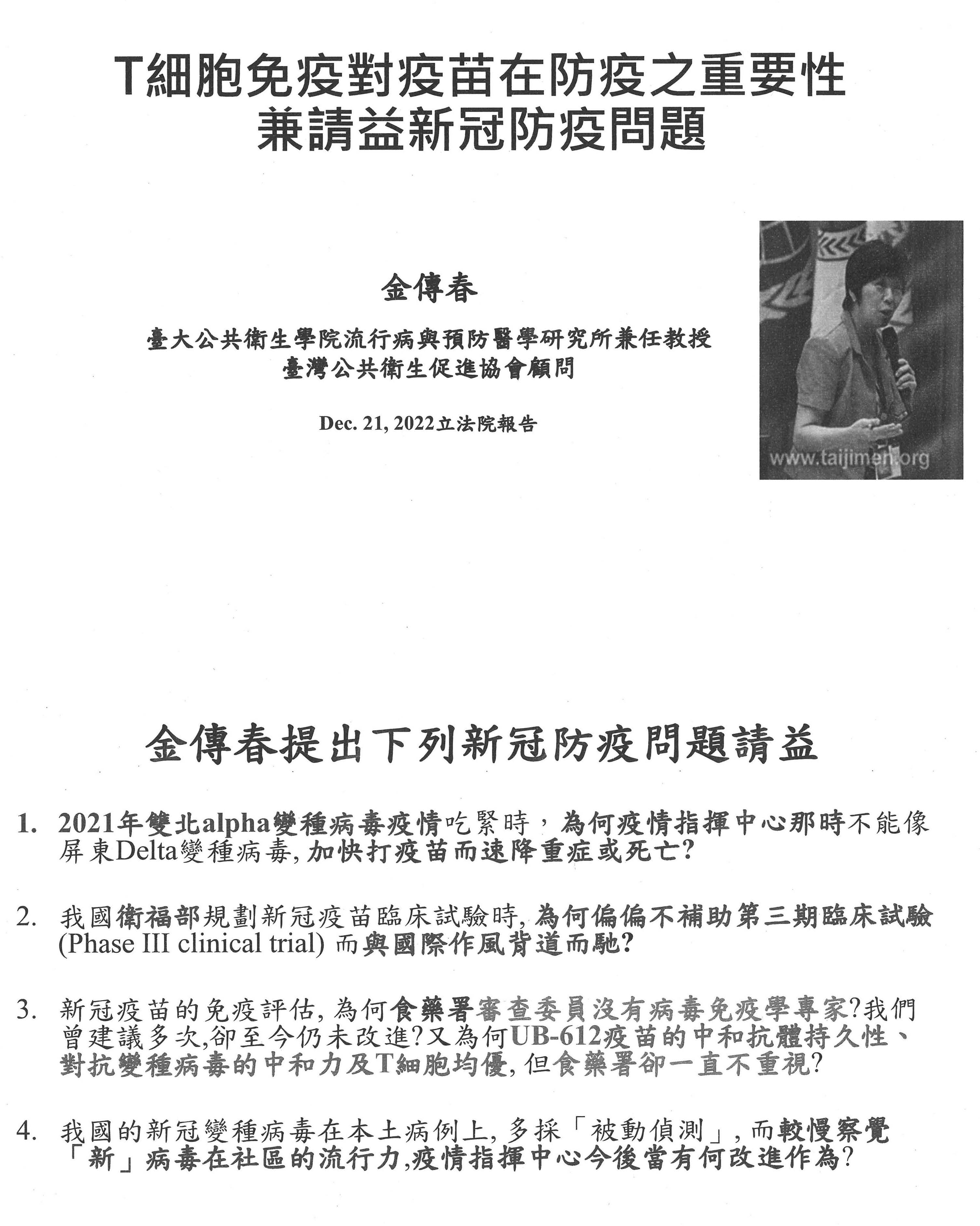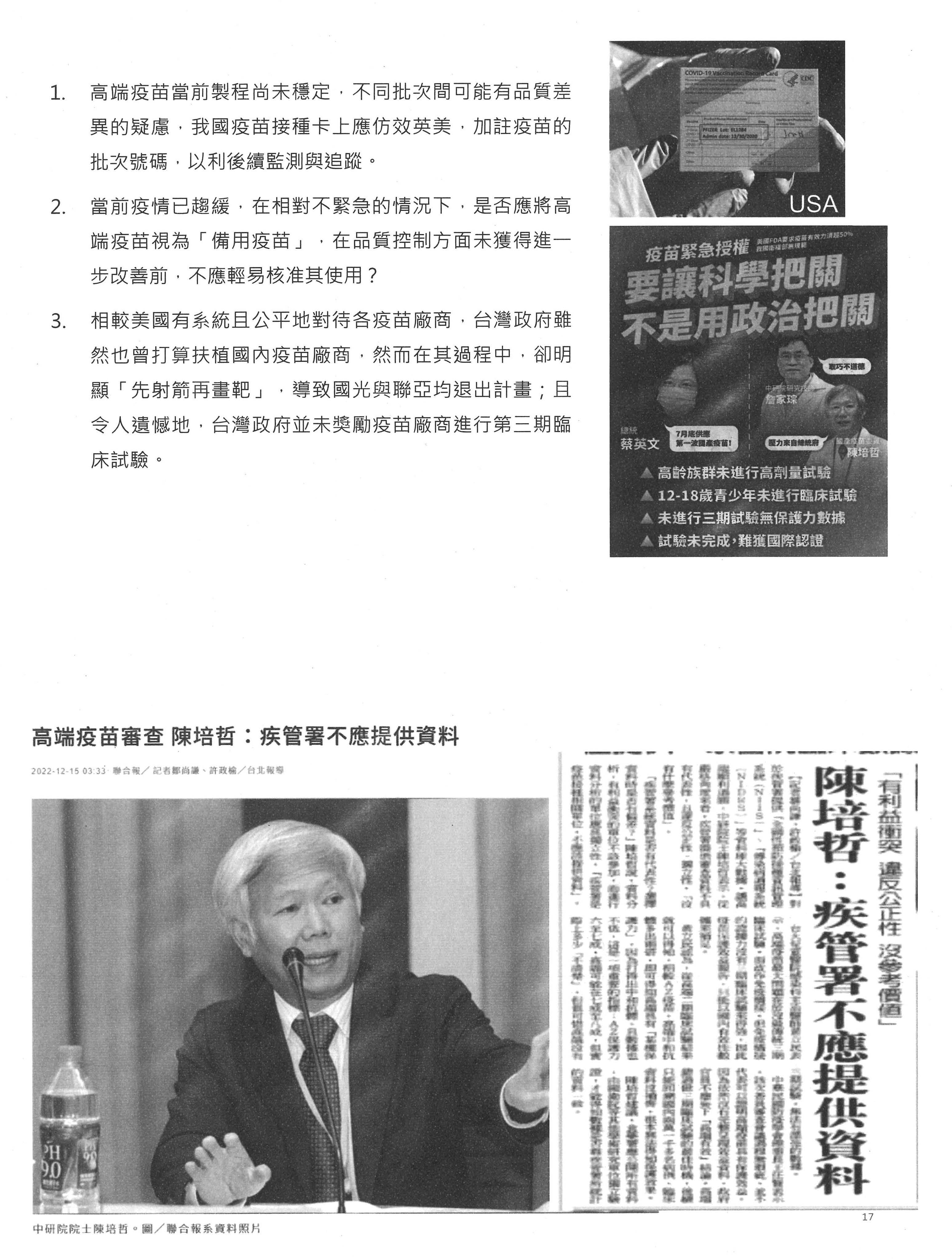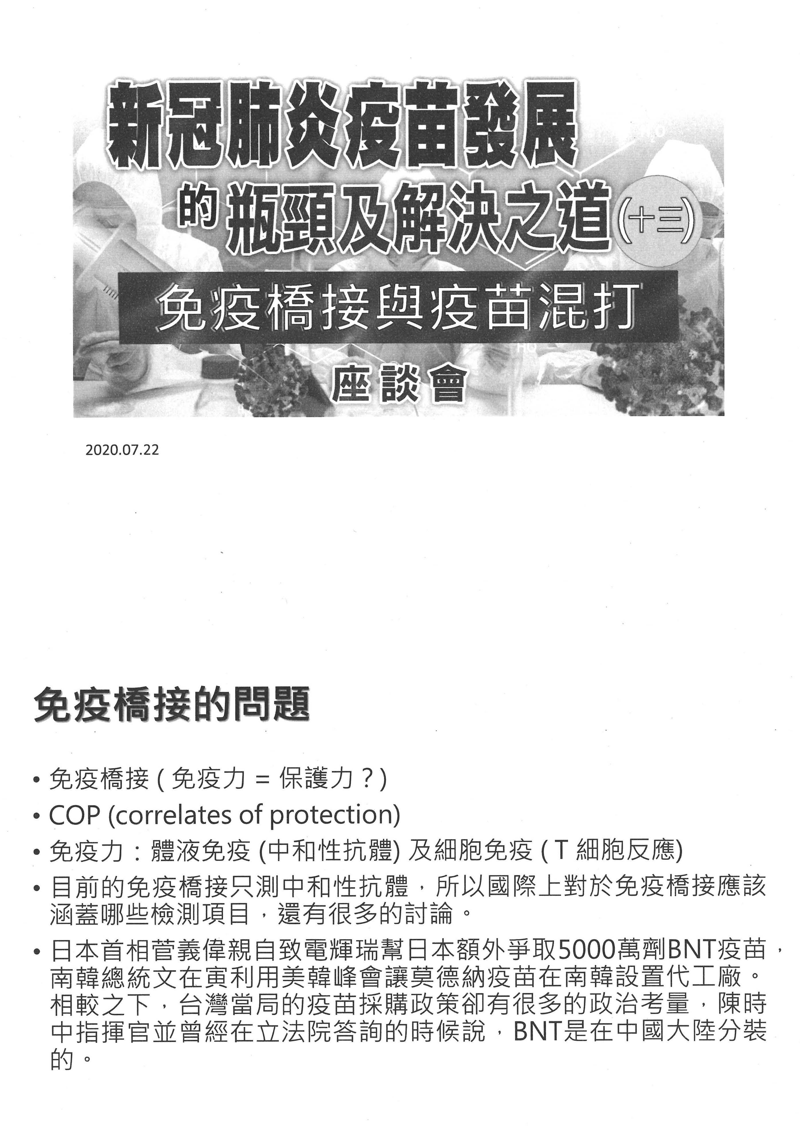 另外,我要講一下關於疫苗部分,因為我們今天是在檢討跟回顧。過去本人在國民黨智庫擔任永續發展組的召集人,所以我們總共開了30場「新冠肺炎疫苗發展的瓶頸及解決之道」座談會,如果大家有興趣,可以回頭去看,這些全部都在網站上可以看到。其中有一場我要特別提到,是在2020年7月22日,就是開始要審疫苗的時候,關於免疫橋接跟混打的問題,我要稍微講一下,因為在這場座談會裡面,我們提醒CDE官員與TFDA官員注意的就是關於國際接軌的問題,今天在場很多先進也都提到,首先就是要與國際接軌。其實剛剛在講VCIP問題時也一樣,我們覺得很重要的就是他山之石、與國際接軌,可是顯然都忽略了這個部分。我們看到的情況是國外根本沒有使用免疫橋接,無論針對新冠肺炎病毒或疫苗,都沒有依照這樣的途徑給予EUA,只有臺灣地區開始用了免疫橋接的方法,這就是為什麼要注意他山之石,一定要了解整體的國際審查情勢。當然,免疫橋接自有很多討論,大家討論的就是correlates of protection(COP),也就是哪一些免疫標記是可以與疫苗防護力劃上等號的;換句話說,如果不做三期,只做二期,並且要用免疫橋接這個方法的話,指標如果搞不定,只用一個中和性抗體視為有相當保護力,其實是不智的,也是不恰當的,現在已有很多相關資訊。當然這是事後諸葛,但我們也一樣看到了,免疫力其實就來自B cell與T cell,T cell的細胞免疫力在這次整個疫苗防護力上顯然應該扮演更重要的角色。但CDE官員在制訂辦法時其實並未要求疫苗廠必須提供這方面的資料,雖然他們可能也有做部分的資料。