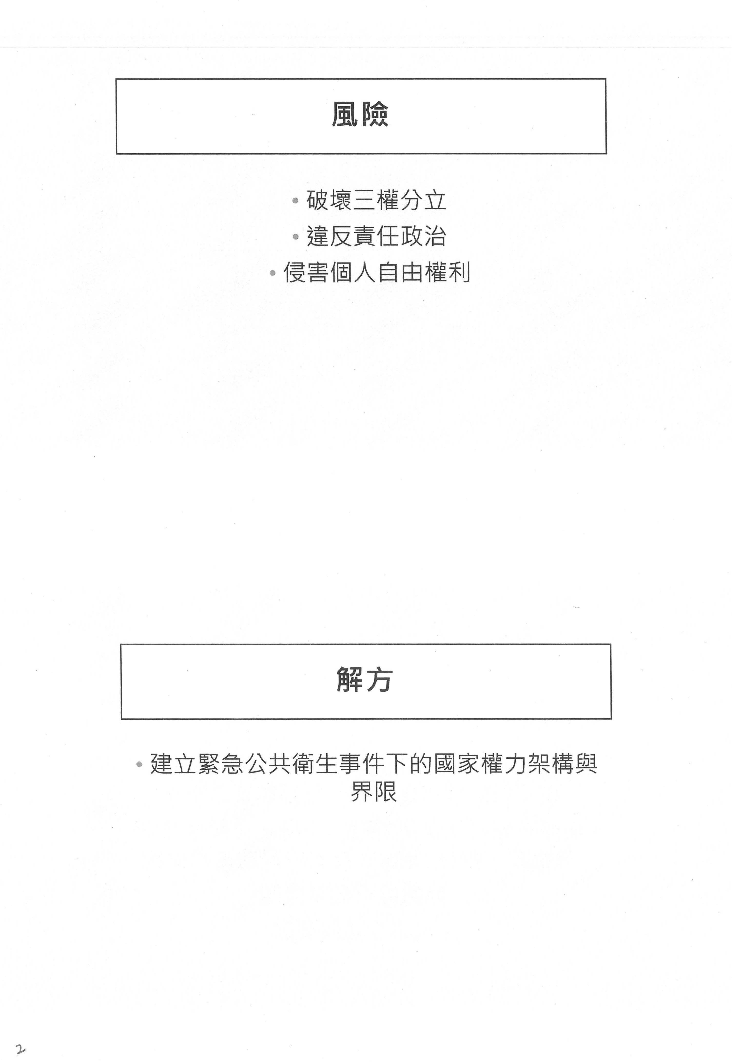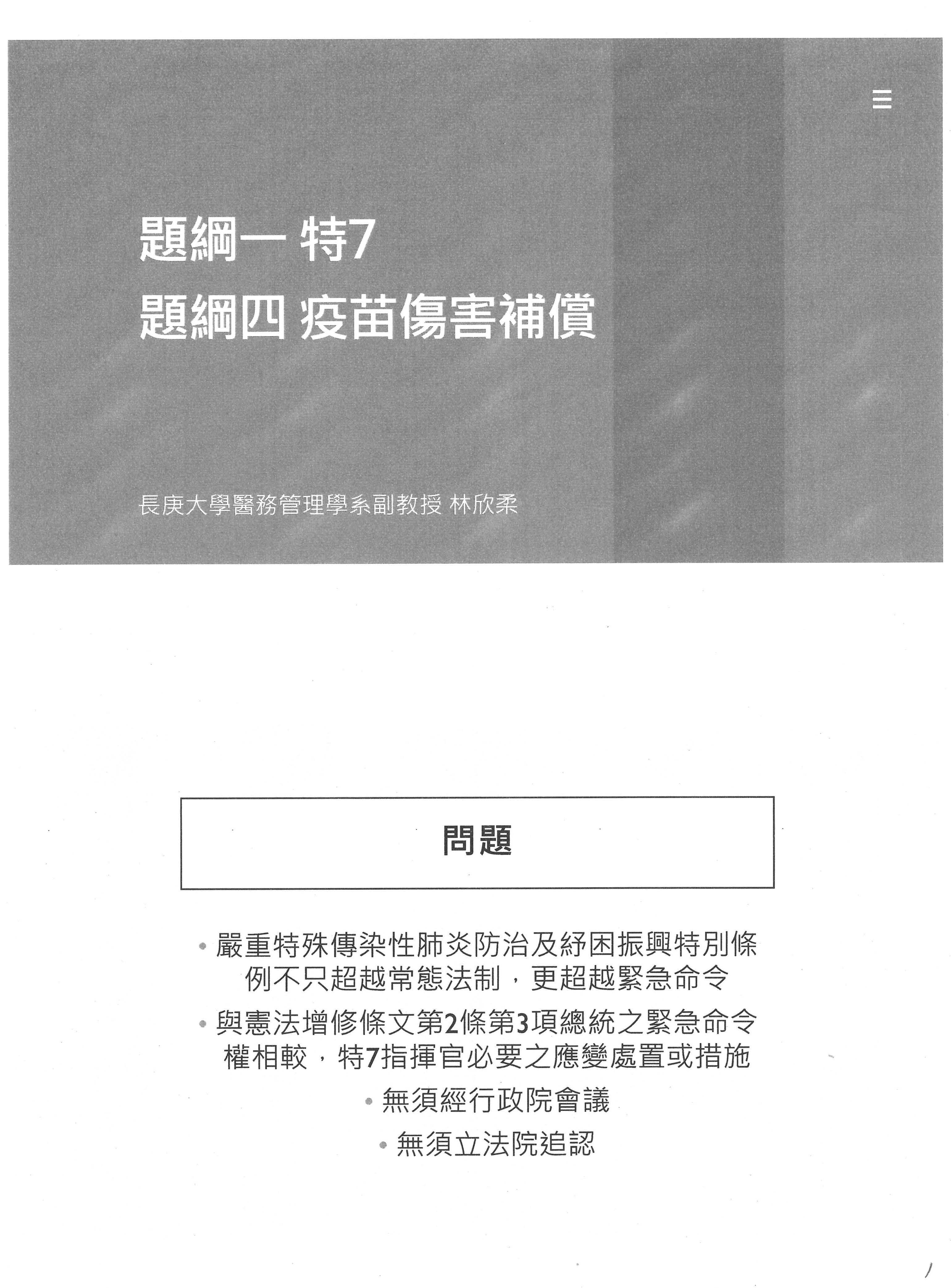因為受限於我的研究專長,我今天沒有辦法就所有的提綱表示意見,也受限於時間,那麼我就挑了提綱一和提綱四來跟大家分享我的想法。提綱一是有關於特別條例第七條,大家對於特七的意見已經很多了,這三年批評特七的文章已經不計其數,所以它有問題我們都知道,那簡單說它的問題在哪裡呢?它的問題就在於它是一個超越總統的緊急命令的緊急法制,換言之,跟總統的緊急命令比起來,這個特別條例的問題在於:它創造了一個不需要經過行政院會議通過也不需要再經過立法院追認的一個power、一個權力,所以這個是在法制上面,立法院創造出來的法律帶來的問題。那風險是什麼?風險就是它會破壞我們憲法上面想要節制政府權力的三權分立制度,那麼它也破壞了我們的責任政治,也會有侵害個人自由權利的風險,所以特七的問題跟風險,我想大家應該都可以很清楚地瞭解。