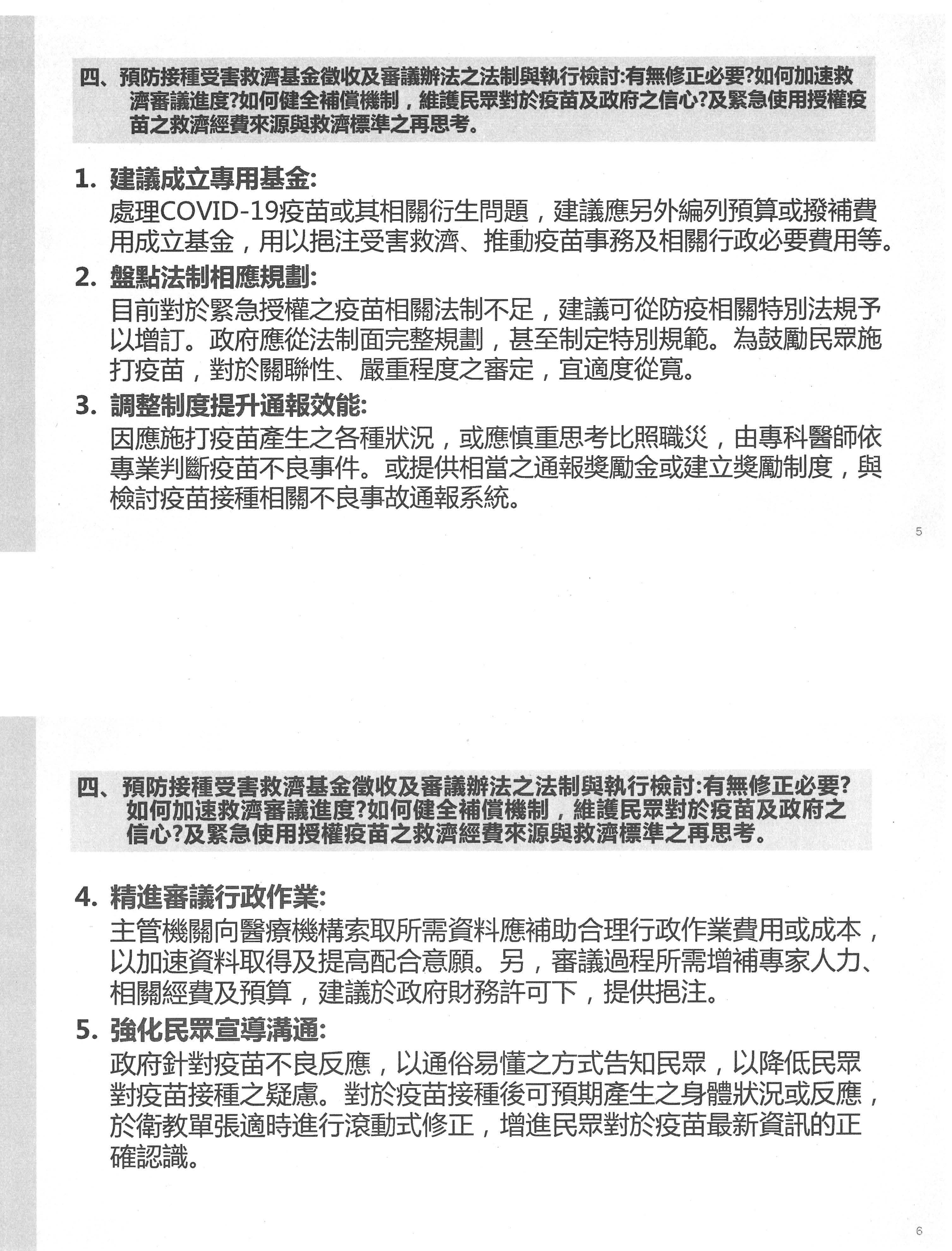 討論提綱四、預防接種受害救濟基金徵收及審議辦法之法制與執行檢討:有無修正必要?如何加速救濟審議進度?如何健全補償機制,維護民眾對於疫苗及政府之信心?及緊急使用授權(Emergency Use Authorization, EUA)疫苗之救濟經費來源與救濟標準之再思考。
