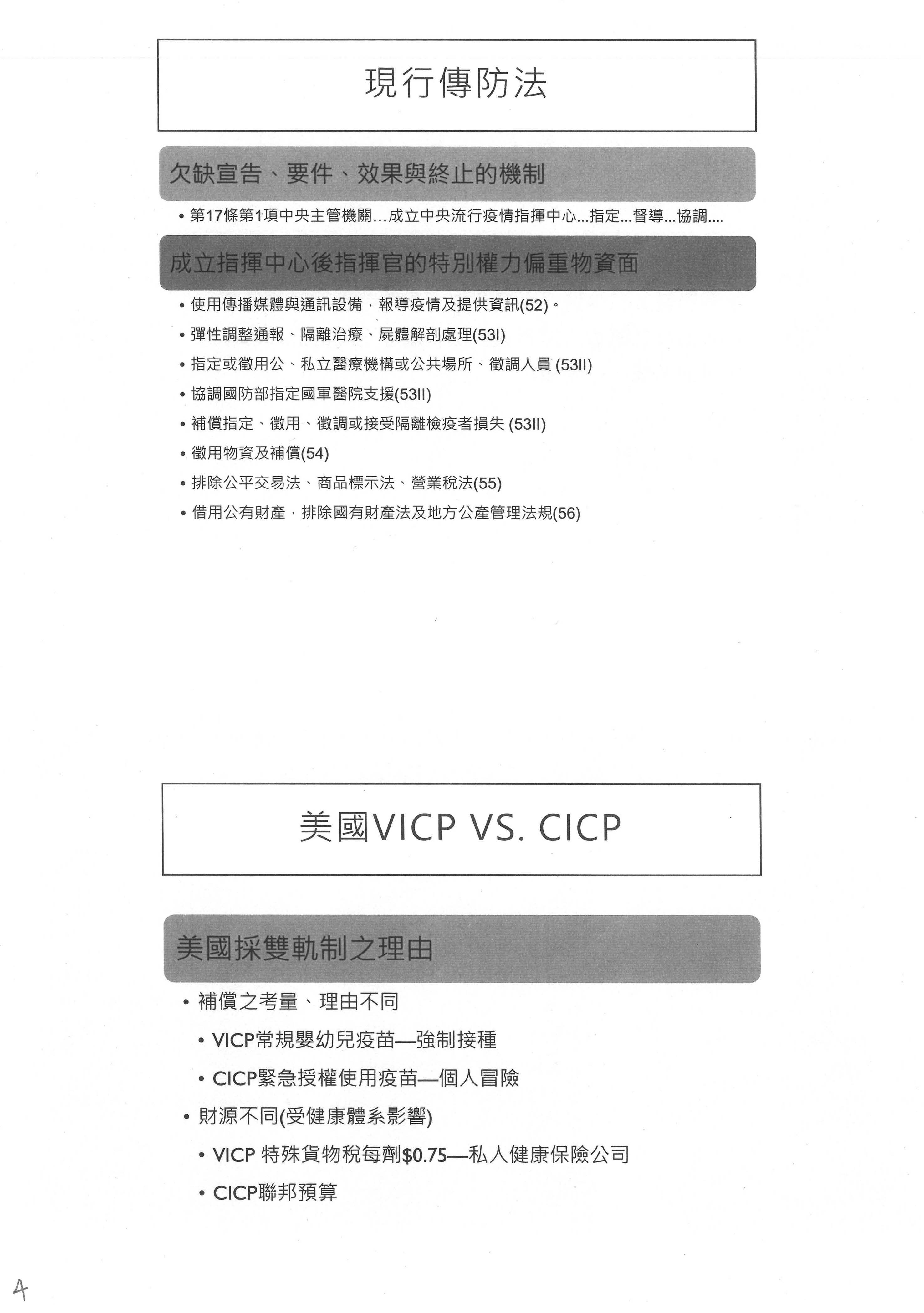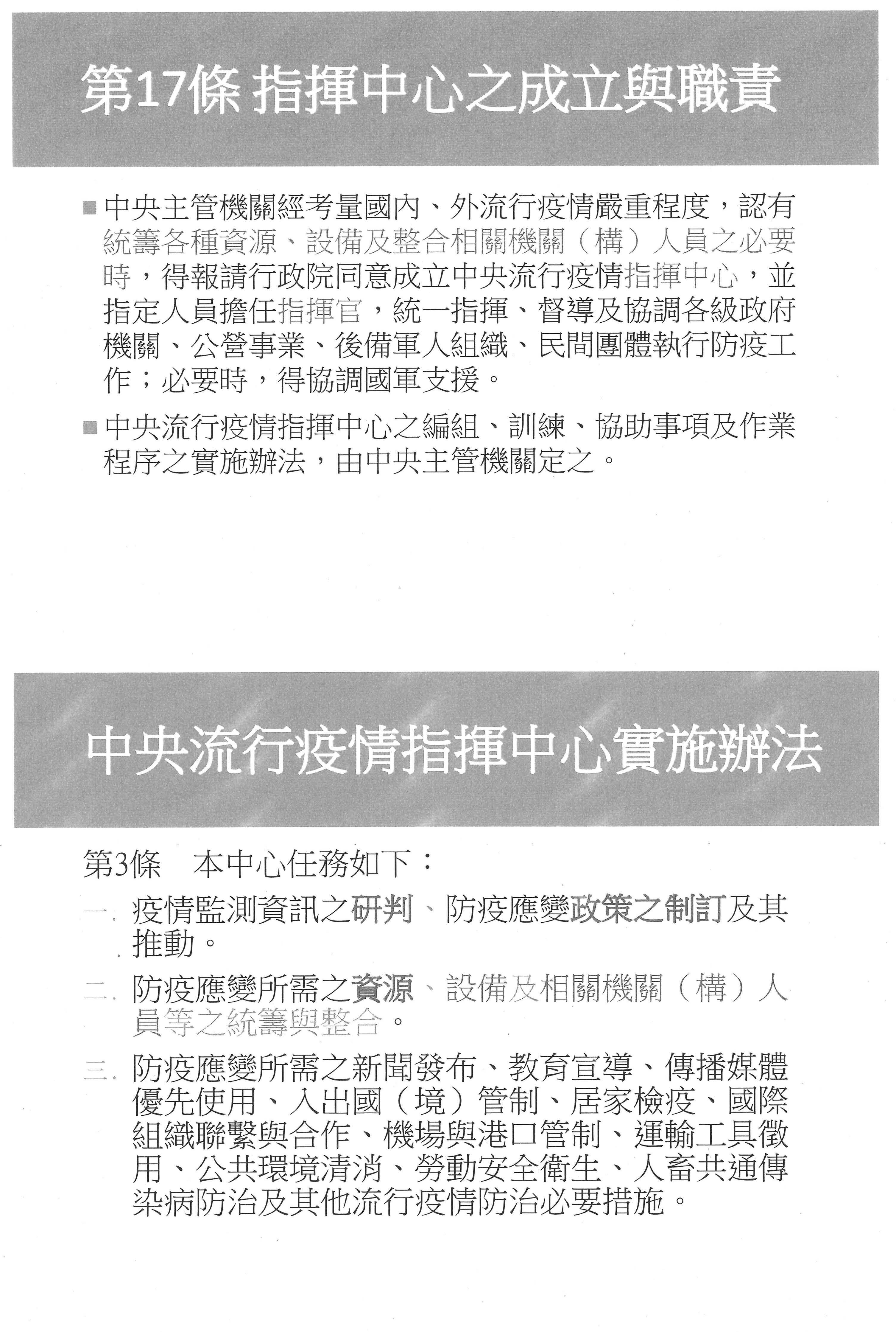 目前我們看到傳染病防治法底下,或者是特別條例底下,與國外的法制比起來的話,可能比較欠缺的是我們在事件前、事件中還有後面怎麼結束,這件事情在規範上是比較不清楚的,因為我們看到現行的傳防法,我們有成立指揮中心的機制,但是成立指揮中心之後的效果是什麼?它的權力範圍到哪裡?在指揮中心之下,人民的自由權利又如何獲得保護?這個是現在傳防法裡面比較欠缺的。其實傳防法在SARS之後經歷過很大的調整,也賦予指揮官一些特別的權力,不過我們看到傳防法還是偏重物資面,比如說他可以徵調公共場所啦!人員啦!醫院啦!然後有一些法律的排除啦!這些都偏重在財產面,所以接下來要討論的問題是:對於人的措施的部分,我們怎麼樣去調整與因應?