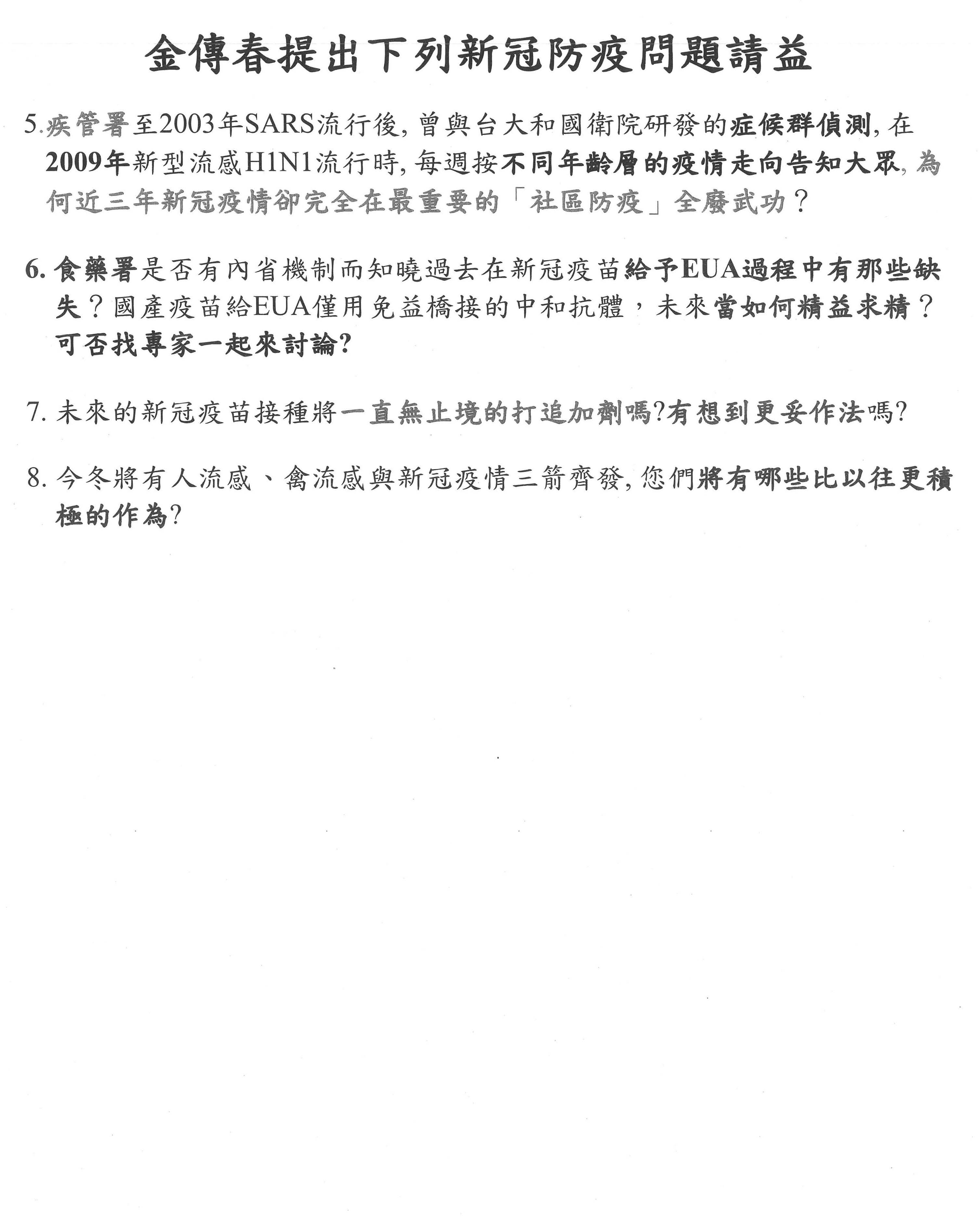 因為時間關係,我再重複說明,我們會把所有問題都記錄下來,好好探討。最後,我引用陳宜民教授的話,防疫還是要本於專業跟科學,以人民的福祉為出發點,避免政治口水。我們會與大家共勉,謝謝大家。