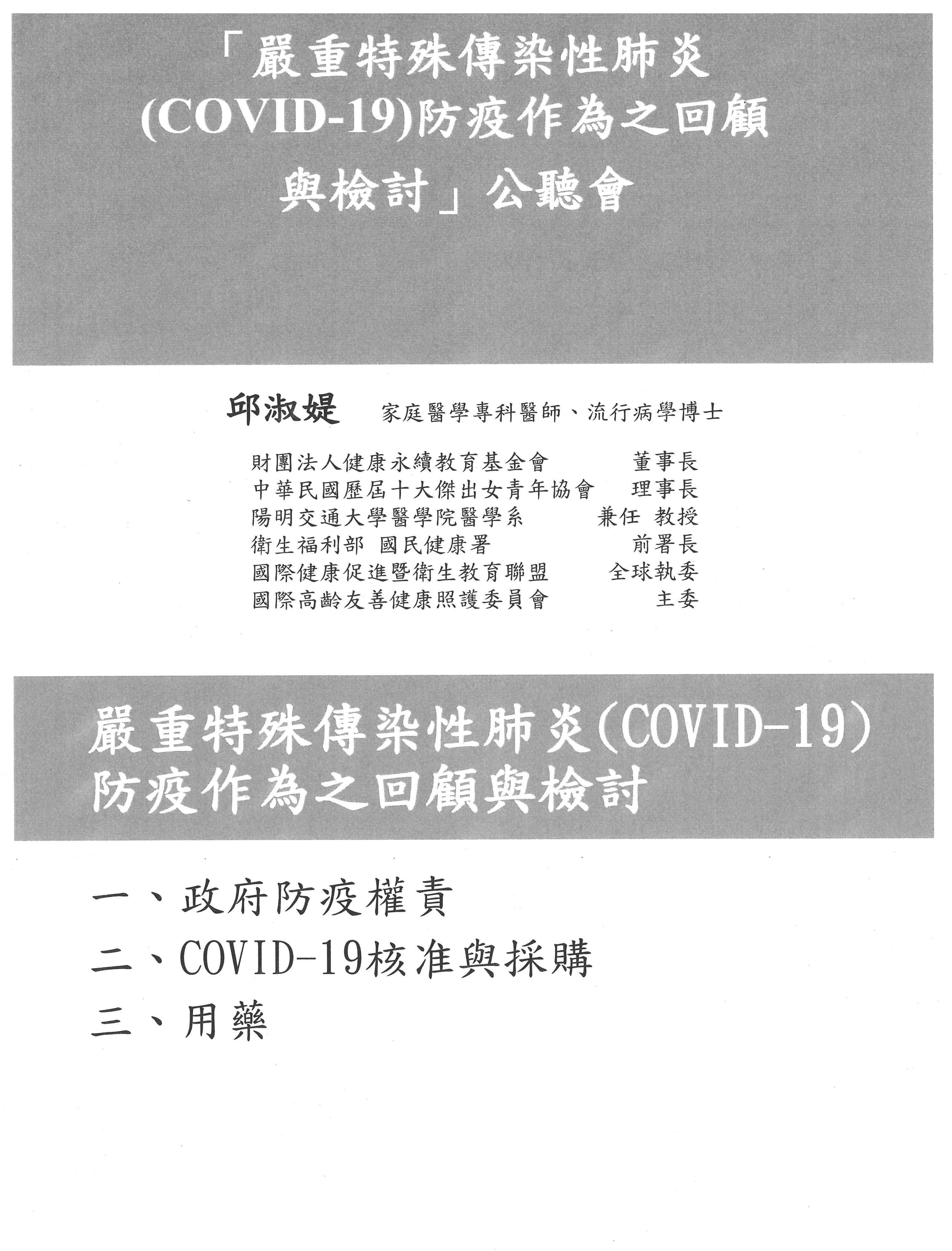 立法院第10屆第6會期社會福利及衛生環境委員會舉行「嚴重特殊傳染性肺炎(COVID-19)防疫作為之回顧與檢討」公聽會會議紀錄