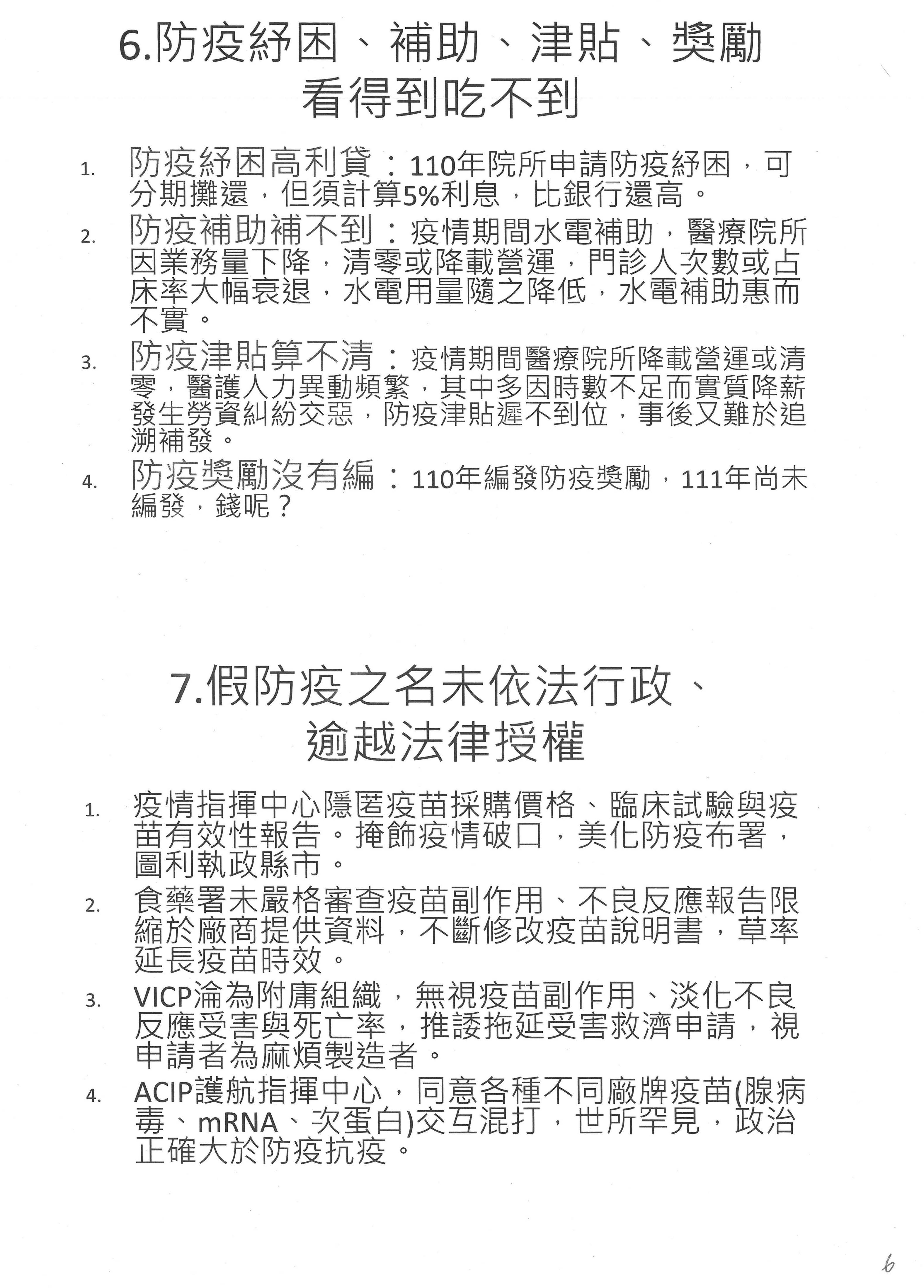 再來談防疫紓困補助津貼,我的書面資料有講,剛才前面也有專家提到,醫院紓困分期貸款最後被告知要還5%利息。至於水電補助,醫院都已經被清空了、降載營運了,當月水電使用最低量的時候,水電補助是惠而不實的作法。此外,防疫津貼算不清,人員都已經離職,甚至他們已經去勞工局投訴醫院。最後津貼下來,剛才部長報告是109年7月起,但是各位看,醫院收到預撥款,應於一週內核撥實際執行人員,但後來撥款是110年,中間已經差了5、6個月的時間。110年有編列防疫獎勵,111年到現在沒有編列,據說明年大家可能要慢慢等。