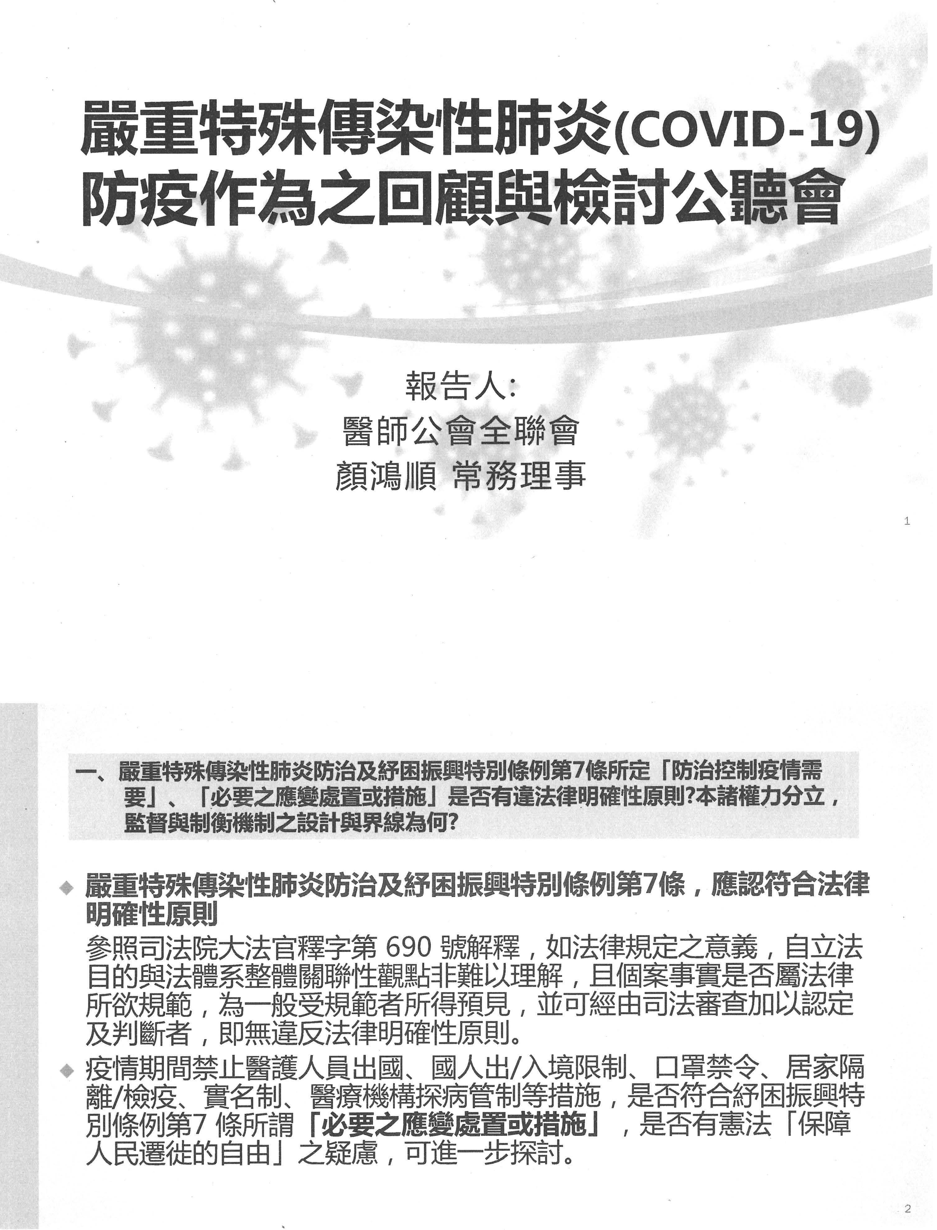 陳信儒醫師:各位在座的委員、專家學者以及官員們大家好。很榮幸能夠接受這個邀請來參與這一次COVID-19疫後檢討的公聽會,臺北市職業醫師工會想要針對一些議題作出一些的意見。首先是剛才滿多人都有提到的,醫療人員在疫情剛開始的時候就有受到一些限制,不管是出國或是什麼樣相關議題,前面也有很多專家學者討論到,有人認為沒有法源依據,到後來也是有人認為那個備受爭議的第七條其實就是它的法源依據,可是有法源依據之後,又有比例原則的問題。不過在這裡醫師職業工會要特別提出來的是,其實這個問題在記者會上,有人問過指揮中心醫護人員出國禁令是否取消,那時候的回答是,其實早在2020年7月1日就已經發函取消醫療人員出國禁令,但是這裡面有提到的是,這部分比較少人注意到,其實那時候也附帶發了一個出國的規定,出國規定裡面有個但書提到「醫護人員如果出國,必須報經雇主同意的狀況之下,他就可以出國」。其實這裡就再出現了一個問題,難道我們政府對於我們特定族群基本權的干預,可以用這樣一個授權很不明確的方式,授權給醫院單位嗎?而且醫院它本身並不一定是公家醫院,像現在如果疫情趨緩了,疫情趨緩之後,這個規定其實並沒有終止,它並沒有特別的終止,它甚至不是一個法令,可是後續就發現在疫情趨緩之後,我們有部分的會員,反映他們醫院訂定許多相關的出國限制,這個出國限制的法源依據,到底是不是根據當初指揮中心訂定的這一個「醫院因應嚴重特殊傳染性肺炎(COVID-19)人員出國規定」的規定呢?如果是,事後我們醫護人員、醫療人員需要採取救濟,是要跟醫院打民事訴訟官司?還是要採取一個救濟的程序?這個部分我們想再提出來,因為其中有很多細節可以凸顯政府在干涉醫療人員的基本權方面,其實缺乏妥善的法制觀念以及一個主管機關應該負擔起的責任。我們都知道醫療人員在特殊狀況下有其公共性,有關醫療量能的部分,在某些疫情、戰爭或是災害下有其公共性,且醫療人員絕對不是自私自利、對於國家危難置身事外的。我想臺灣是一個法治國家,對於人民基本權的干預還是必須遵循法律保留原則,並符合比例原則。上述狀況我們想提出來跟主管機關做一個提醒,也希望未來如果真的有相關情事的話,可以再進行通盤考量。