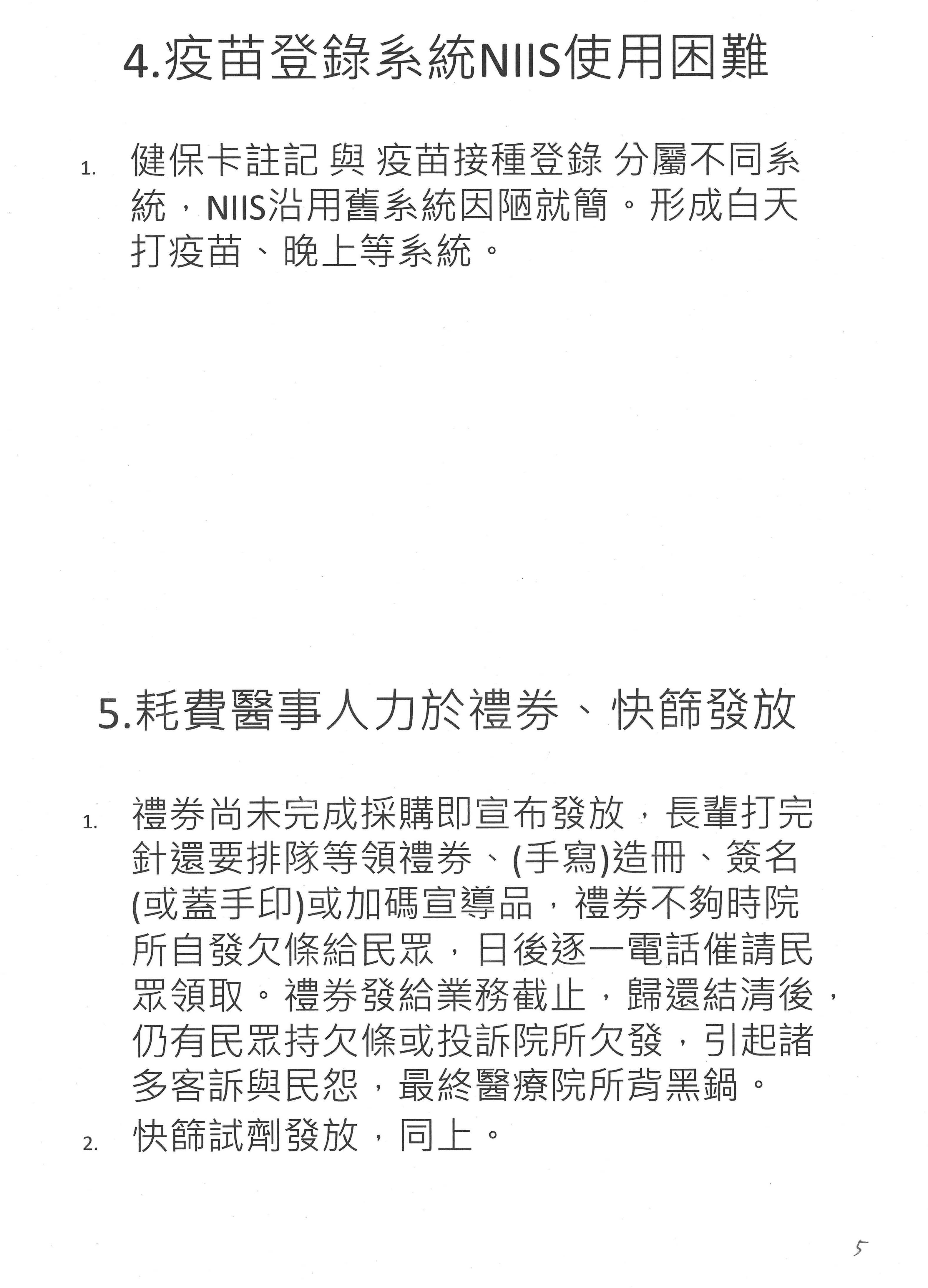 另外,有關疫情指揮中心,剛剛前面的專家們提到價格的問題、臨床實驗以及疫苗有效性報告的問題,還有疫苗破口──美化防疫部署、圖利執政縣市,個人覺得非常嚴重。今年5月份我們在做視訊門診,處理快篩陽即陽的事情時,新北、臺北都還在雲裡、霧裡,對不起,高雄市已經完成教育訓練,他們統統非常清楚E5200系列的所有醫事代碼是什麼,可是新北、雙北統統都不知道、看不懂。