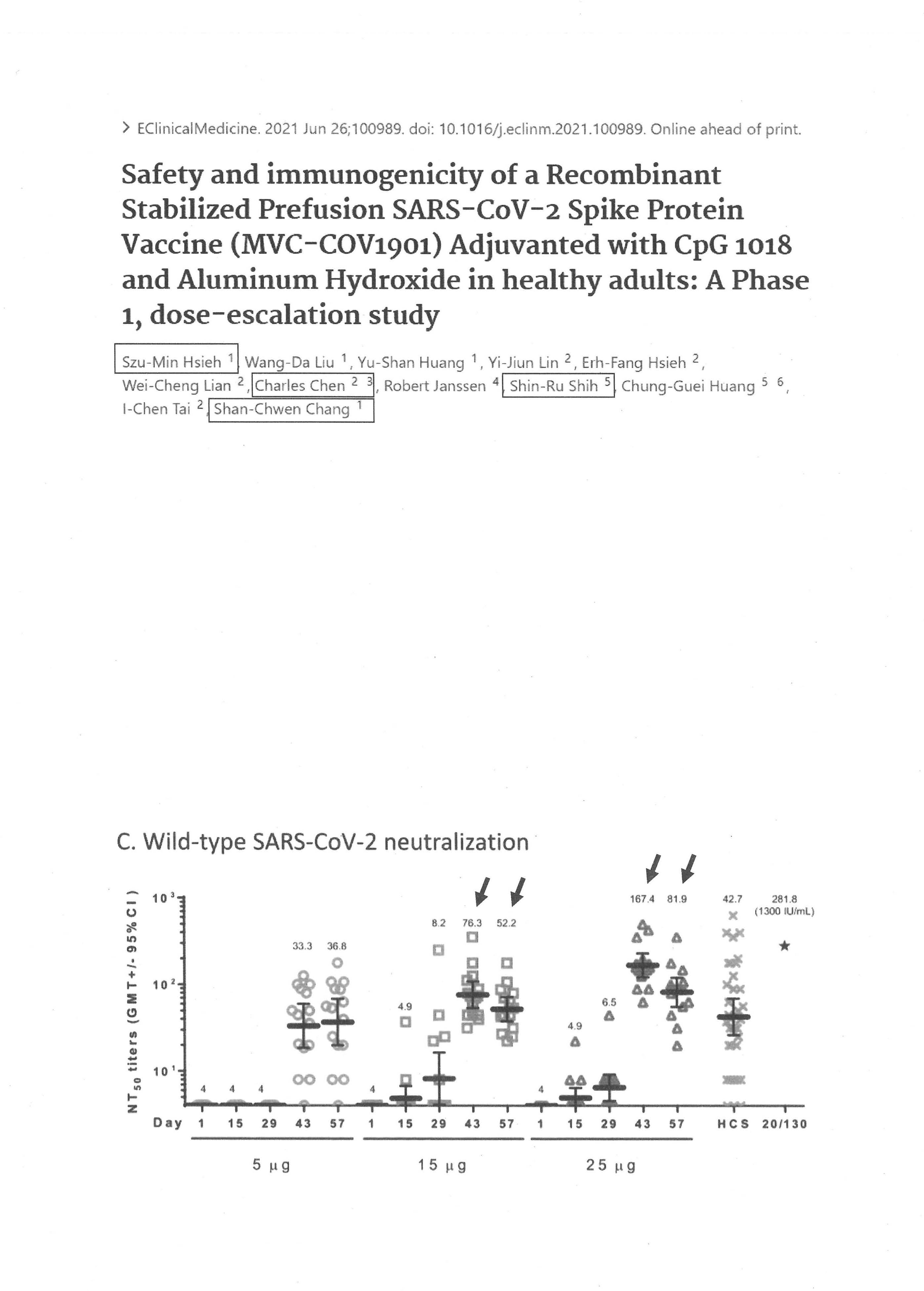 另外一個問題就是疫苗選擇問題。這是已發表的論文,第一作者是臺大醫院謝思民醫師,內容是高端第一期臨床試驗的結果。我只提醒各位,在第一期結果中,總共用了3種劑量,以決定第二期要以什麼劑量為最佳劑量。所用3種劑量分別是5μg、15μg與25μg,結果大家看到什麼?高劑量的25μg打出來的疫苗效價是15μg的兩倍以上。這裡可以看到,在接種疫苗之後43天,15μg的效價只有76.3 titers,但在25μg也就是高劑量的效價是167.4 titers,足足高了兩倍。但後來做二期試驗時,大家猜猜高端採用的劑量是中劑量還是高劑量?用的是中劑量,不是用高劑量。高劑量在一期臨床試驗顯示的中和性抗體效價、也就是打出來的效果明明比較好啊!為什麼不用高劑量,要用中劑量呢?衛福部內部檢討文件裡提到了這部分,這其實是國民黨黨團提供的文件,也經過認定是從內部審查官員流出來的資料,內容顯示了是為什麼,就是因為高端疫苗在production要scaling up、也就是大量製造的時候有了瓶頸,做不出大量疫苗提供二期臨床試驗之用,所以就有這樣的compromise妥協,造成的情況則是二期臨床試驗最後不是以最佳疫苗劑量往下做,更不要說沒有做三期,只做了二期免疫橋接,用的疫苗又只有一種中和性抗體的效價,沒有與國際接軌,所以到最後疫苗賣不出去,在國外也拿不到EUA。我想這其實就是制度面需要好好檢討的,因為當初顯然就是因為TFDA與CDE官員在決定要用免疫橋接給疫苗EUA認證時缺乏仔細評估到底有沒有與國際接軌。給了EUA,一年之後要廠商提供的是保護數據,而一年後應該是今年7月要給,但是延了3個月;而且在高端給出來的結果中,在巴拉圭做了一千多人的資料,我們到現在也還沒有看到。當初給EUA時,評審委員曾要求高端必須在未來一年內再進行三期臨床試驗,而且是數千人以上的臨床試驗,以顯示它是值得被肯定的、具有效力的,但是我們還是沒有看到該資料,看到的反而是號稱CDC幫忙用大數據做出來的資料,所以陳培哲院士也批評疾管署其實不該提供這項資料,因為有利益衝突、違反公正性的問題。