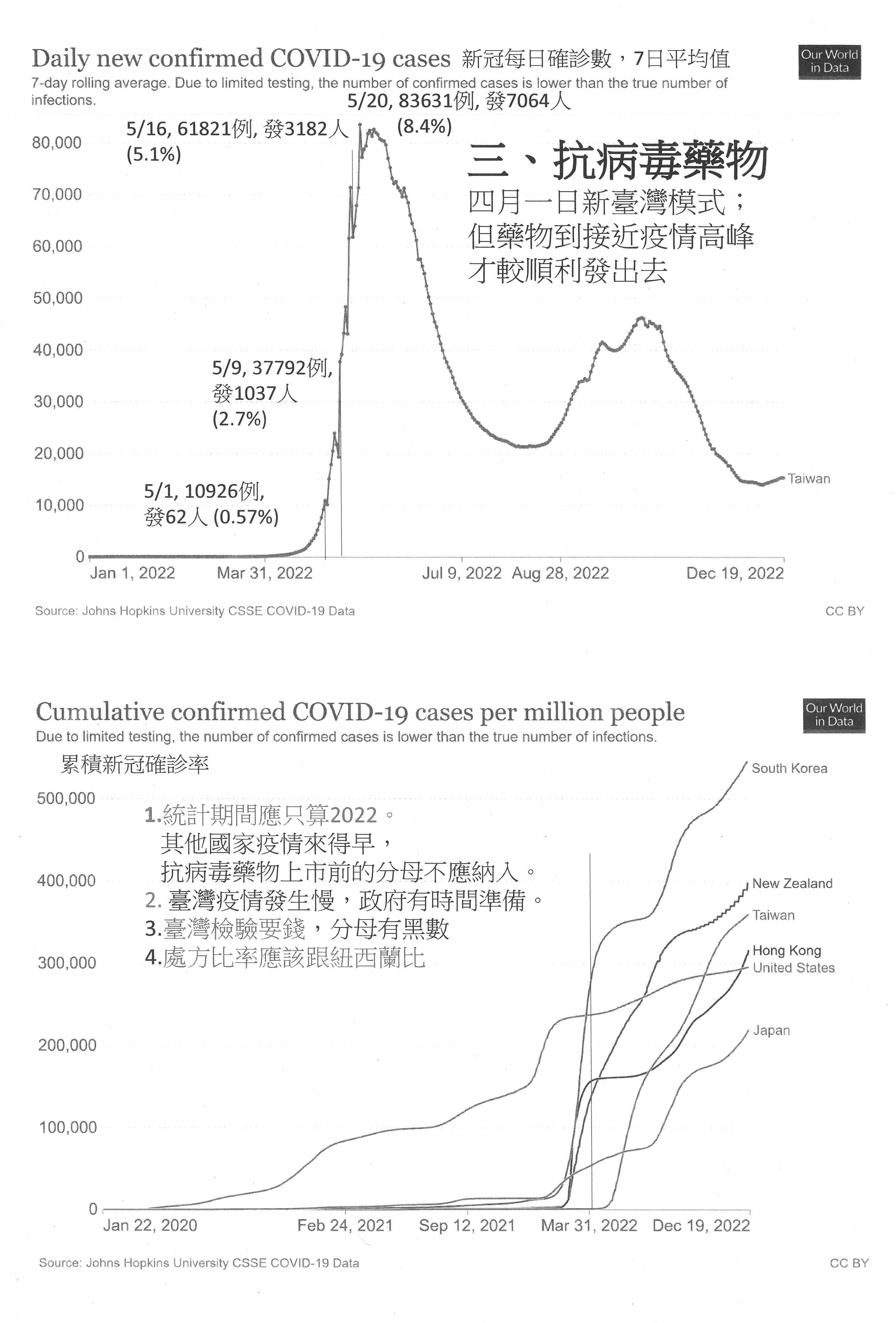 我先提出我個人的狀況,疫情指揮中心在5月下旬曾經公布一個資料,當時發現罹病的確診者死亡率在3天內占了47%,口服抗病毒藥給藥量是非常低的。以5月1日而言,當天Paxlovid只給23劑,Molnupiravir為39劑,當時的規定是所有的用藥,特別是診所的部分,要到中央指定的59家核心藥局,簡單講每個縣市只有兩家,我不知道這個核心藥局有多核心,讓這個用藥不便到極點!