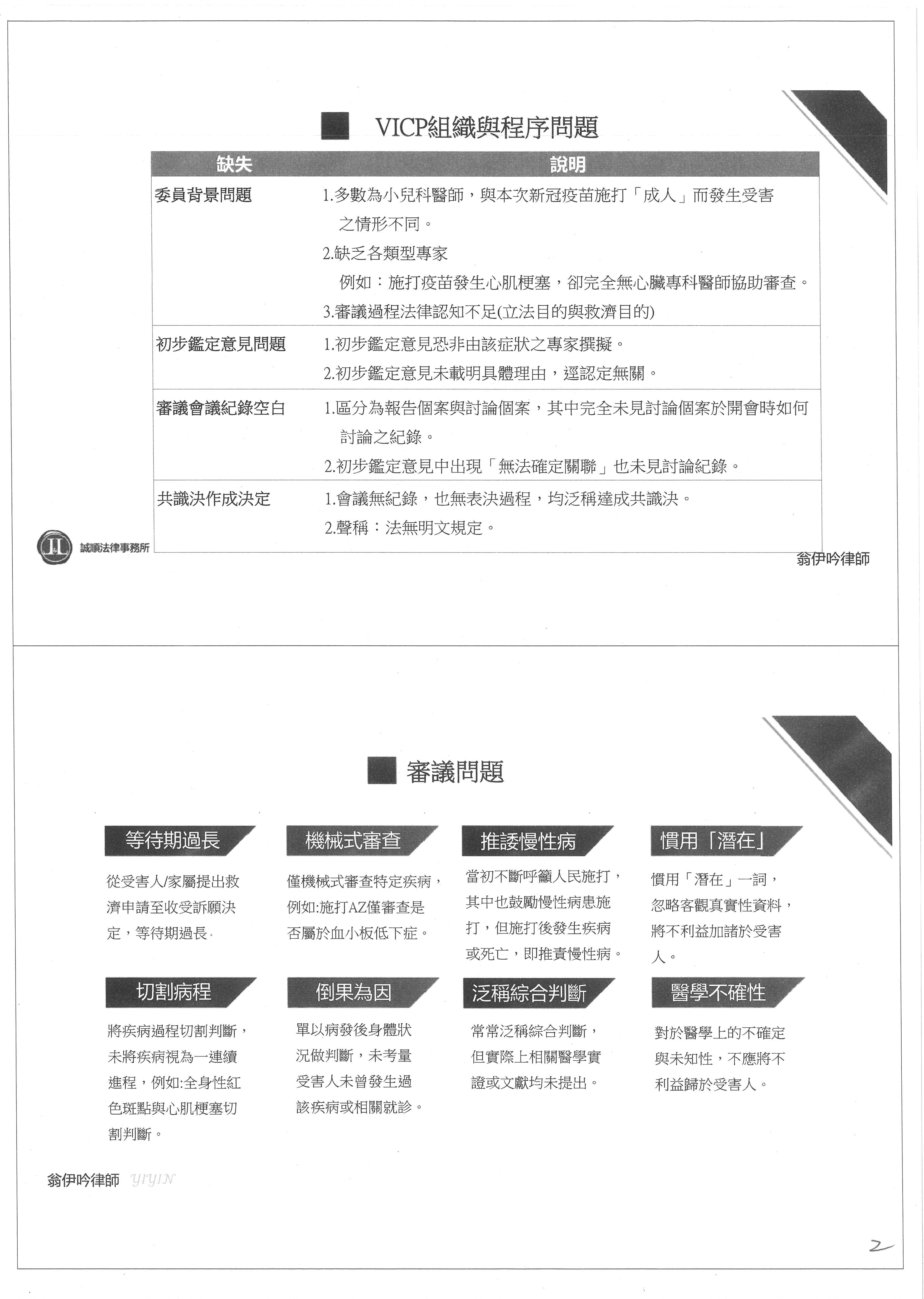 最後簡單提一點VICP和審議過程的相關問題,第一,是等待期過長;第二,是機械式審查,比如AZ,它就審查血小板低下,不會去考量其他因素;第三,當初不斷呼籲人民去施打,也呼籲慢性病者去施打,可是最後發生疾病的時候,就直接推諉到慢性病上;第四,常常慣用「潛在」一詞,我可以很肯定的是,陳先生真的沒有慢性疾病,等我們訴訟終結之後,願意的話,我們也會把資料提供給大家。他們會用「潛在」一詞來說陳先生有慢性病,甚至對造律師在開庭的時候,也說陳先生沒有慢性病但有慢性病史,這種邏輯是非常奇怪的,非常荒謬;第五,是他們會去切割病程,把所有的項目切割成一小段一小段來認定,這樣也是有問題的;第六,是倒果為因,他們不會考量受害人沒有曾經發生過疾病或相關問題,就像陳先生過去沒有任何心臟病史,他們就單純以他發病後的資料來審判,這個審定是有問題的;第七,泛綜合判斷,常常說是綜合判斷作成決定的,可是他們綜合判斷的結果並沒有提出任何醫學實證跟文獻來支持他們的理論;第八,是科學不確定性,這裡就是要講一下VICP其實在審議當時也有其侷限性,他們不瞭解實際上那99塊未知的拼圖長什麼樣子,可是如果他們不知道這99塊拼圖長什麼樣子,就應該要予以寬鬆認定,但他們不是,而是把科學不確定性的不利加諸在受害人身上,我認為這樣是不妥的。以上就是我的說明,謝謝。