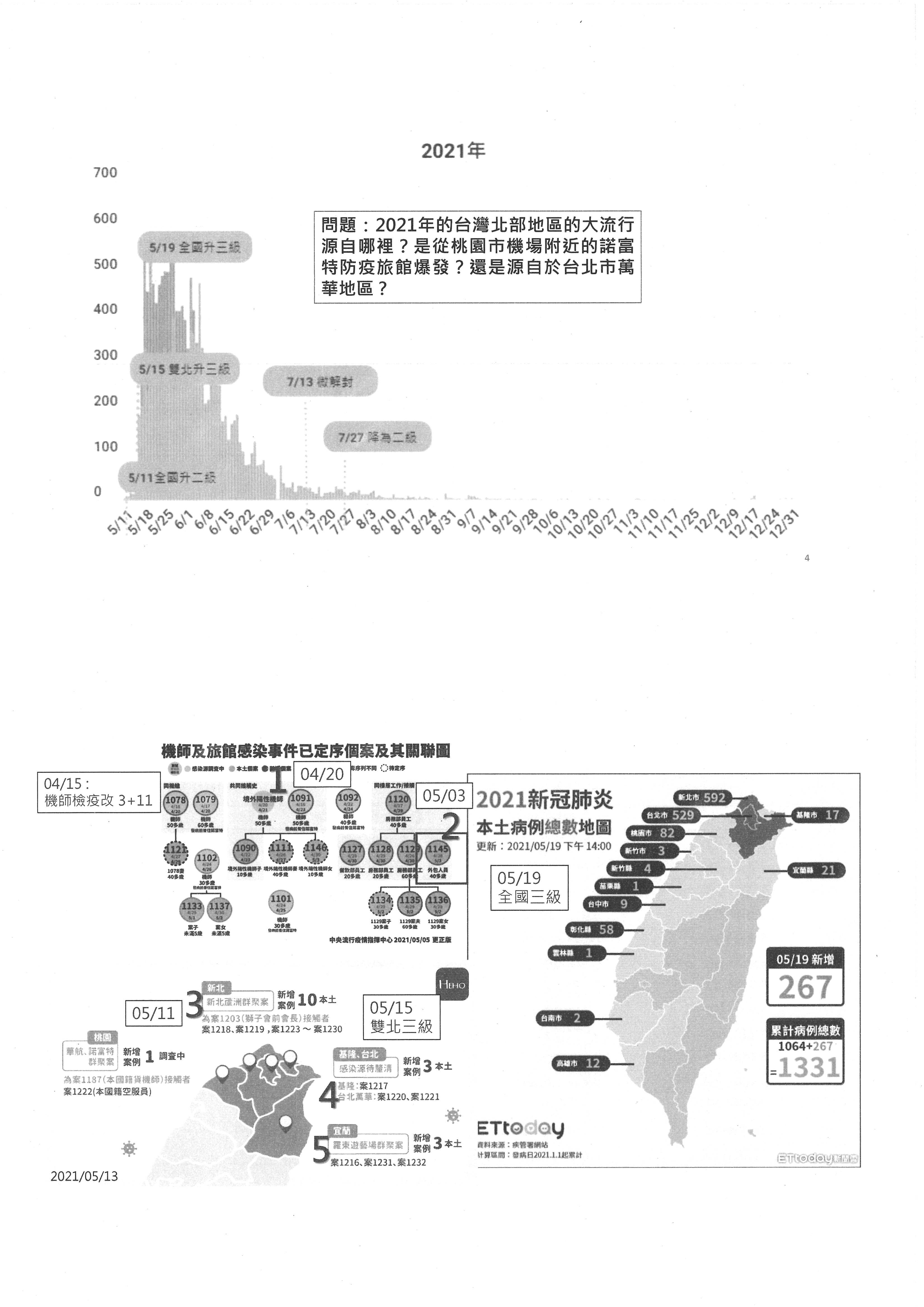 這是從過去三年COVID-19基因演化樹分析不同的變異株呈現的一個狀況,大家可以看到其實是有很多不同的變異株在流行,而且從武漢病毒株、Alpha、Beta、Delta、Gamma、Omicron這樣在流行,目前主要的流行病毒株就是BA.5。我們從2020年3月開始到現在2022年年底整個臺灣每百萬人口流行的趨勢,可以看到最近從5月開始有一波大流行,當然我們知道在整個過程中,2022年這波的流行已經有輕症化的趨勢,但是我們重點要問的是,2021年臺灣北部地區的大流行是源自哪裡?其實有點莫衷一是。很多人覺得是從桃園機場附近的諾富特防疫旅館爆發,但是也有一些人說是來自於萬華。我們先給大家複習一下,這是過去疫情指揮中心發布的案例資料,媒體也都有做了一些圖卡,大家可以看到,其實從2021年4月15日機師的防疫改成「3+11」之後,馬上就開始看到貨機機師有一些確診個案。這邊提醒一下,1078、1079定序個案是從美國回來的貨機機師,他們入住諾富特,之後就看到諾富特在5月3日有很多員工都發病了,到5月中的時候,開始陸陸續續在蘆洲跟萬華、甚至基隆出現病例,最後變成全國大流行的狀況。