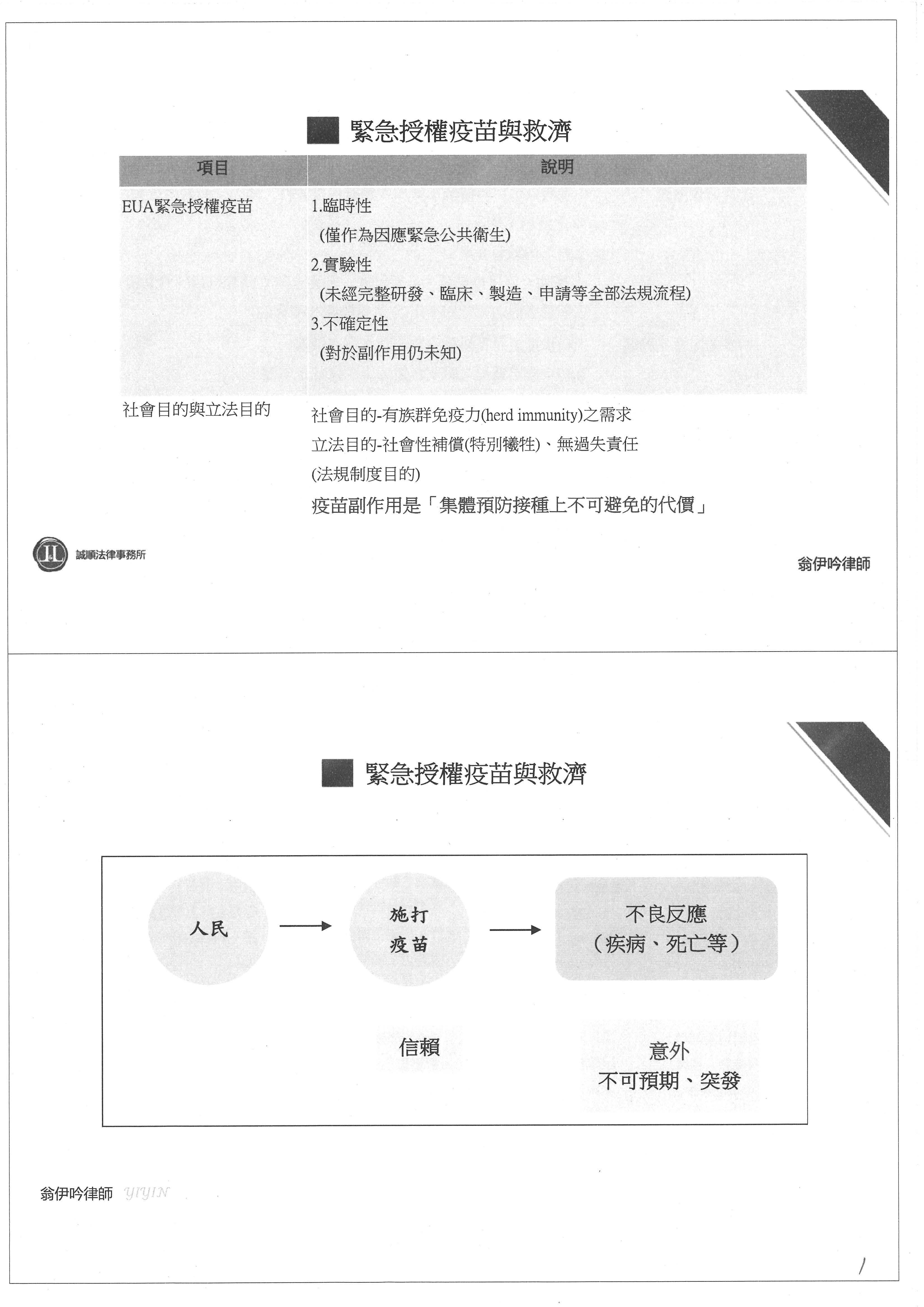 首先我們來瞭解一下疫苗緊急授權(EUA),剛剛其他學者說過,在時間有限的情況下,我來講一個重點,後續會針對現行VICP發生非常重大的問題提出說明。先講疫苗緊急授權(EUA),它具有三個特性,第一個是它具有臨時性,第二個是實驗性,第三個是不確定性。具實驗性是因為它沒有經過完整的研究、臨床製造申請等法規的流程,所以它不是那麼穩定的疫苗,相對於其他已經很成熟穩定的疫苗,它非常有實驗性質與不確定性。這個不確定性,包含對於疫苗的副作用跟不良反應完全沒有辦法瞭解得非常透澈,就像是在拼圖一樣,我們目前只知拼圖裡面的其中1塊,但是對拼圖其他99塊的內容不是那麼清楚,這就是疫苗的不確定性。如果從社會目的跟立法目的的角度切入,我們可以知道社會目的為什麼要找大家來施打疫苗?因為要防護新冠疫情,所以希望人民都來施打疫苗,產生族群免疫力,達成整體免疫。但是施打疫苗並不是所有人的身體都能夠負荷,有成千上萬的人,大家的狀況都不一樣,自然有一套社會性補償的方式,也就是施打疫苗產生不良反應之後,我們要對這些人進行特別犧牲補償,所以我們也不會去討論它的可責性。同時這個跟民事的損害賠償是不一樣的,民事是損害賠償,但這個是社會性的補償,因此我們在討論救濟的情況下,疫苗副作用是集體預防接種不可避免的代價。既然是在這種情況之下,審核只要有任何一點點沒有辦法排除與疫苗不相關,就是有關,就應該予以救濟。人民因為信賴政府說的話,所以施打了疫苗,結果發生不良反應導致疾病跟死亡,對人民來說,這個就是他的意外,而且連政府機關當時都不曉得有哪一些副作用,甚至當時連施打AZ也不曉得血小板低下症者會發生血栓。截至今日,國際醫學期刊也證明,施打AZ會發生血栓,但不見得會有血小板低下的情況,所以文獻跟資料是一步一步、一直在往前推進。在當時政府機關都不曉得有這些不良反應跟副作用的情形下,對人民來說,他們也是遇到一個意外,就是保險法上所說不可預期的意外及突發事故。