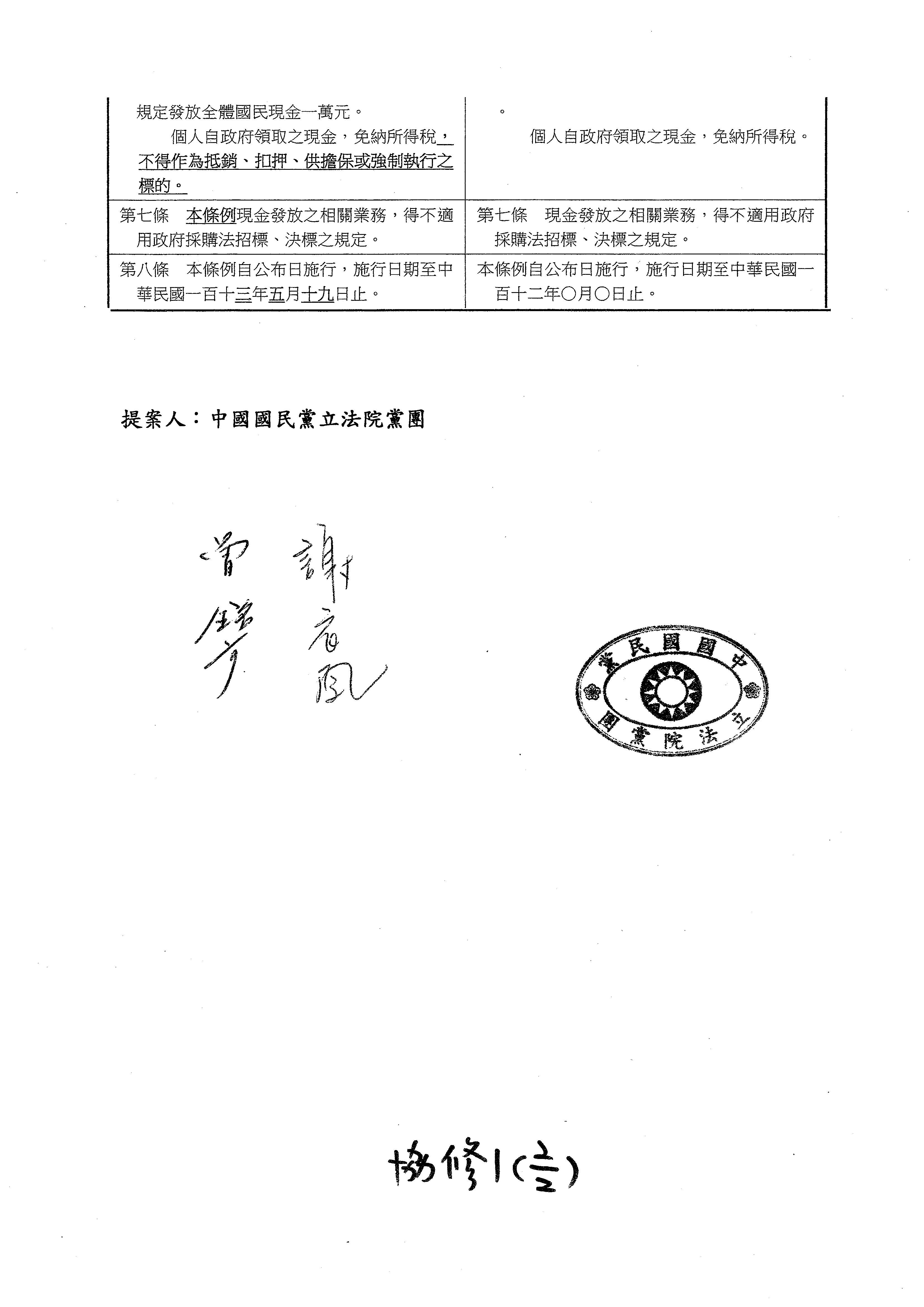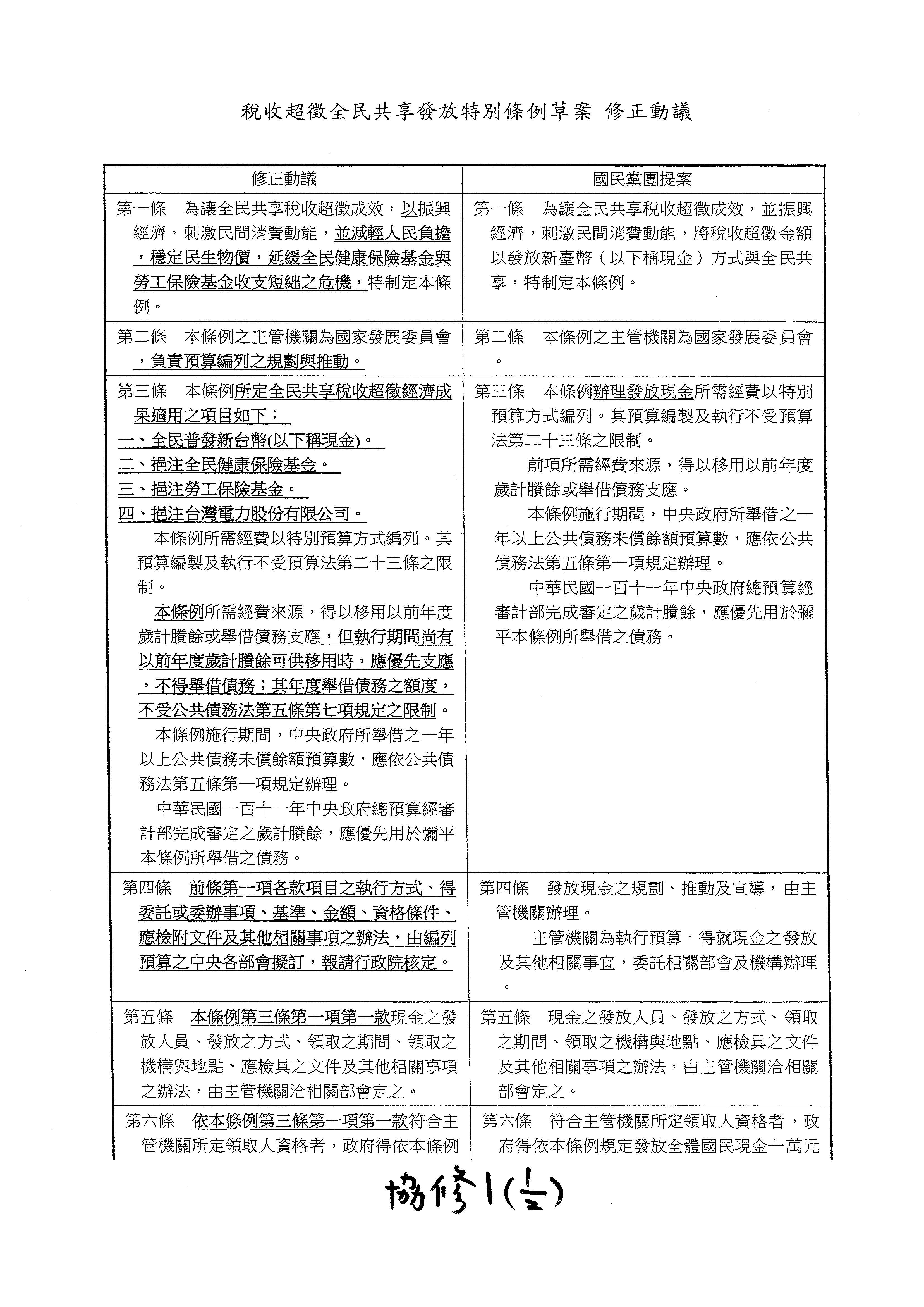 曾委員銘宗:國民黨團提出來的名稱是稅收超收全民共享發放現金特別條例,我們這個名稱才符合事實,所以我們希望法案的名稱就照國民黨版的提案通過,謝謝。