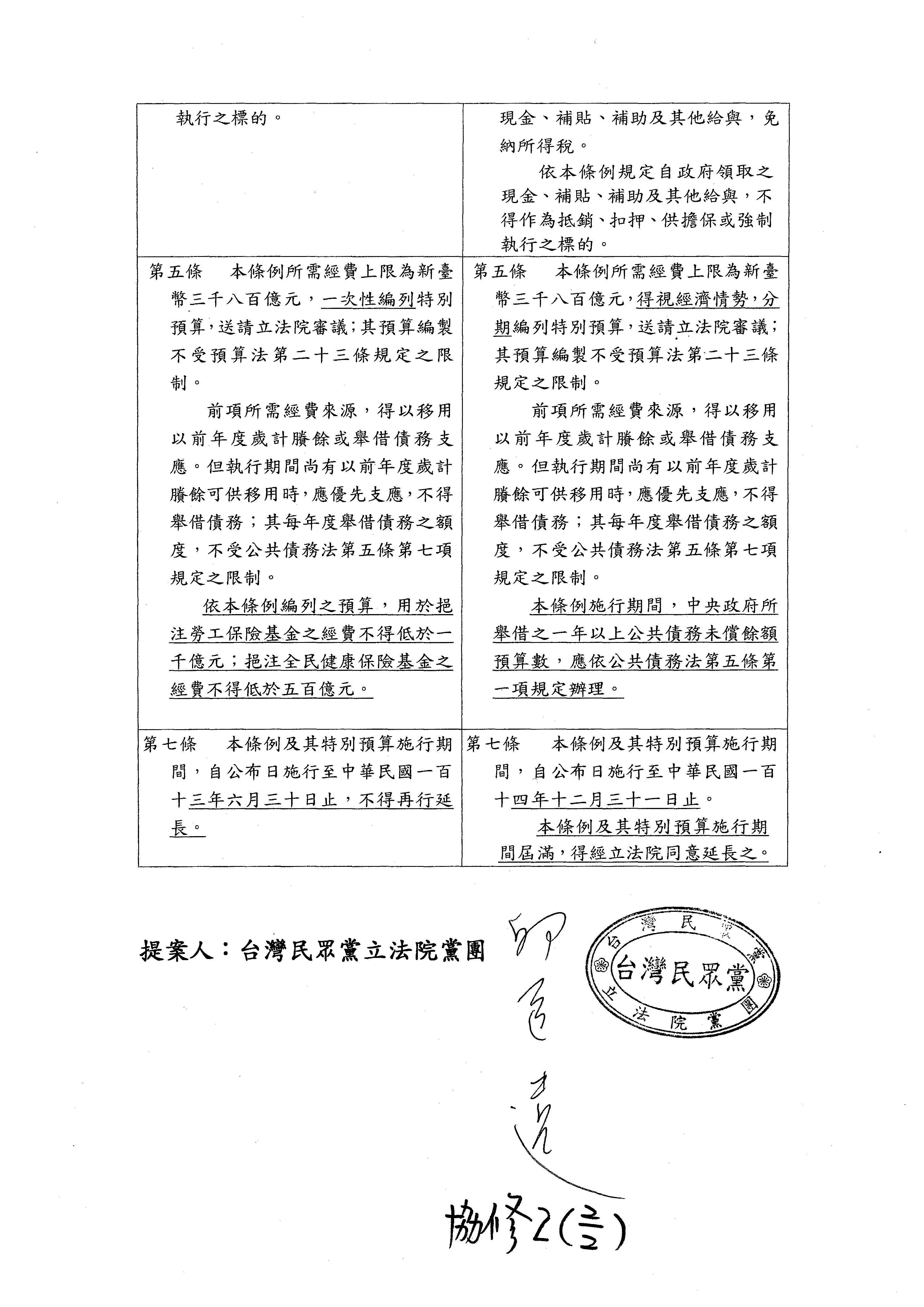 第二個,我們覺得有兩個方向是國人要共同面對的,除了發放現金,就是還債這個重責大任,如果落在這一次的特別條例裡面能夠把這個方向定位,未來不管是哪一個政黨在2024年執政,他們要面對10兆的勞保虧損、潛藏負債,就有一個延續性的可能性。因此我們覺得把還債入法、同時推升未來改革的立法延續性是重要的,希望各個政黨都能夠支持我們民眾黨的版本,以上,謝謝。
