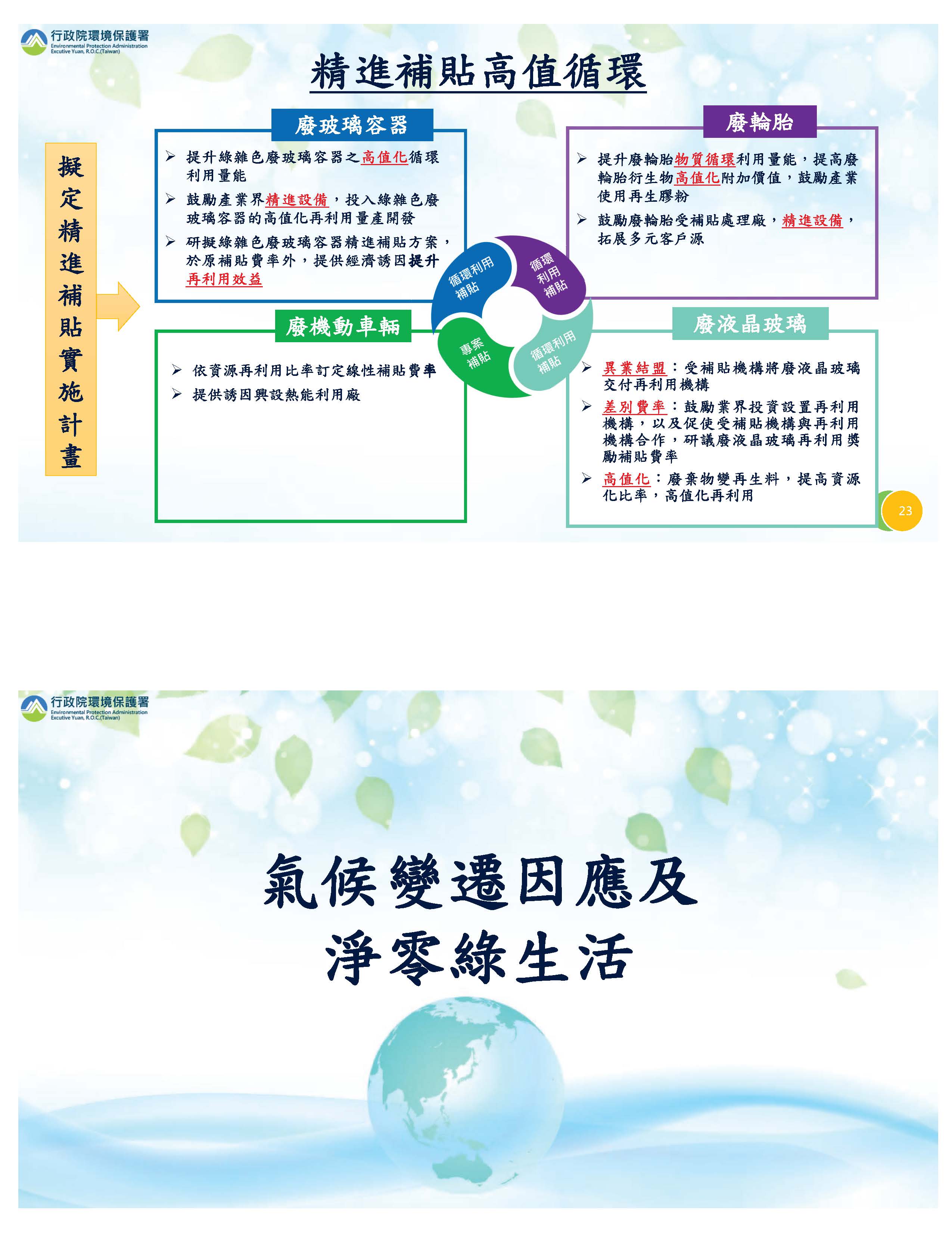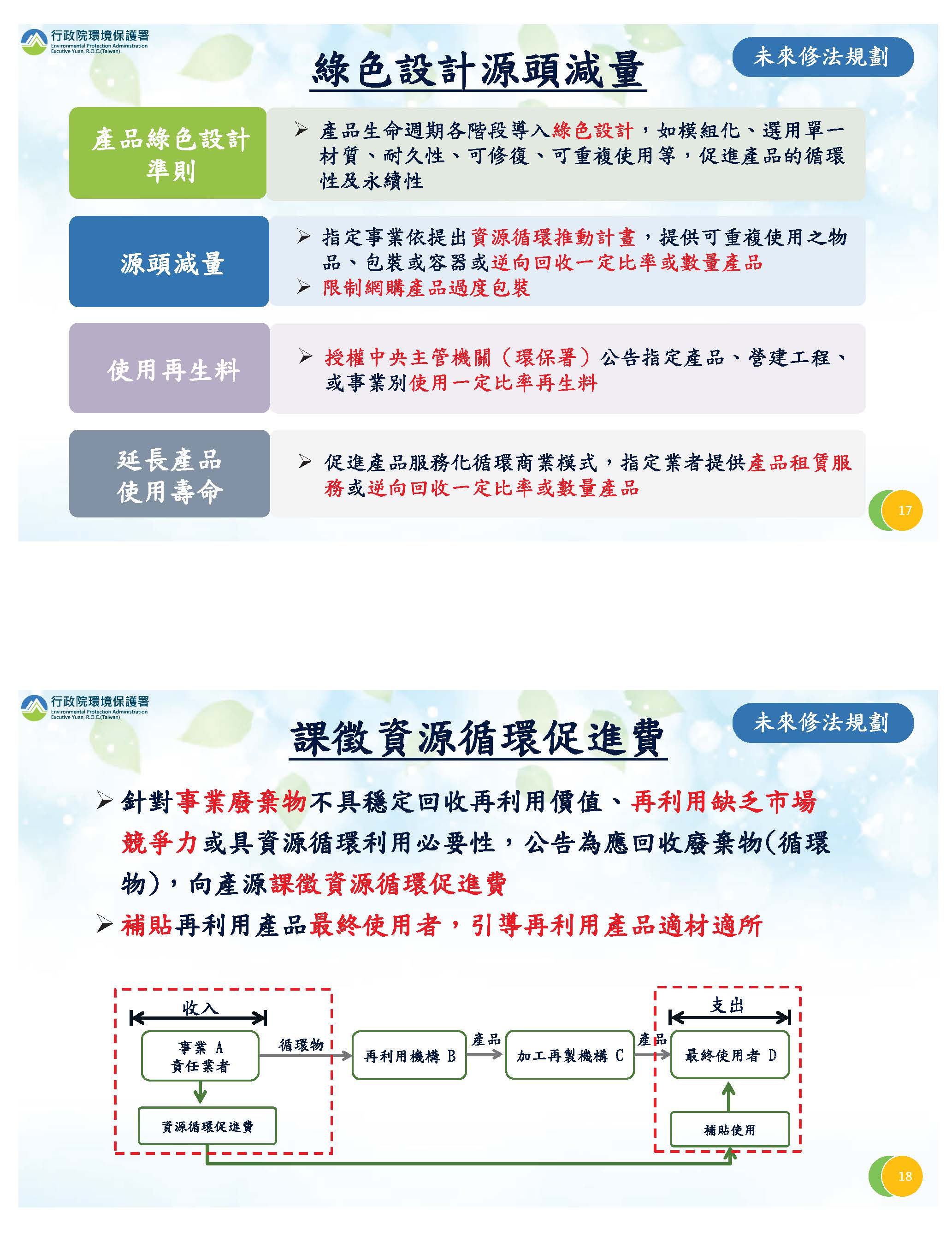 有關回收部分,我們精進所謂的高值循環,就是對於回收不好的,希望他們能夠精進設備,朝高值化方向走,我們則在費率上給他們一些鼓勵,像廢機動車輛的ASR,即粉碎之後的剩餘物,以往都是送焚化爐燒掉,現在我們鼓勵他們設立熱能回收場,提高回收率。對於異業結盟部分,我們也利用差別費率鼓勵他提高再生利用。