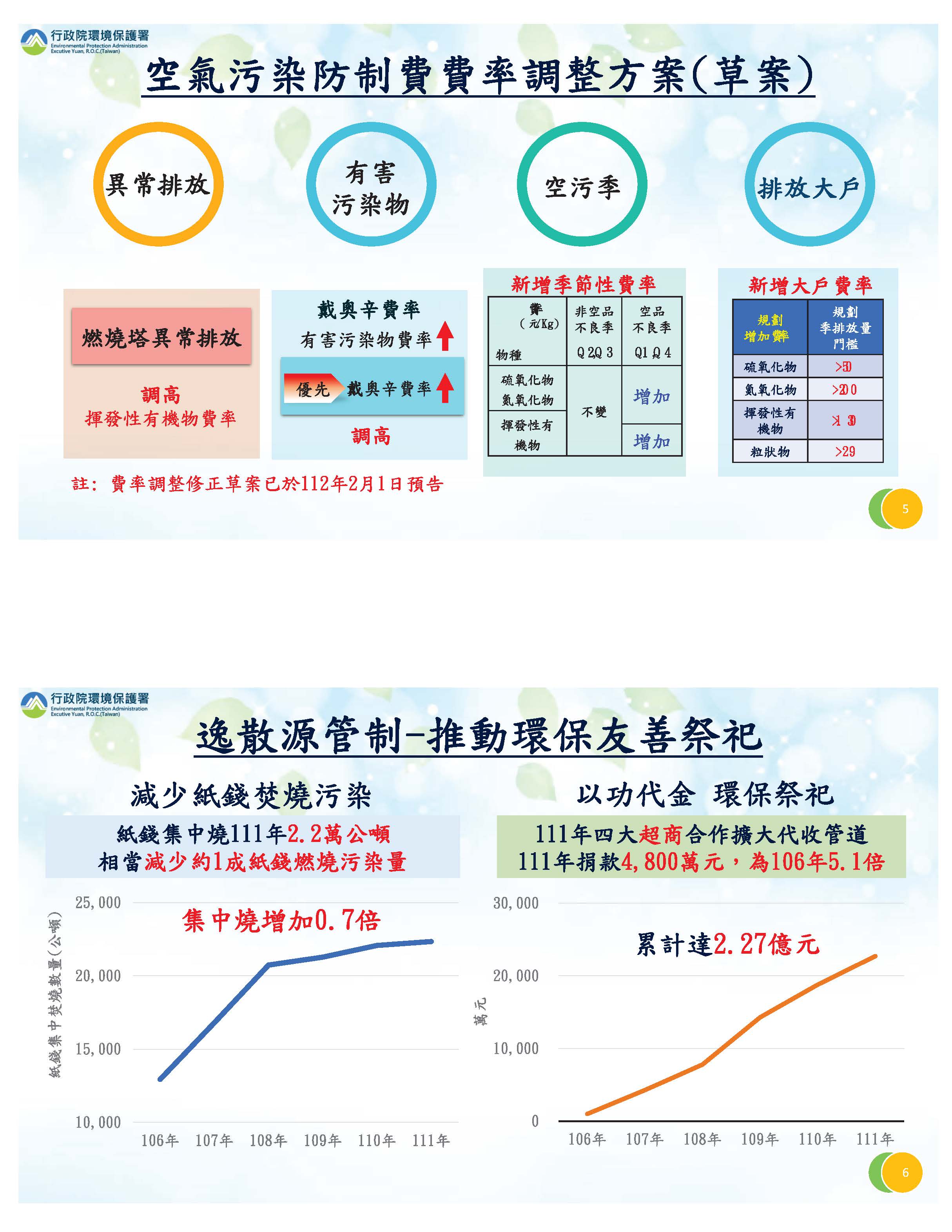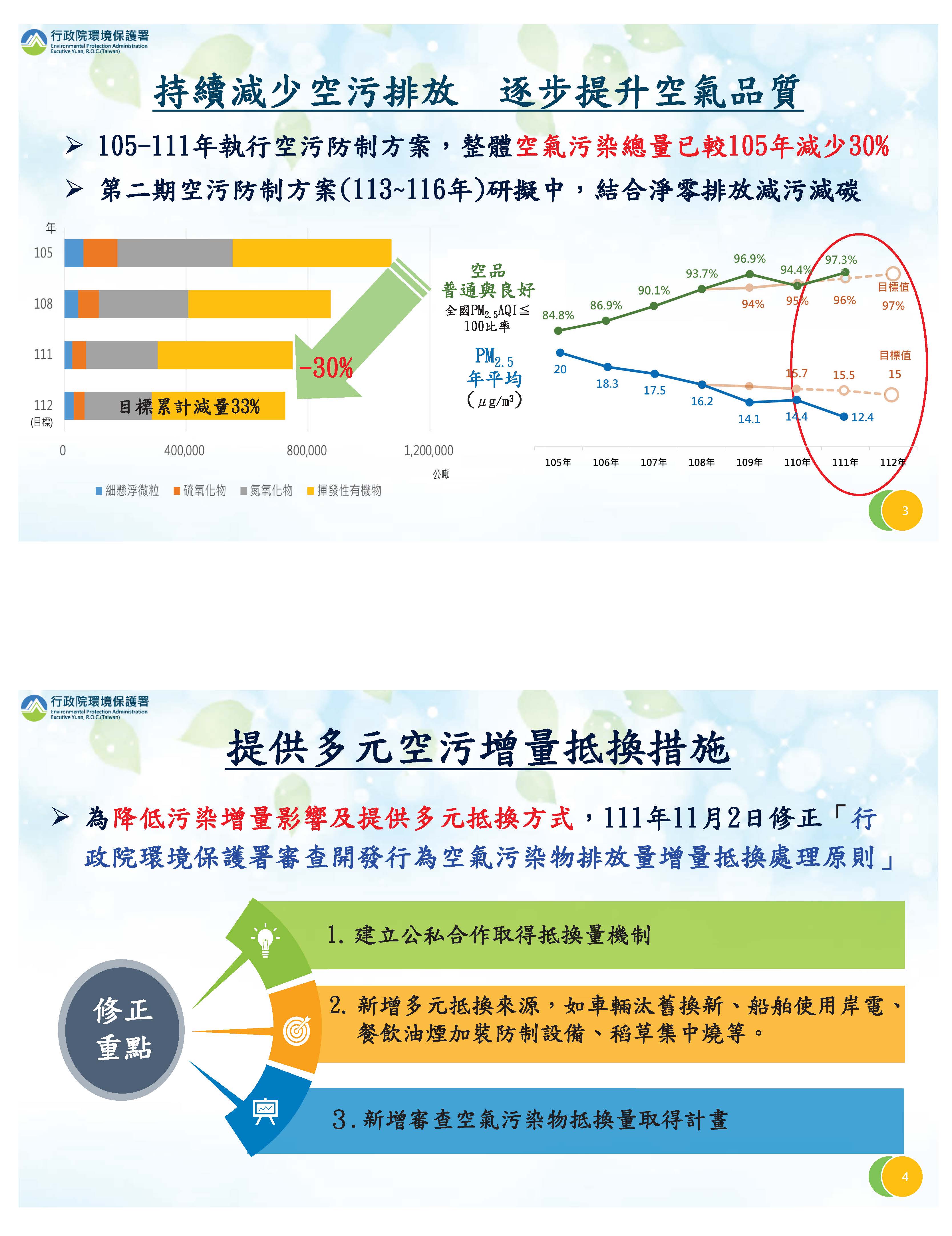 對於空氣污染防制,我們持續推動防制方案,目前是第二期,這一期的目標是到112年要減量33%,到110年我們已經減量30%,相關指標也都能夠達到預期,請各位委員參閱書面。為了提供空氣污染減量更大的動力,我們透過環評,也訂定有關抵換的處理原則,希望透過環評來促進抵換。有關空污費費率的調整,目前我們針對四個方向,也在2月1日提出預告,也就是對於異常排放、有害污染物、空污季以及排放大戶等的費率作一些調整。有關紙錢焚燒,我們持續推動集中燃燒跟以功代金,這樣的成果請各位委員參閱書面。對於車輛的汰換,我們持續地推動,從106年到111年,一到三期的柴油車已經減少了46%;機車則從109年到111年已經減少了36.5%,所以對於空品都有很大的改善。