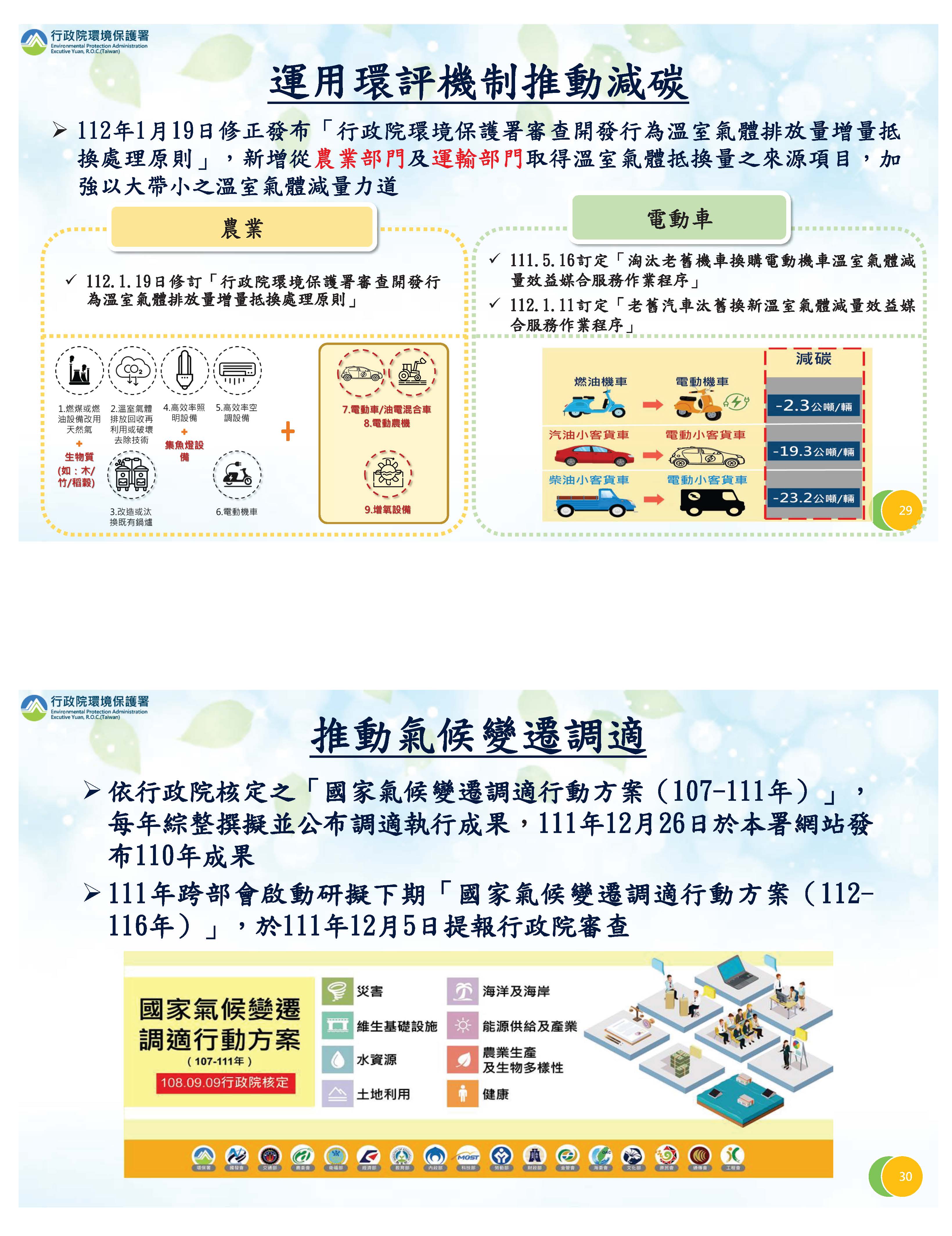 由於要推動加強減量,所以利用環評機制,希望透過抵換來促成減量額度的交易,因此我們在1月19日修訂抵換處理原則,將農業部門的一些作為納進來。另外有關電動車部分,以往只有機車換電動機車有2.3噸的減量額度,從1月1日開始,增加了有關汽油車換電動小車或柴油小客車換電動車等,都有相關減量額度的認定,希望透過交易平臺讓它有價化,增加民眾更換的意願。