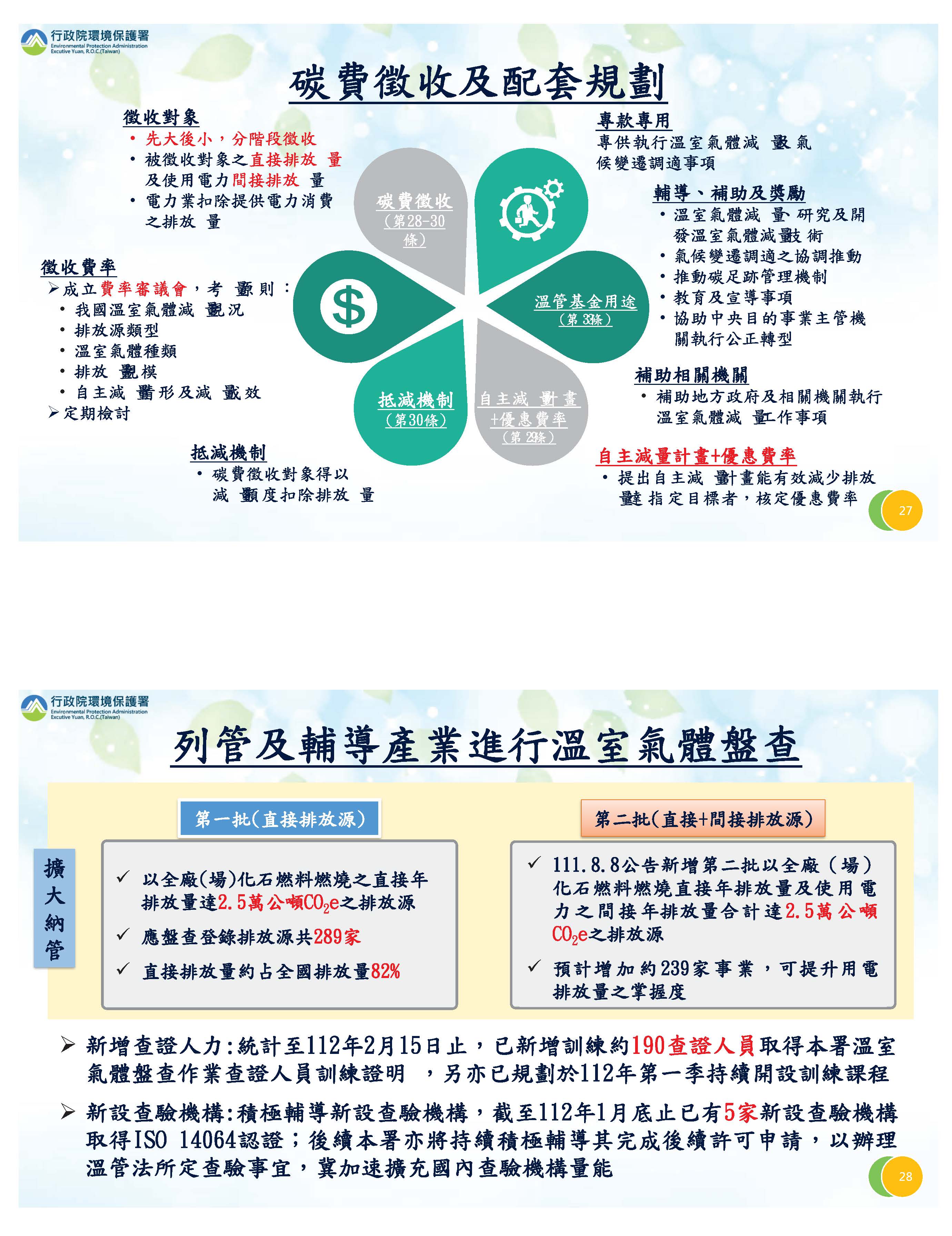 有關盤查部分,第一批是大家所熟知的287家,今年是289家,第二批我們把所謂間接排放超過2.5萬噸的也納進來盤查,預估會有239家,盤查之後,大概8、9成的排放量都可以掌握。對於大家所關心的盤查量能問題,我們現在已經加強訓練,增加190名查證人員;至於查證機構,在經濟部等部會一起努力下,目前已經增加了5家新的查驗機構,我們一定會積極擴充這個量能。