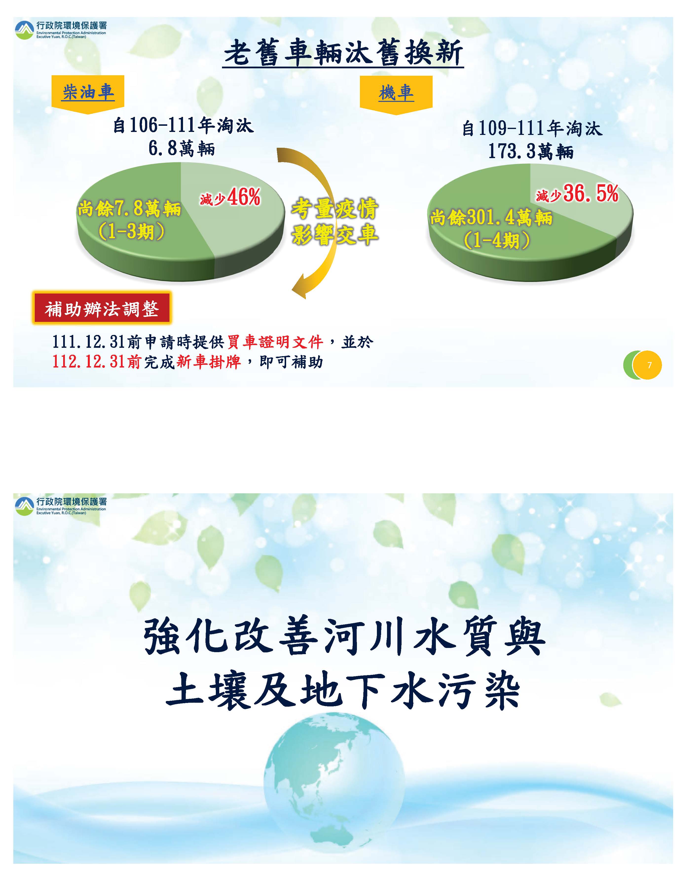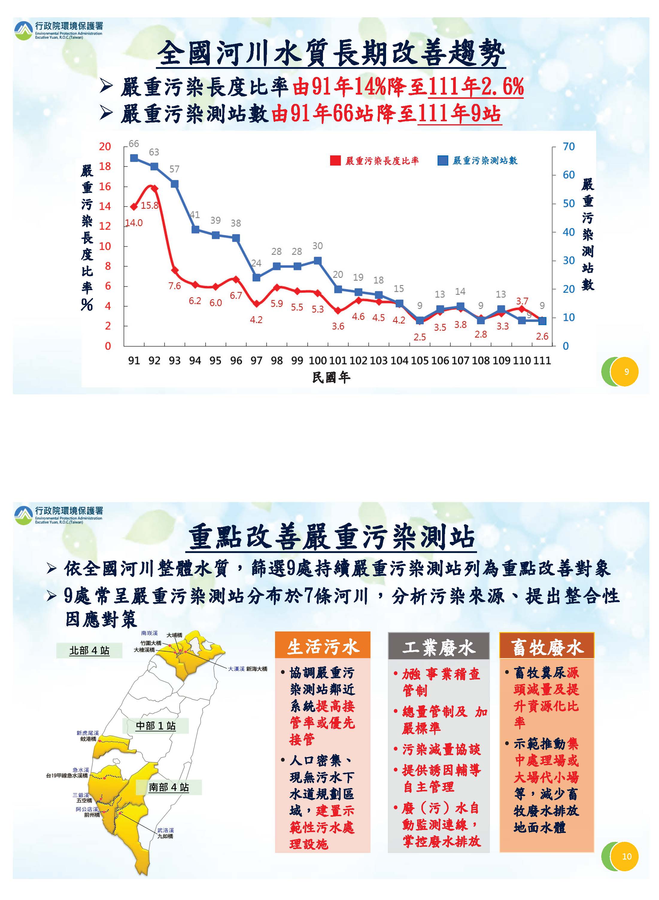 有關河川的改善,河川污染長度持續減少,測站數也在減少,請各位委員參閱書面。雖然減少了,但還是有幾處持續嚴重污染,所以我們針對這些重點整治,從生活污水、工業廢水跟畜牧廢水著手推動。對於土壤及地下水的污染場址,目前94%都完成改善跟解列,剩下的部分有的採用的工法比較慢,所以我們持續列管並督促改善。