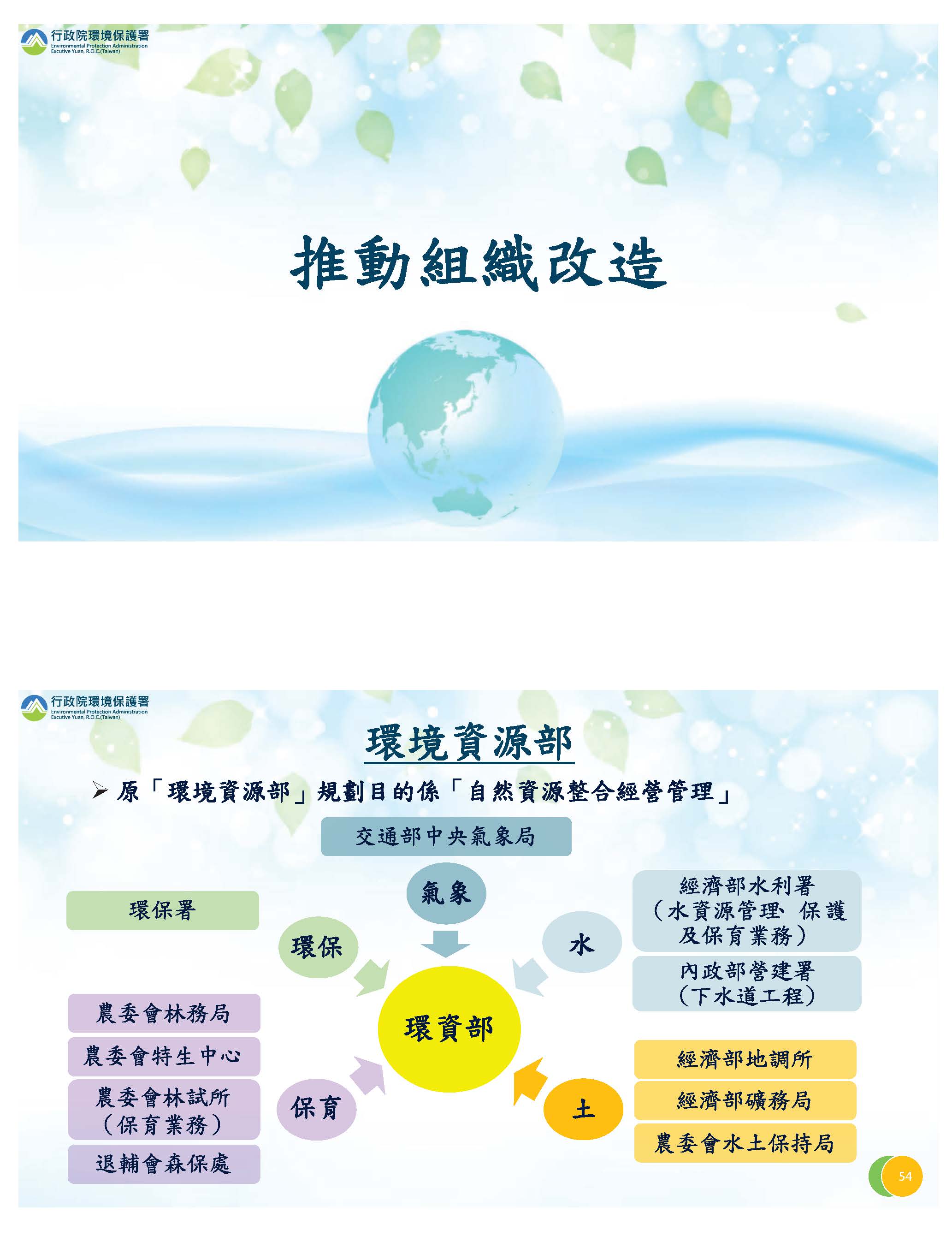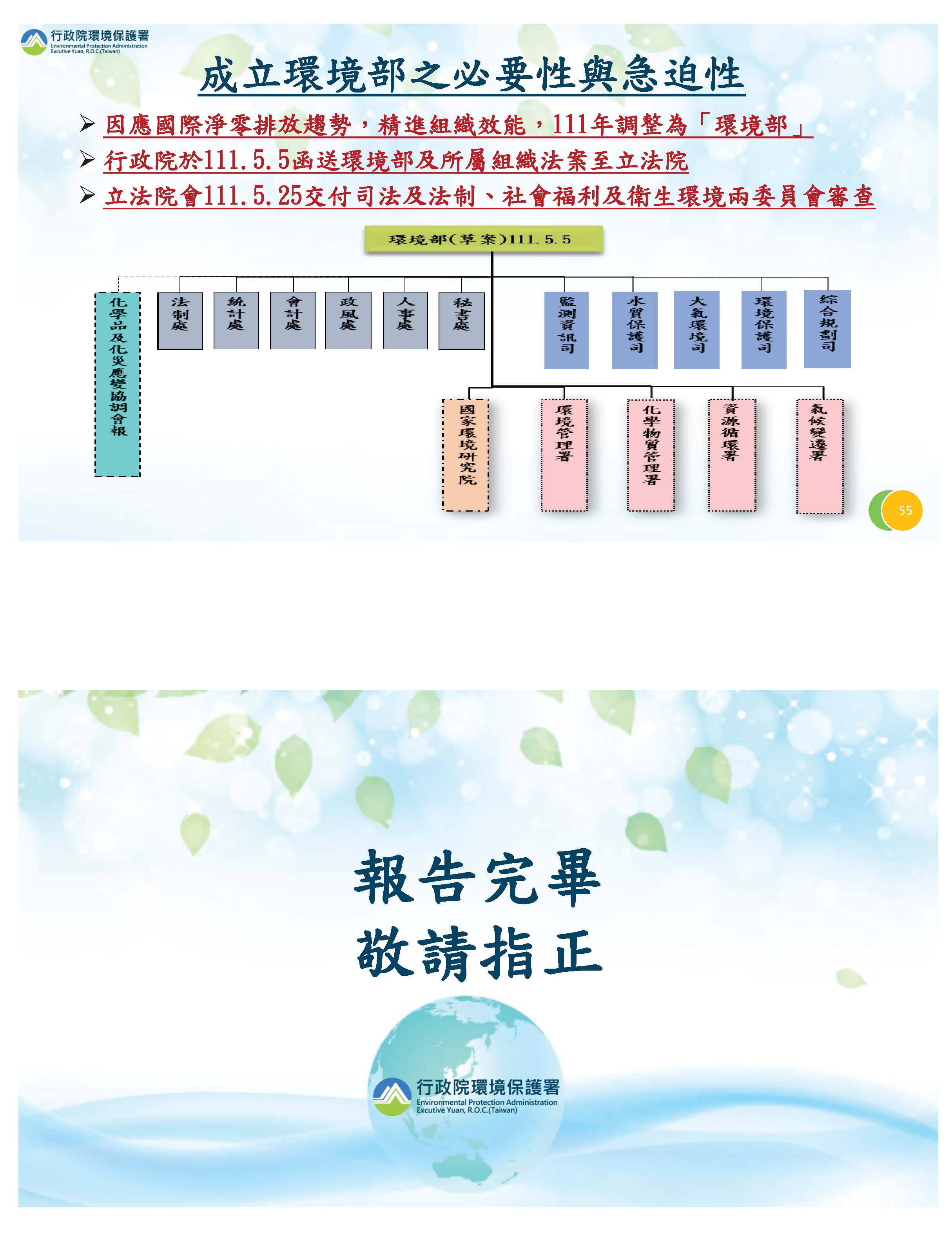 最後有關組織改造,我們現階段已經以環境部的組織架構送給大院來審查,並已經付委預定明天會進行審查,也請各位委員給我們支持。以上簡報,謝謝。(簡報參閱附錄)