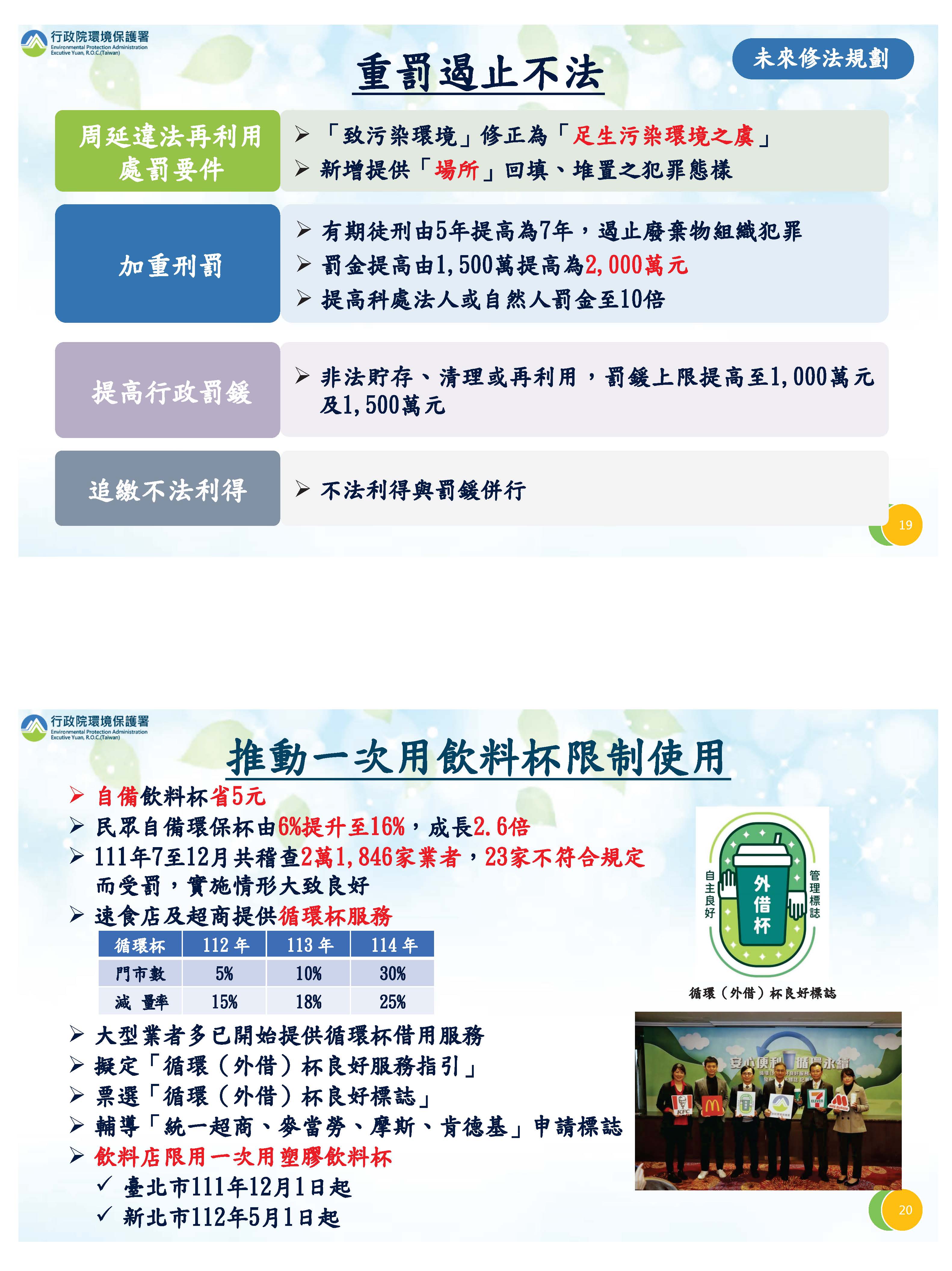 有關持續推動一次用飲料杯限制使用部分,第一,提高自備飲料杯的優惠5元,這部分獲得很好效果,民眾自備環保杯的比例也大幅提高。第二,希望速食店及超商提供循環杯服務,這個部分訂有逐年目標,希望大家一起努力。另外就是飲料店限用一次用塑膠飲料杯部分,我們已經公告授權地方訂定實施日期,目前臺北市和新北市都已經訂定實施日期加以推動。