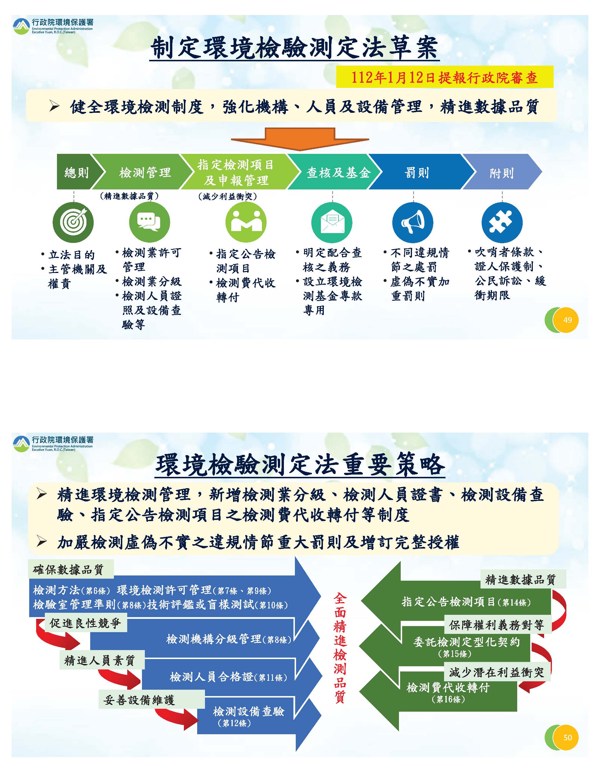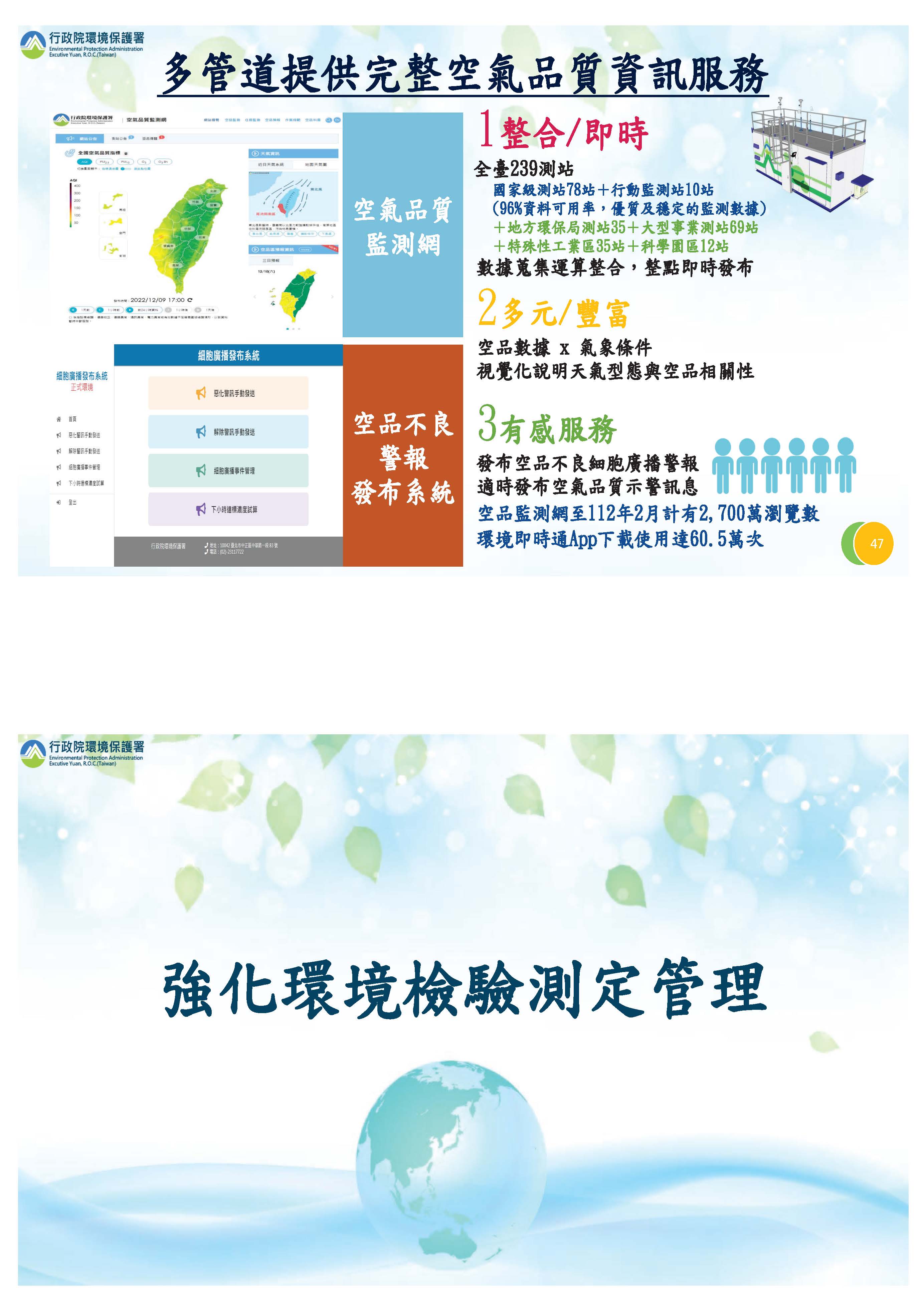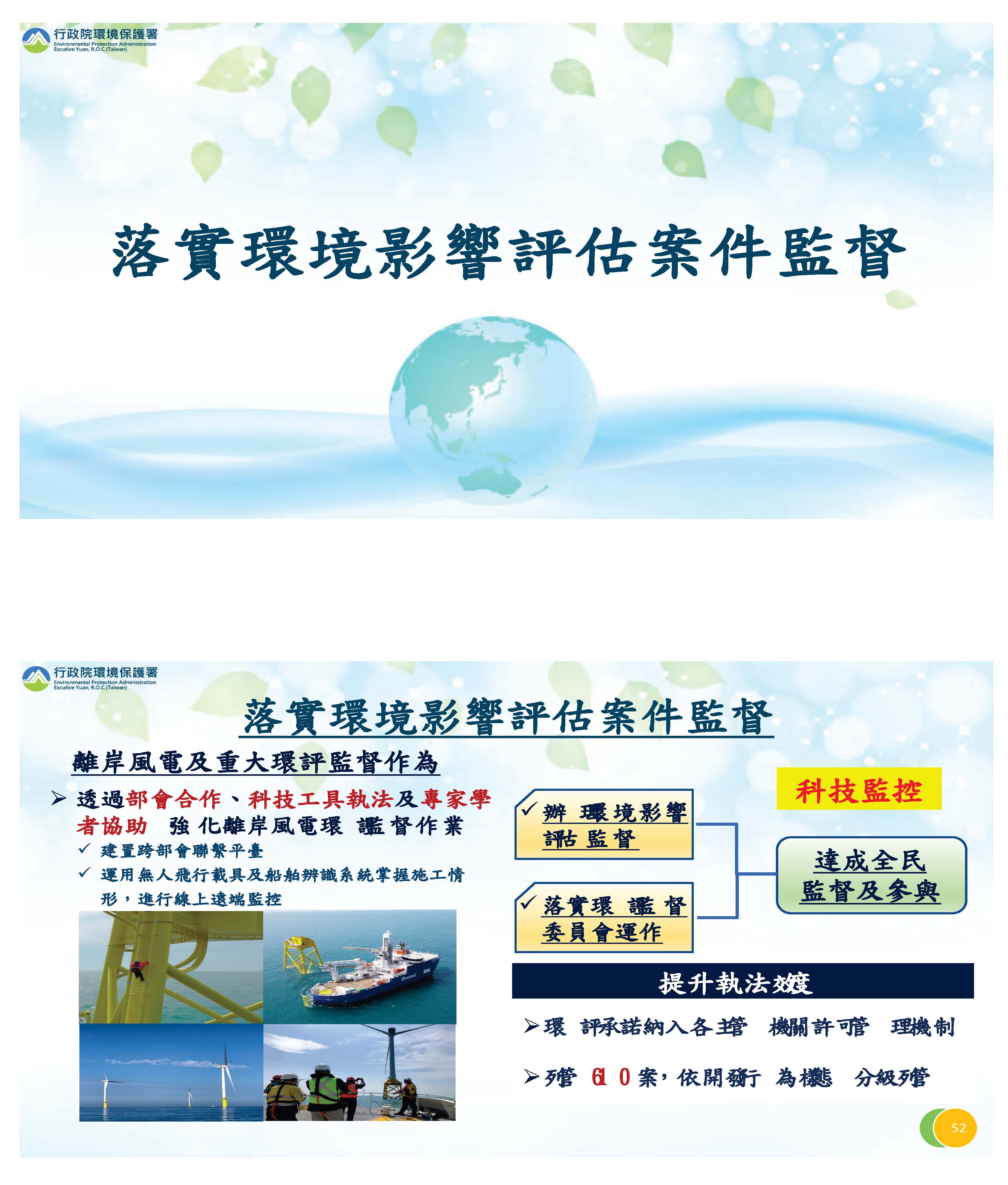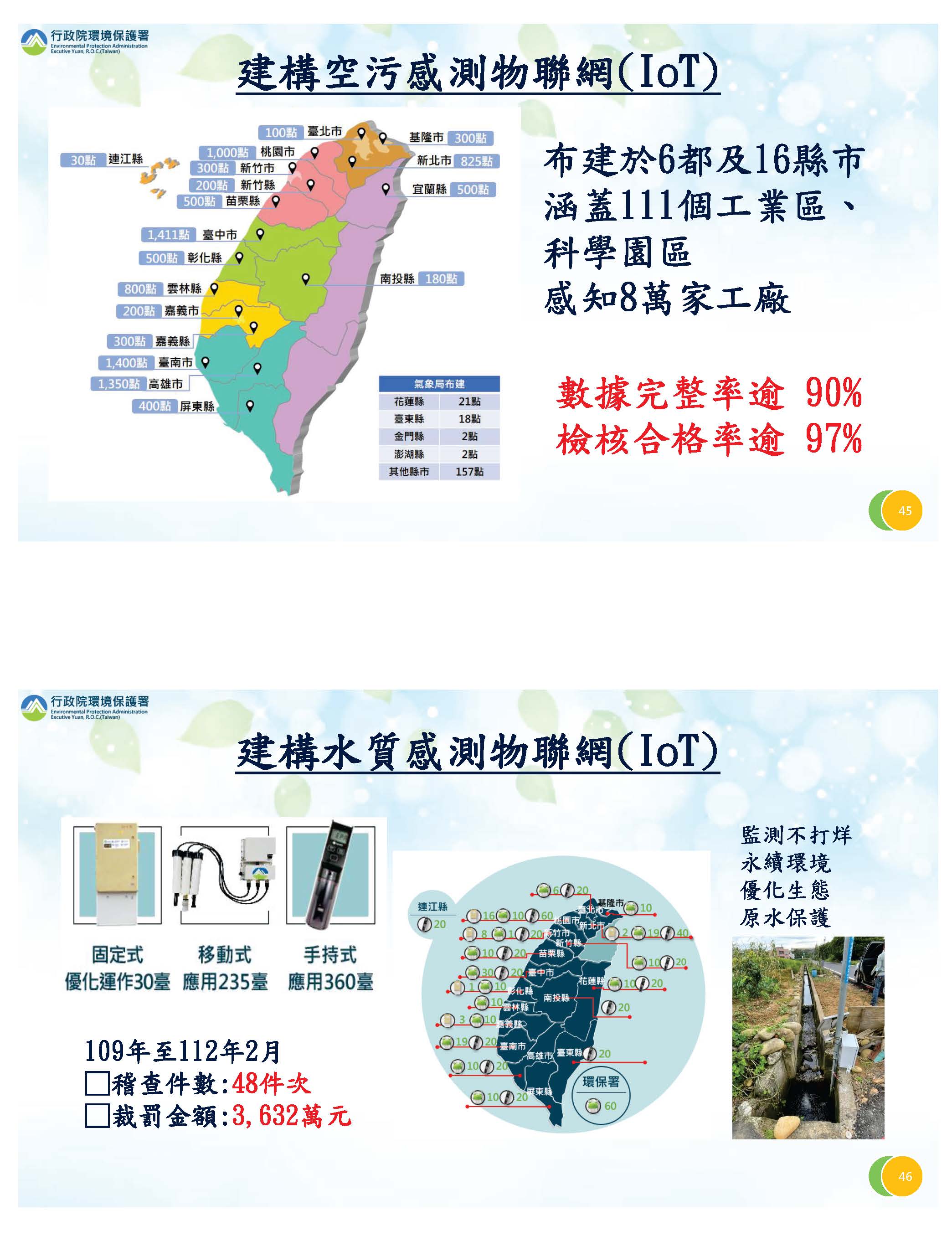 有關監測的部分,我們推動空氣污染監測物聯網(IoT)的部分,現在資料的正確率也都提高,對水質現在也積極在推動,這兩個部分我們主要用在有關污染源的追查及打擊的方面。另外對於空氣品質,我們結合所有的車站,即時的提供資訊給我們民眾,有關惡化的部分透過這個系統提醒民眾注意保護自己。還有有關檢驗測定的部分,大家關心的檢驗測定法我們已經在1月12日提報行政院審查,主要是要健全環境檢測制度、強化機構人員及設備的管理,並精進數據的品質。所以在未來,主要會新增檢測業的分級、檢測人員的認證、檢測設備的查驗及公告指定項目檢驗費用的代轉機制等等,這都在新的修法裡面把它列進來。再來,有關環評監督,我想大家很關心比較大量是有關離岸風電的部分,我們會結合相關部會,利用科技的工具來執行,目前都能有效的來監督。