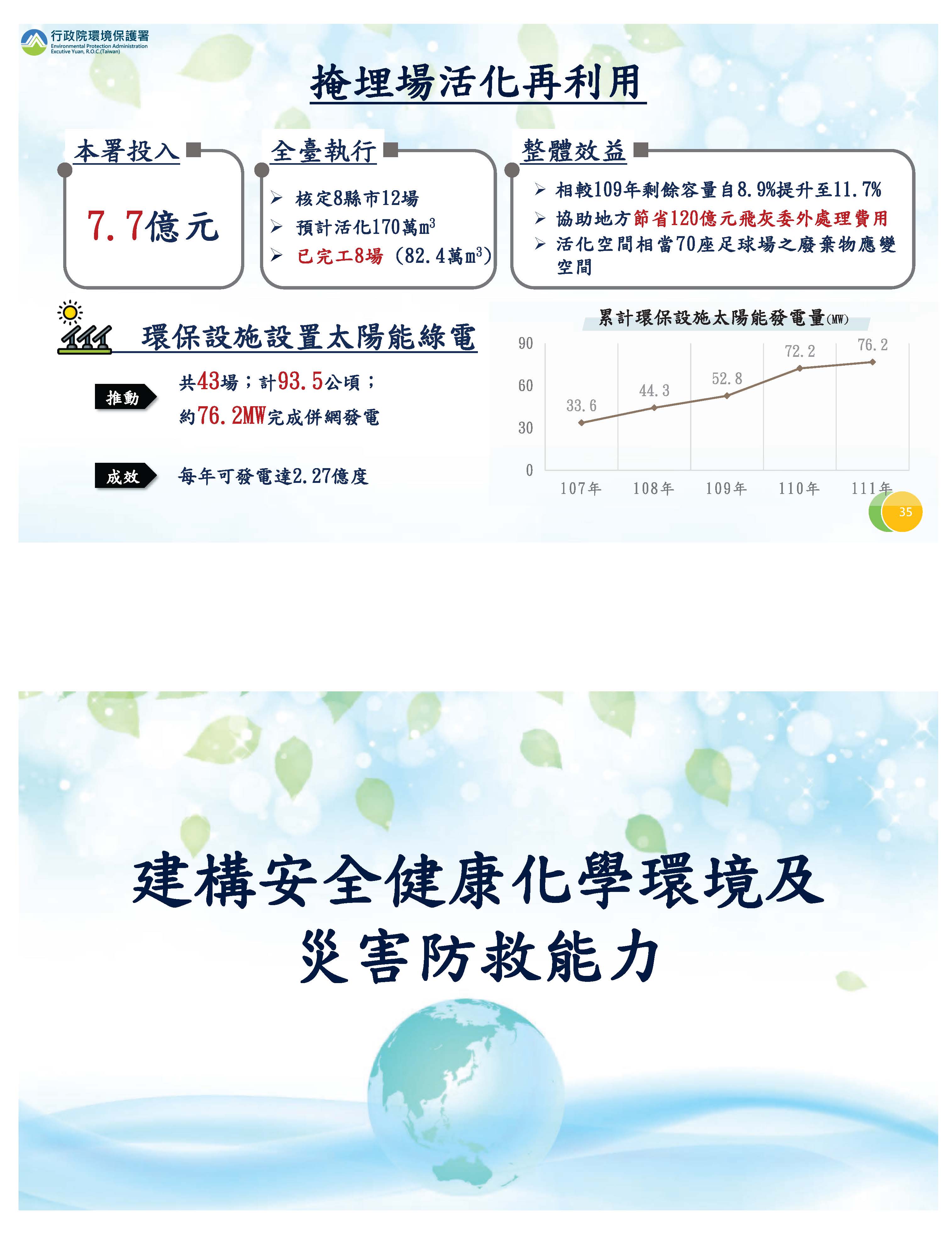 有關掩埋場活化再利用部分,在我們積極活化下,剩餘容量從8.9%提高到11.7%,可作為應急使用,因為容量的提升,也節省了我們很多非固化物的委外處理費用。另外增加推動設置太陽能綠電部分,請各位委員參閱。