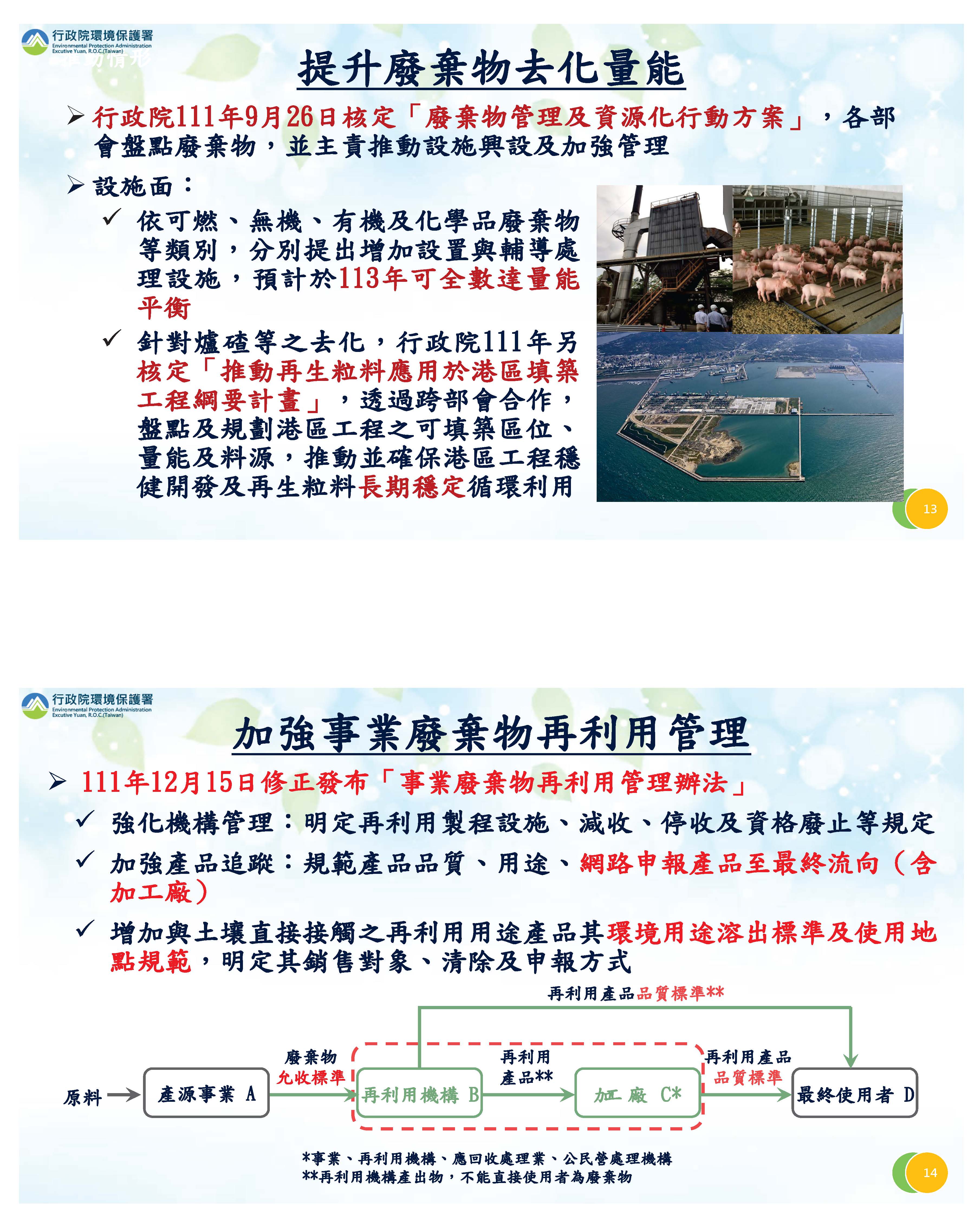 對於廢棄物的管理跟資源循環,首先針對處理量能不足造成可能的棄置,行政院在去年9月26日核定了廢棄物管理及資源化行動方案,各部會統統動起來,針對可燃、無機、有機及化學品等四個部分,盤點所有可能的設施場所跟量能並全力推動,希望在113年能夠達到量能的平衡。對於再利用的部分,尤其是大家最關心的爐碴,行政院也在111年核定推動再生粒料應用於港區填築工程綱要計畫,除了臺北港之外,持續推動中南部的港區,希望持續有效穩定這些再生粒料使用。