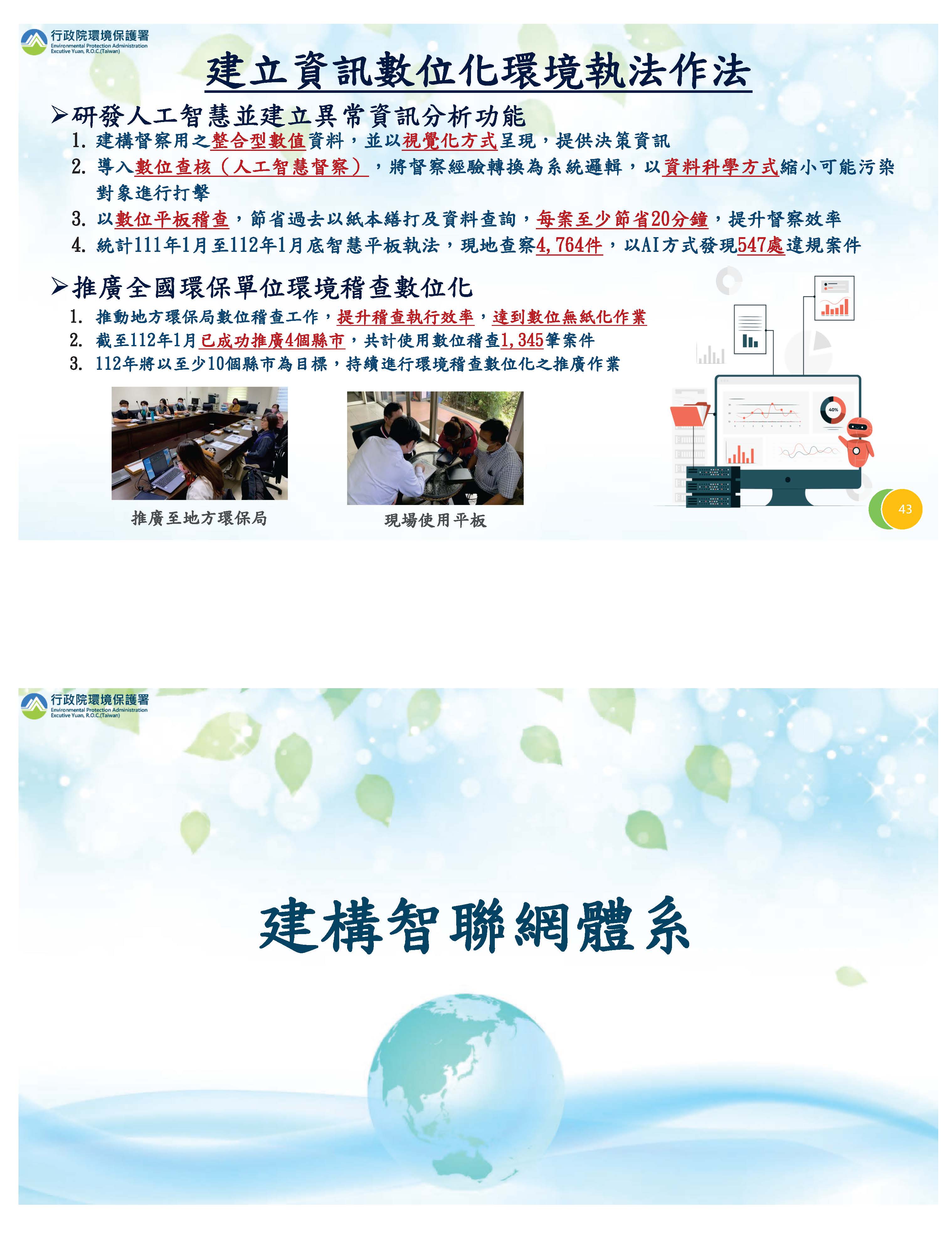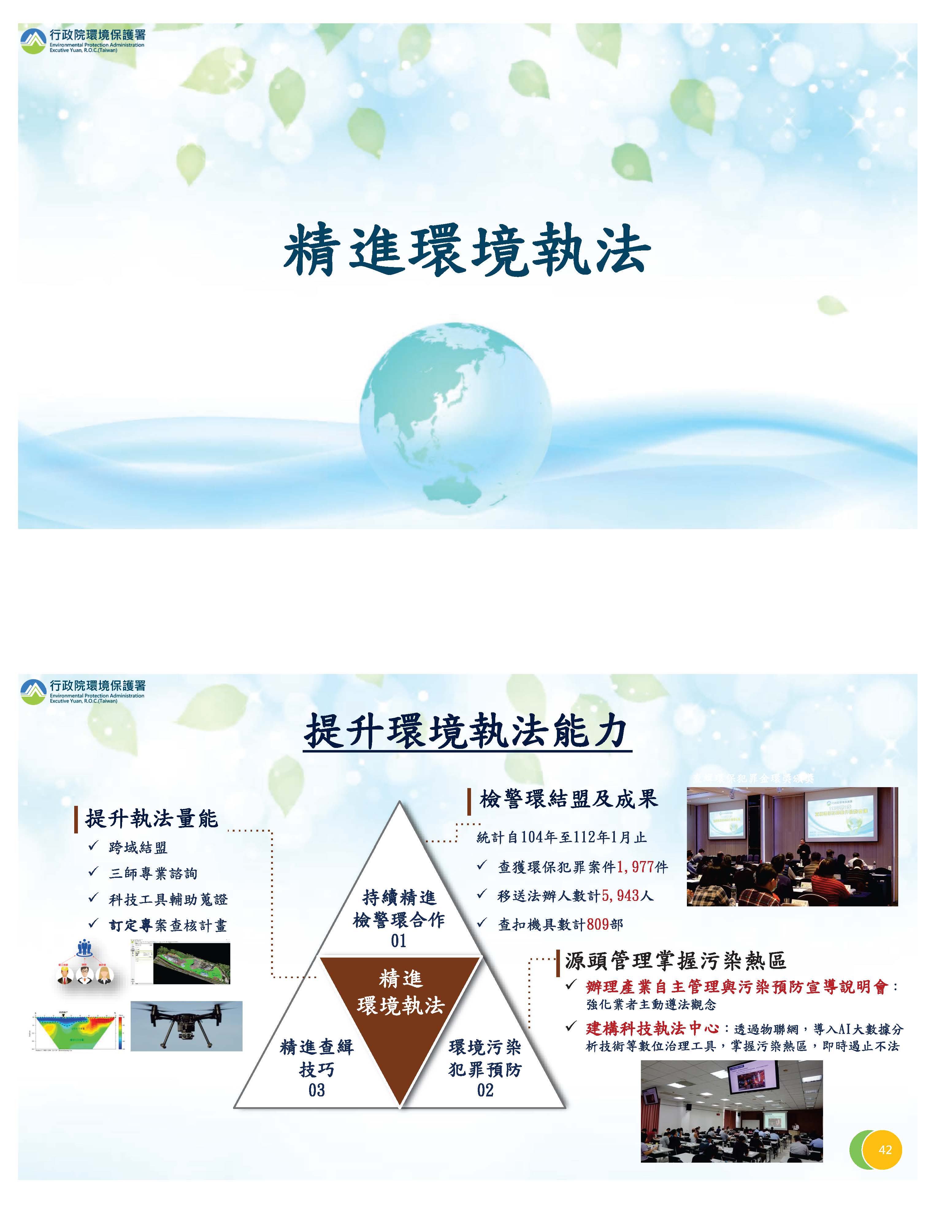 對於環境執法部分,有關檢警環的平臺運作非常良好,針對相關環保犯罪都能有效打擊,我們現在也努力在精進查緝技巧,包括先進科技的運用等等,另外,更重要的是我們希望從源頭來防止污染犯罪的產生。對於提高這些資訊數位的能力,我們積極來建立,也跟地方配合執行,希望對案件偵查的效率能更為提升。