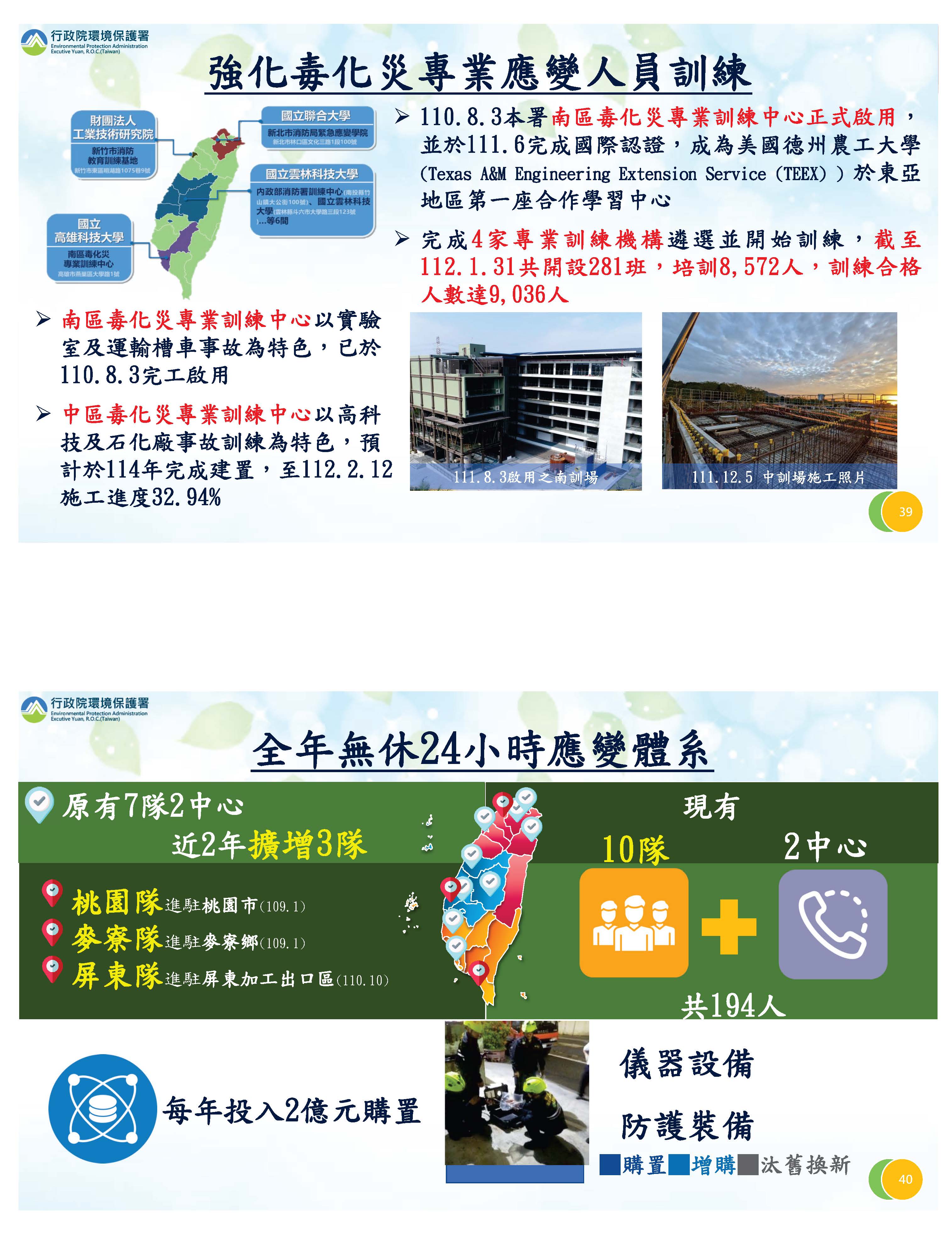 有關應變部分,為了提高應變量能,我們在南區設立了訓練中心,已經完工啟用,中區的訓練中心預計在114年完工啟用;在訓練人員部分,委託4家專業訓練機構,都已經開始在訓練,這裡也要跟各位委員報告,相關培訓人員9,611人,簡報上誤植為8,572人,請各位委員更正。