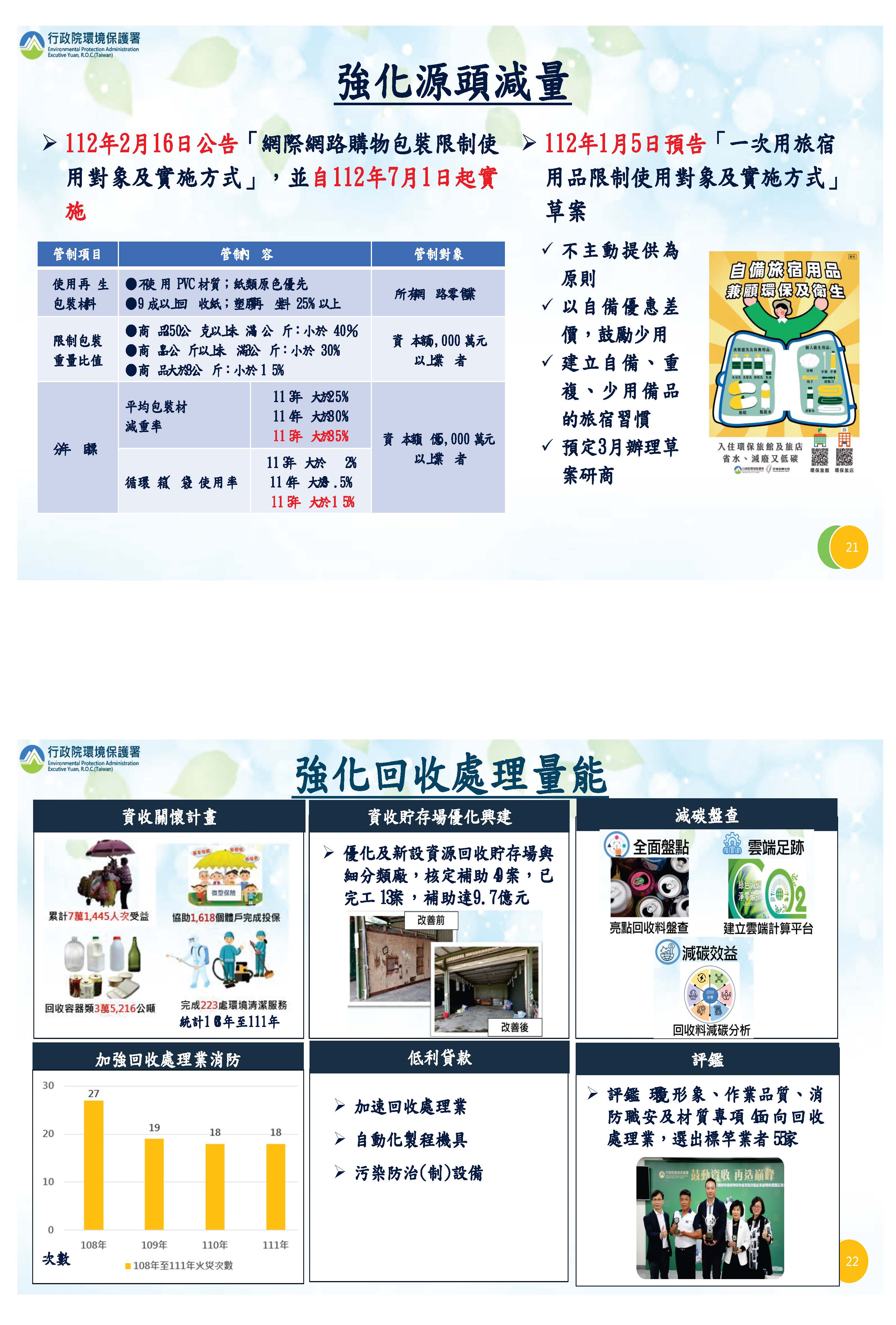 有關源頭減量部分,就是大家關心的網購包裝限制部分,我們在2月16日已經公告,預定在7月1日實施,所有使用材料的網路零售業者都要遵守,對於規模較大者,我們限制其包裝重量比值,更大的業者,我們針對其包裝材料減重率和循環使用率都訂定分年目標,希望大家共同努力達到。對於一次用旅宿用品限制使用部分,我們也在1月5日預告,希望大家一起來推動。