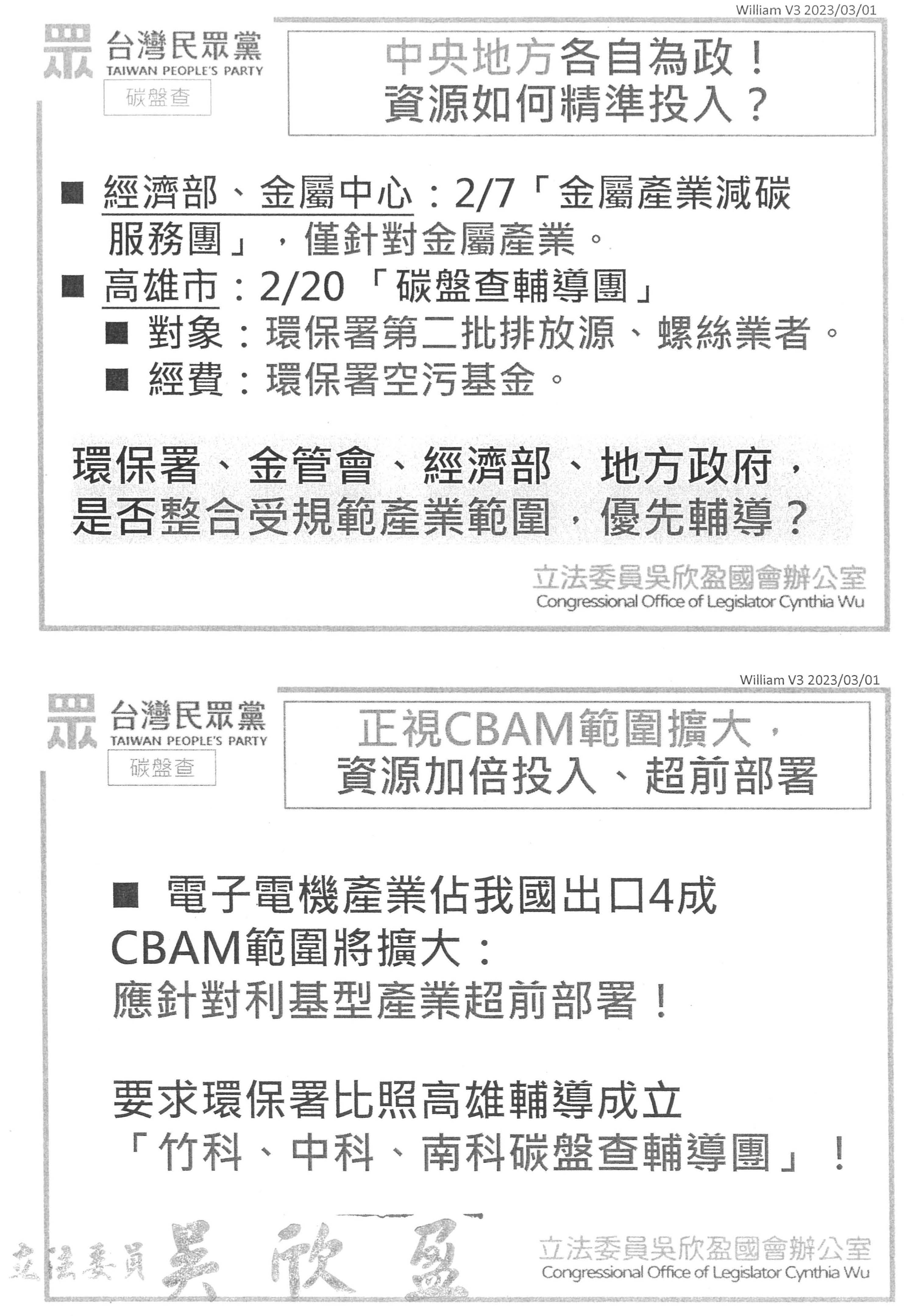 張署長子敬:我們現在主要這些工具的使用是著重在減碳,所以剛才也報告我們會從大到小。為什麼我們剛才講287家或是第二階段加進來,我們八、九成的排放量都在這一個範圍裡面,所以我們會從這一部分先做,而不會所有的都做。但是委員關心的沒有錯,就是歐盟現在還在調整,即它要徵收的範疇到底要到哪裡,像最近就新增了一個項目,就是把螺絲放進來,然後大家就很關心,螺絲的部分到底要如何徵收,當然我們自己不會要求每一個都要申報,但像它增加了螺絲這一項,屆時針對出口的部分,我們就要幫助產業,讓他們自己要去盤點、要能夠去申報。