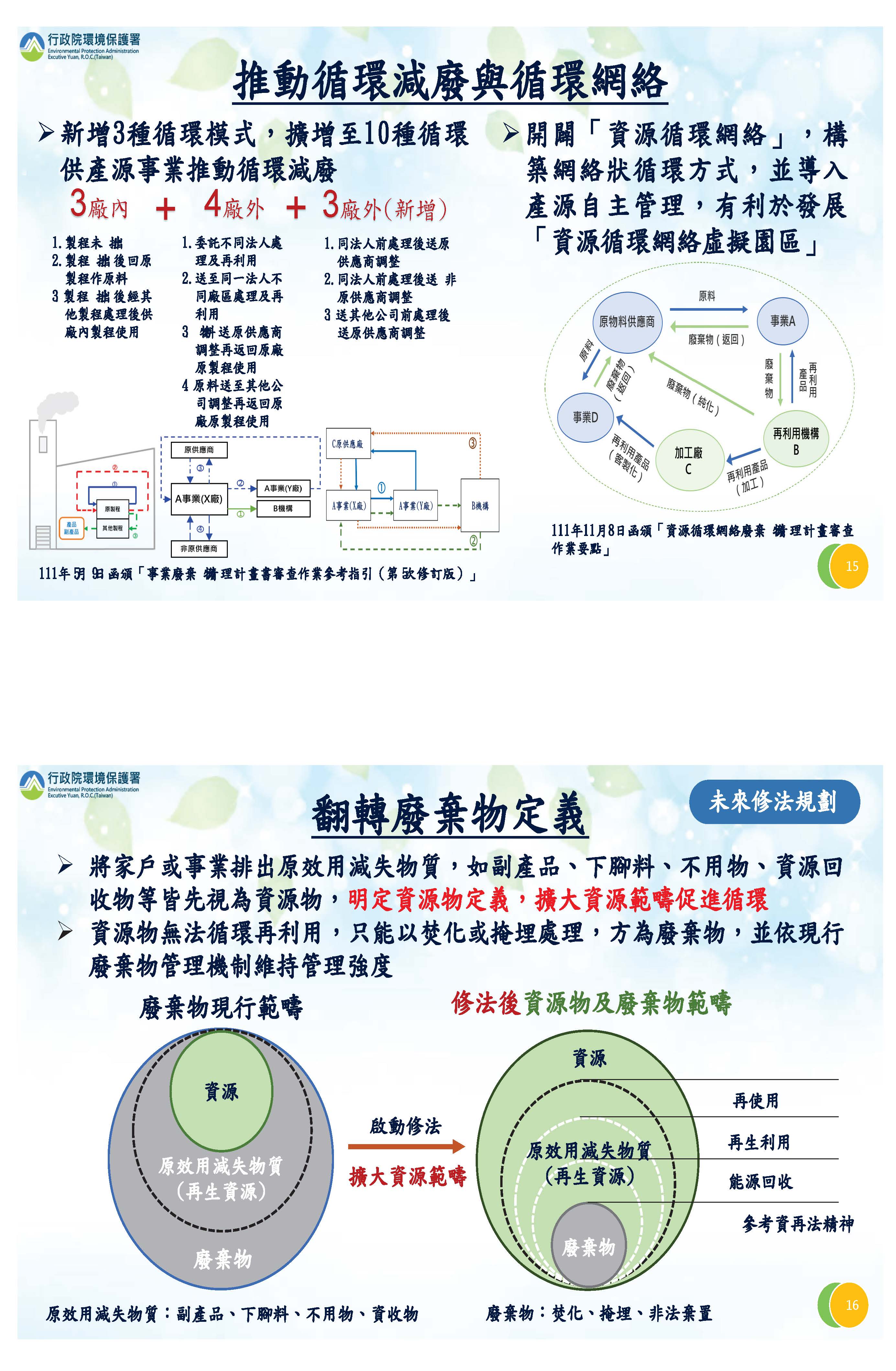 關於現在很多棄置案件,我們發現有很多是因為再利用產品的不當或未依規定使用,所以我們在去年12月15修正管理辦法,增加有關允收標準、品質標準以及流向追蹤,希望達到讓最終使用者能夠來改善這一項問題。為了推動產業更大的資源循環,所以現在我們在廢清書的審查有幾個方式鼓勵廠商來使用,包括原料在廠內循環使用,或是交給不同的法人處理再回來使用等等,希望他們能夠提高資源循環使用率。另外,我們也在推動資源循環網絡,也就是可能是不同的行業,但是在可以有效利用的情況下,我們一併來核准,簡化核准程序以提高再利用的效果。
