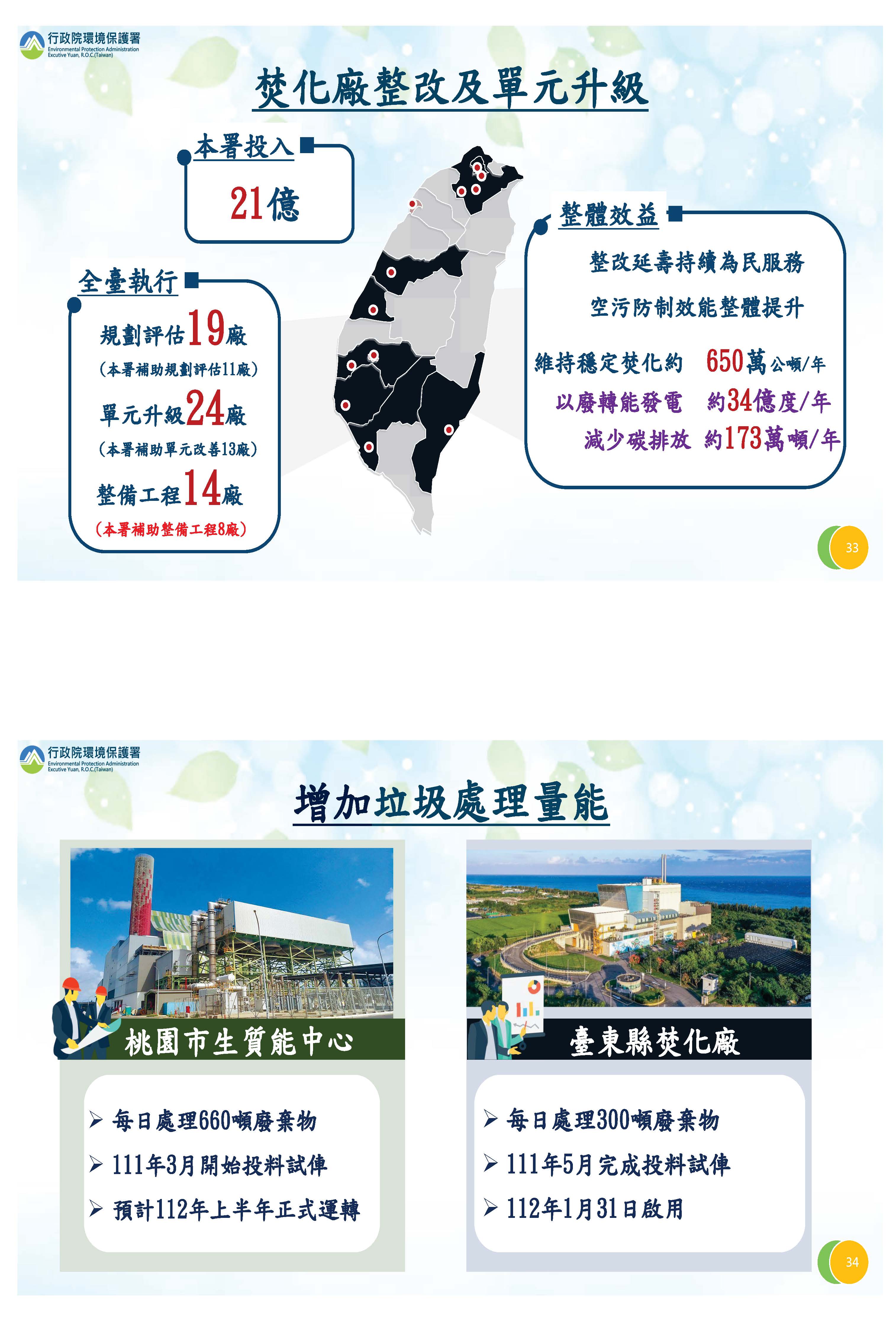 有關垃圾處理部分,焚化廠整改持續在推動,除了希望延長它的壽命之外,希望能夠提高空氣污染防制或處理的效能,在這段期間我們新增了兩個主要的廠,一個是桃園生質能中心,每天可以處理660噸廢棄物,上半年就可以正式運轉;另一個廠是臺東縣焚化爐,也在今年1月31日正式啟用。