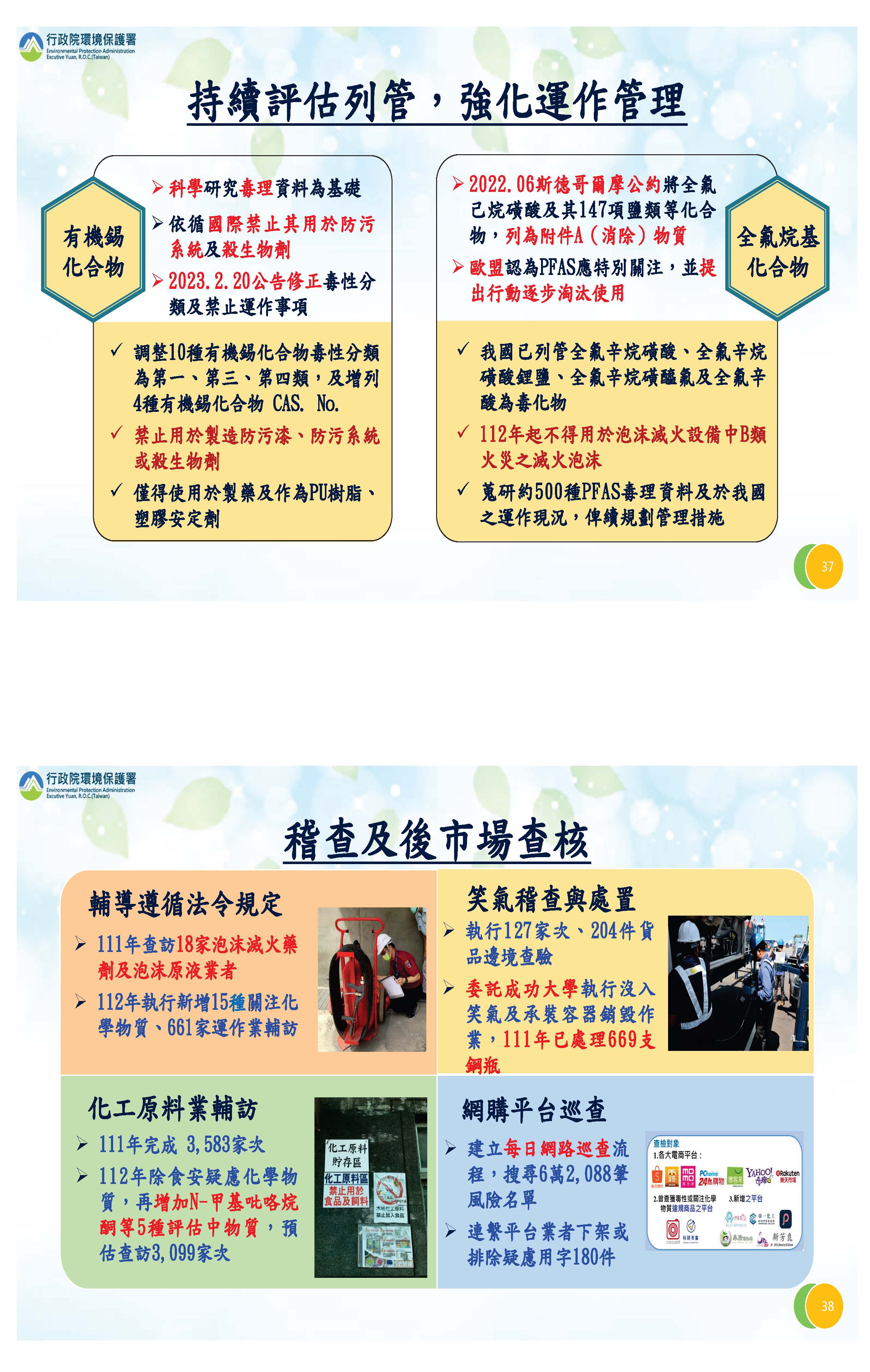 對於健康化學環境以及防救能力的部分,持續評估相關化學品的列管,這一期增加了有機錫化合物的管制跟禁用,在全氟烷基化合物部分,也跟隨國際趨勢,增加一些限用規定。對於化學品的管理,除了稽查這些製造廠,要求他們依法執行外,也針對化工原料行進行訪視,避免他們有誤賣誤用情況。另外也加強對網路販賣的巡查,針對最重要的笑氣部分,我們採專案執行,因為它會傷害學生及青年人的健康,所以我們結合財政部、警政署等等,大家一起來執行,效果也很好。