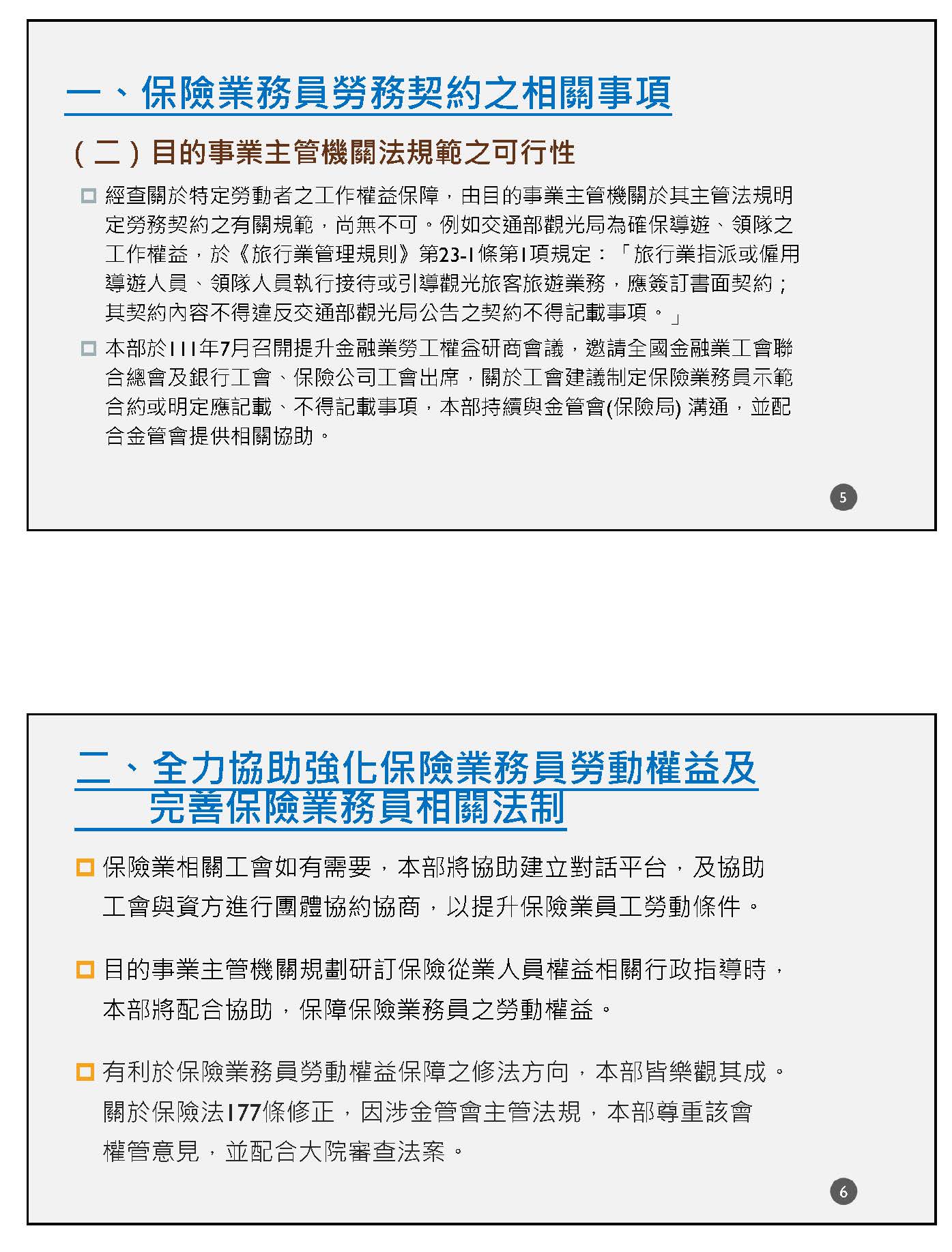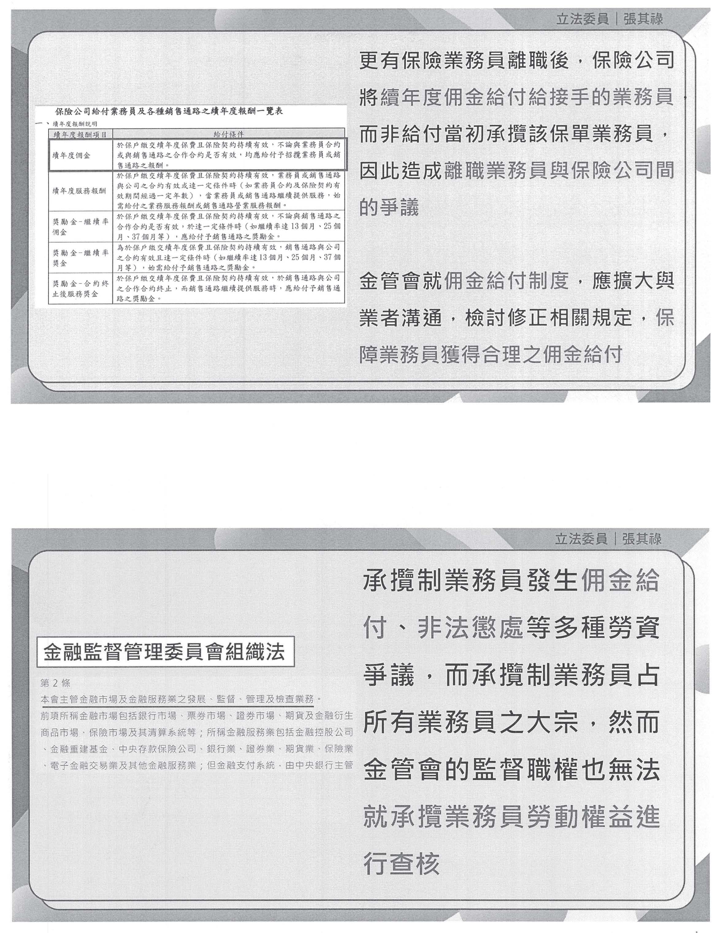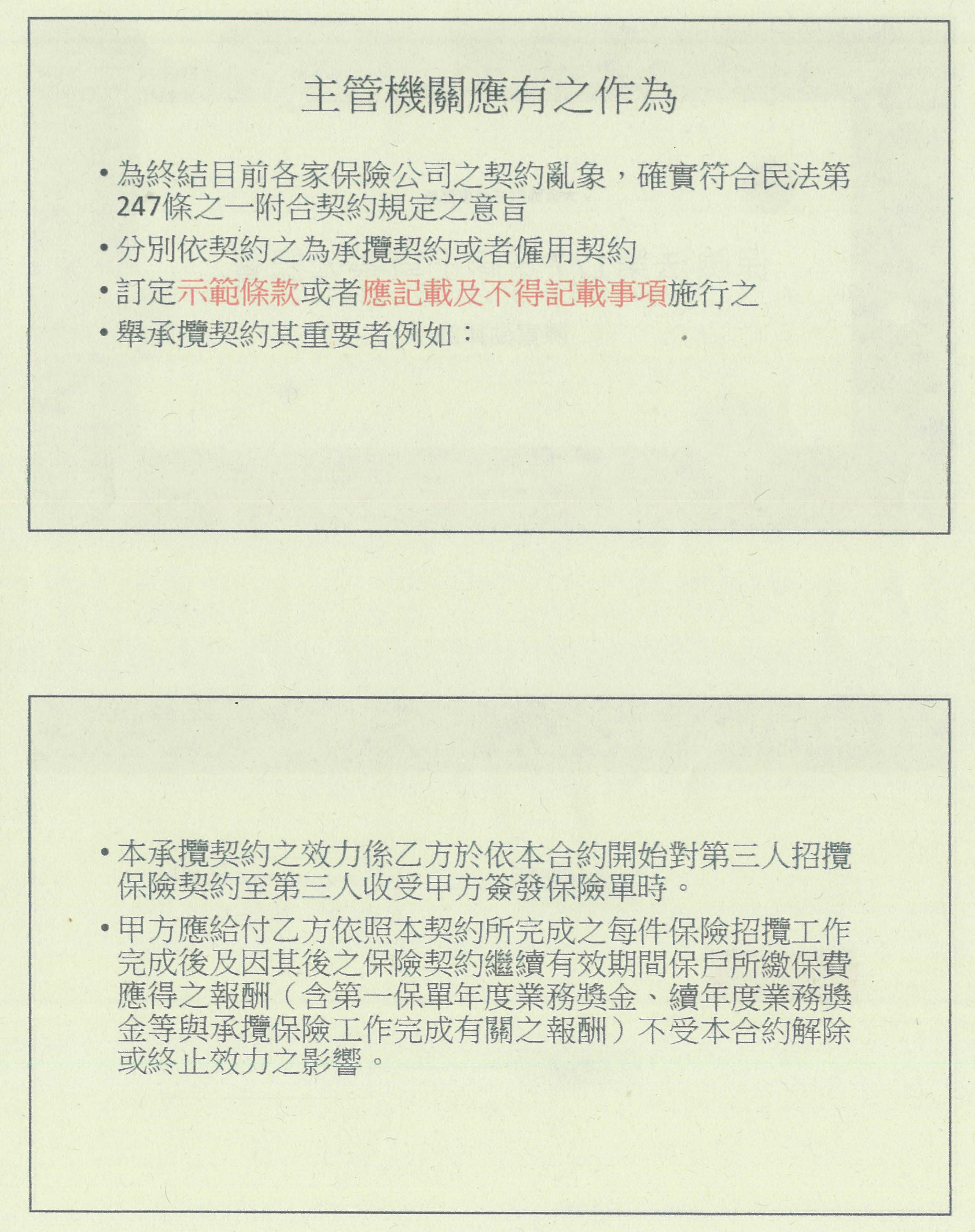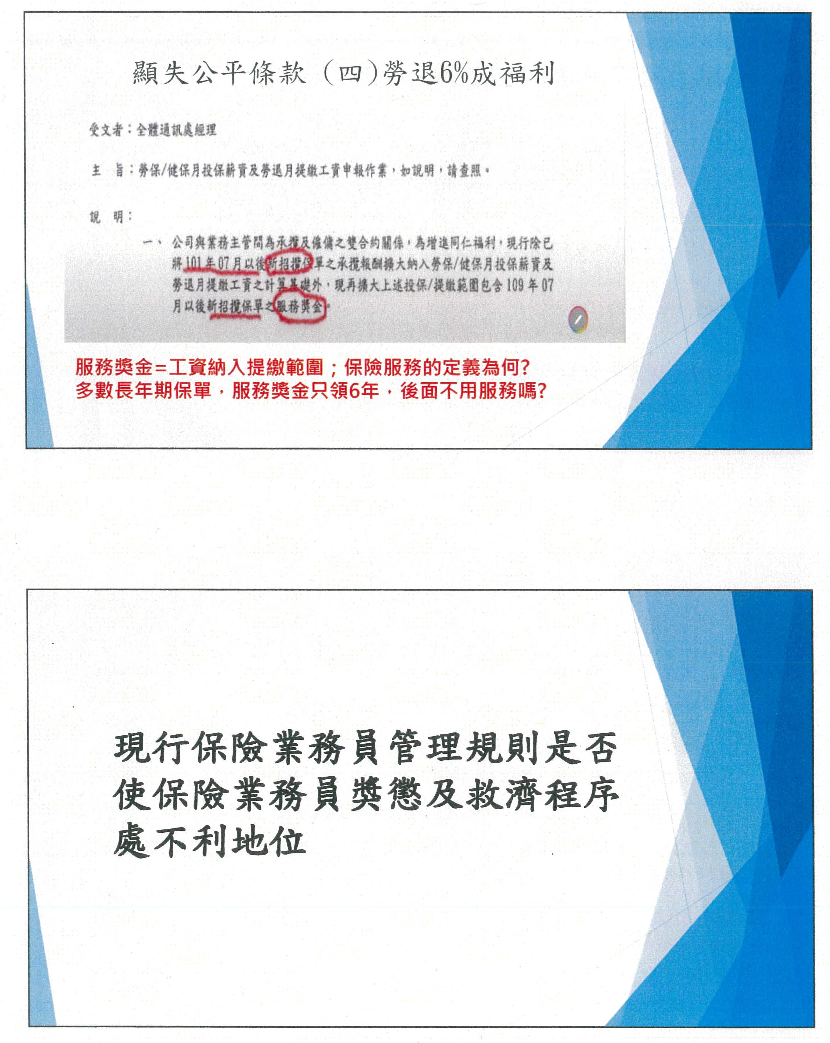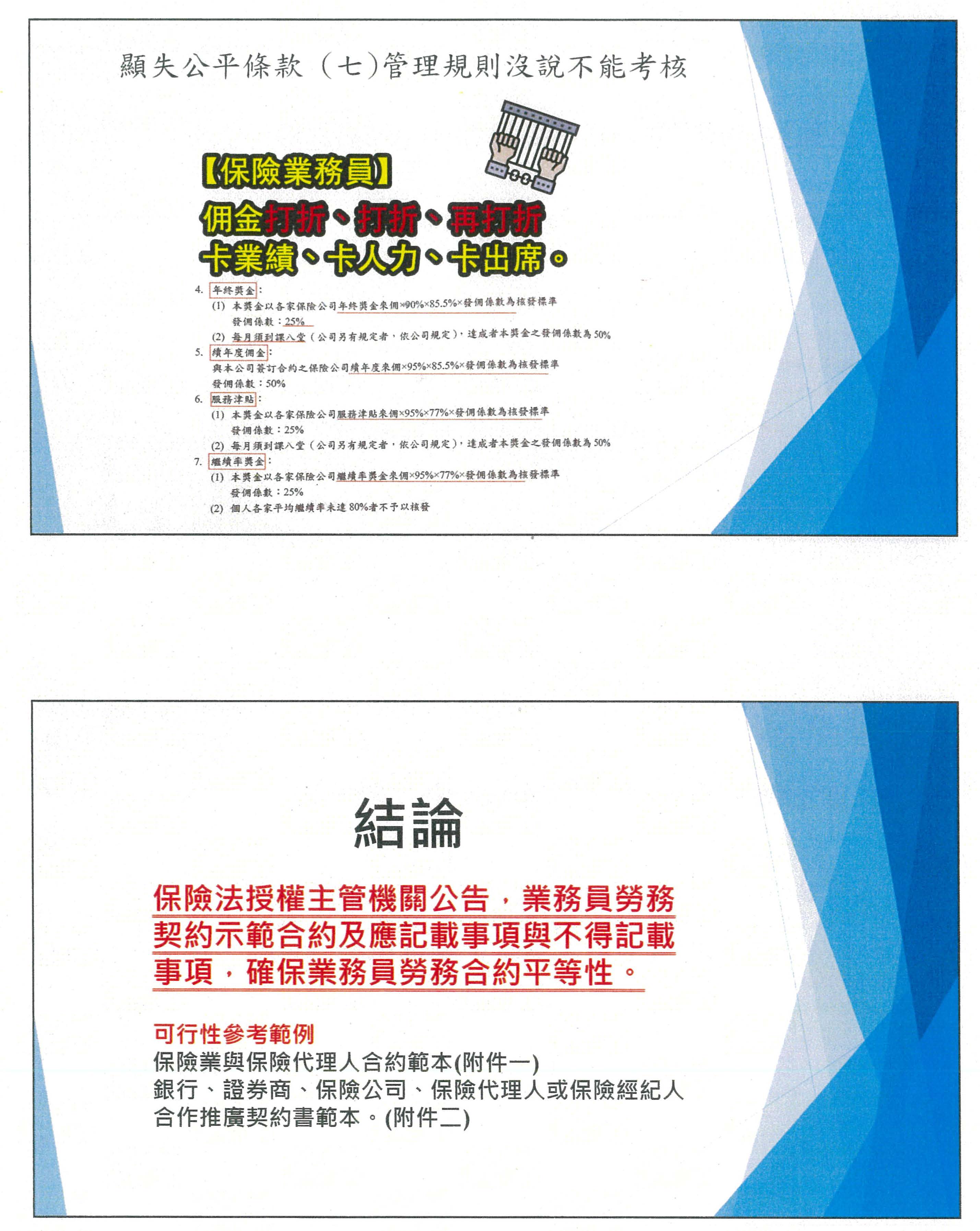 最後還請保險局幫我看一下簡報上的這個文,這個文就是在告訴我們,假設業務員簽的是承攬合約,當他沒有辦法工作的時候,保險公司就須要有業務員檢舉,讓他提出終止契約。試問這個文是保險局同意的,還是保險公司壽險同業公會同意這樣做的?委員、長官,我要在此提出,這樣就是不公平。我們希望這個部分可以得到一些論述上和實質上的改變,這樣對業務員才是好的,謝謝。