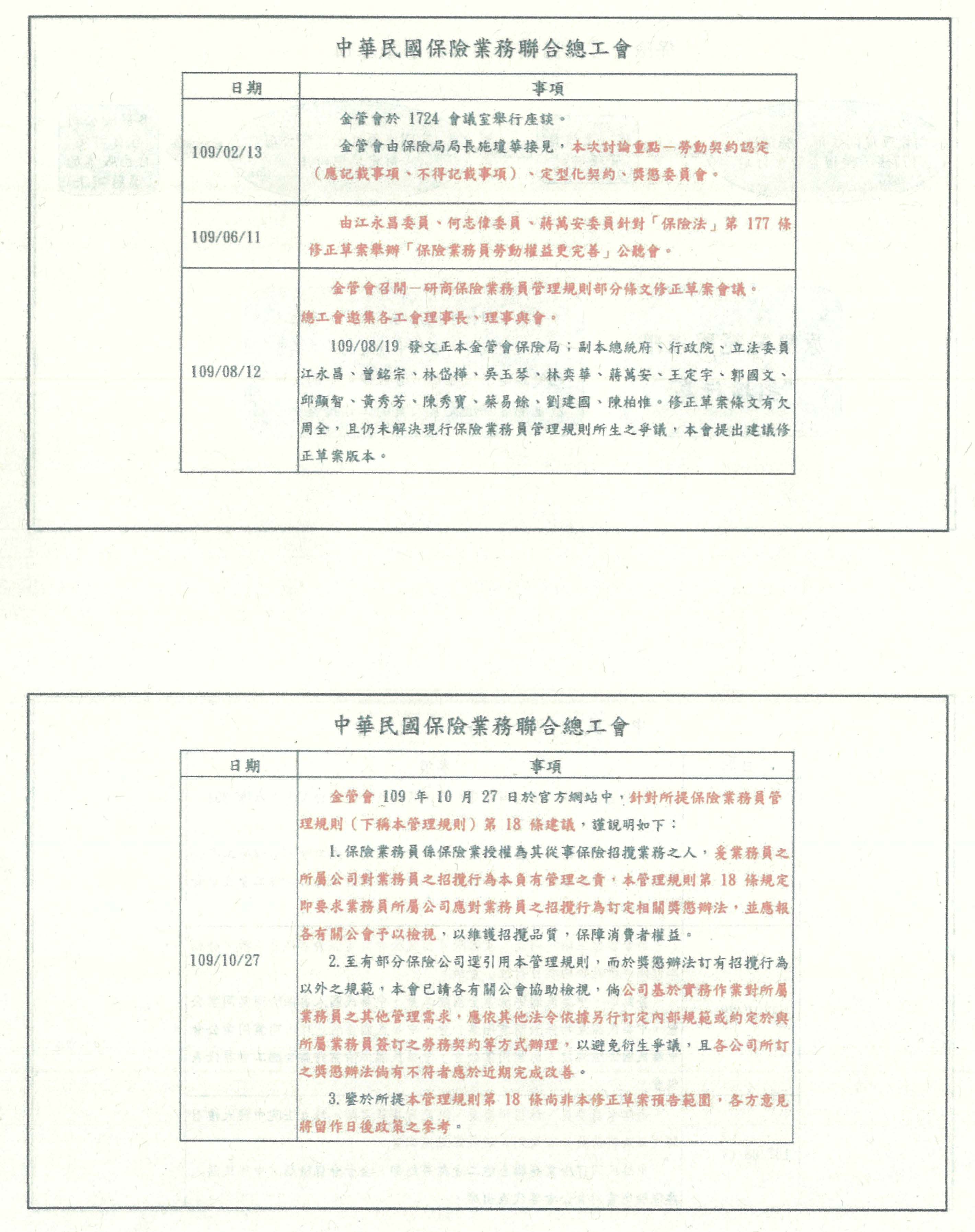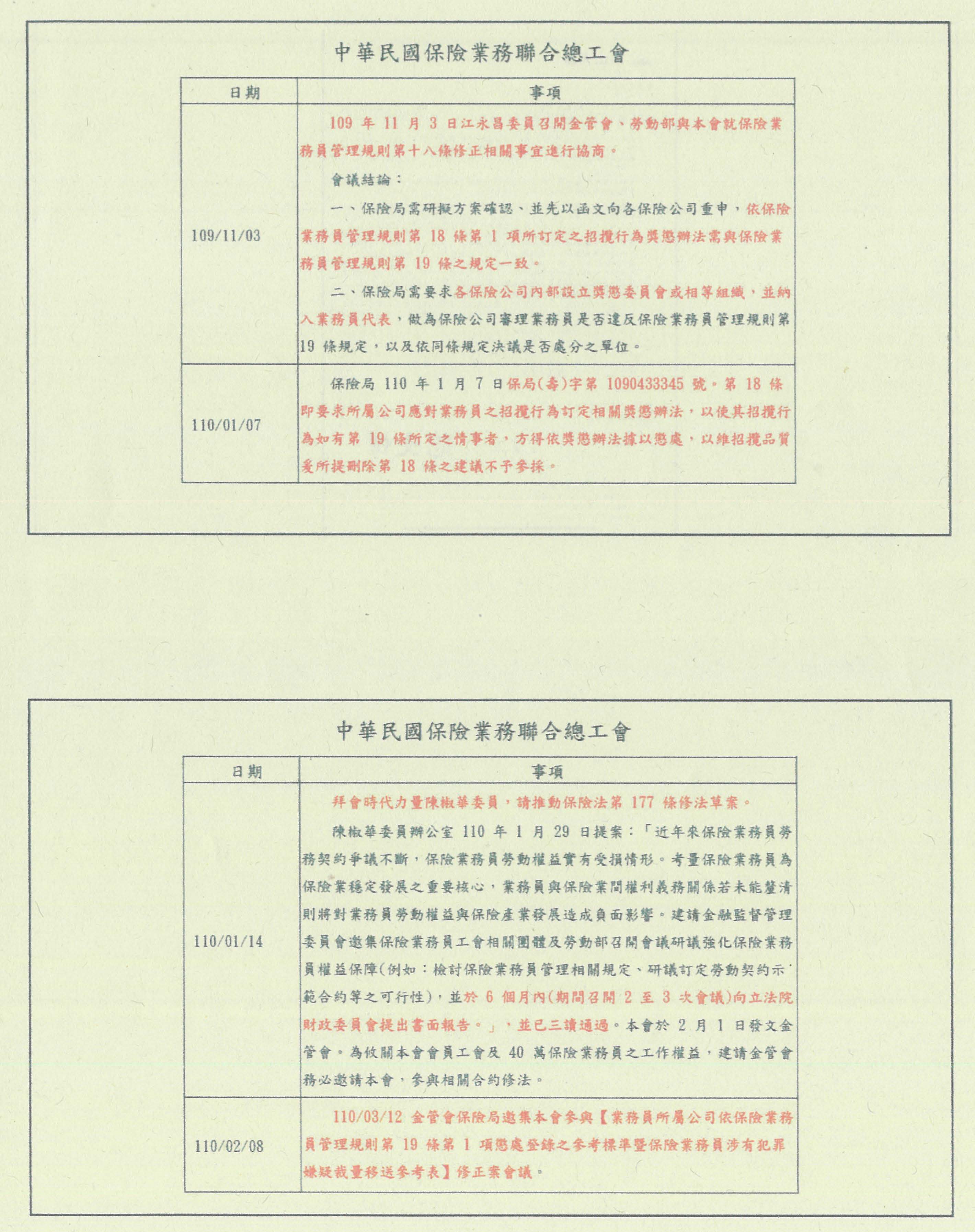 我們在去年7月有召開一場金融業勞工權益研商會議,今天在座的全國金融業工會聯合總會鍾理事長也帶了很多夥伴來跟我們一起討論,確實工會不斷跟我們提到,我們跟金管會可不可以一起努力來訂定應記載、不得記載事項,讓從業的所有業務員能得到權益的確保,這部分我們會繼續跟金管會一起努力。