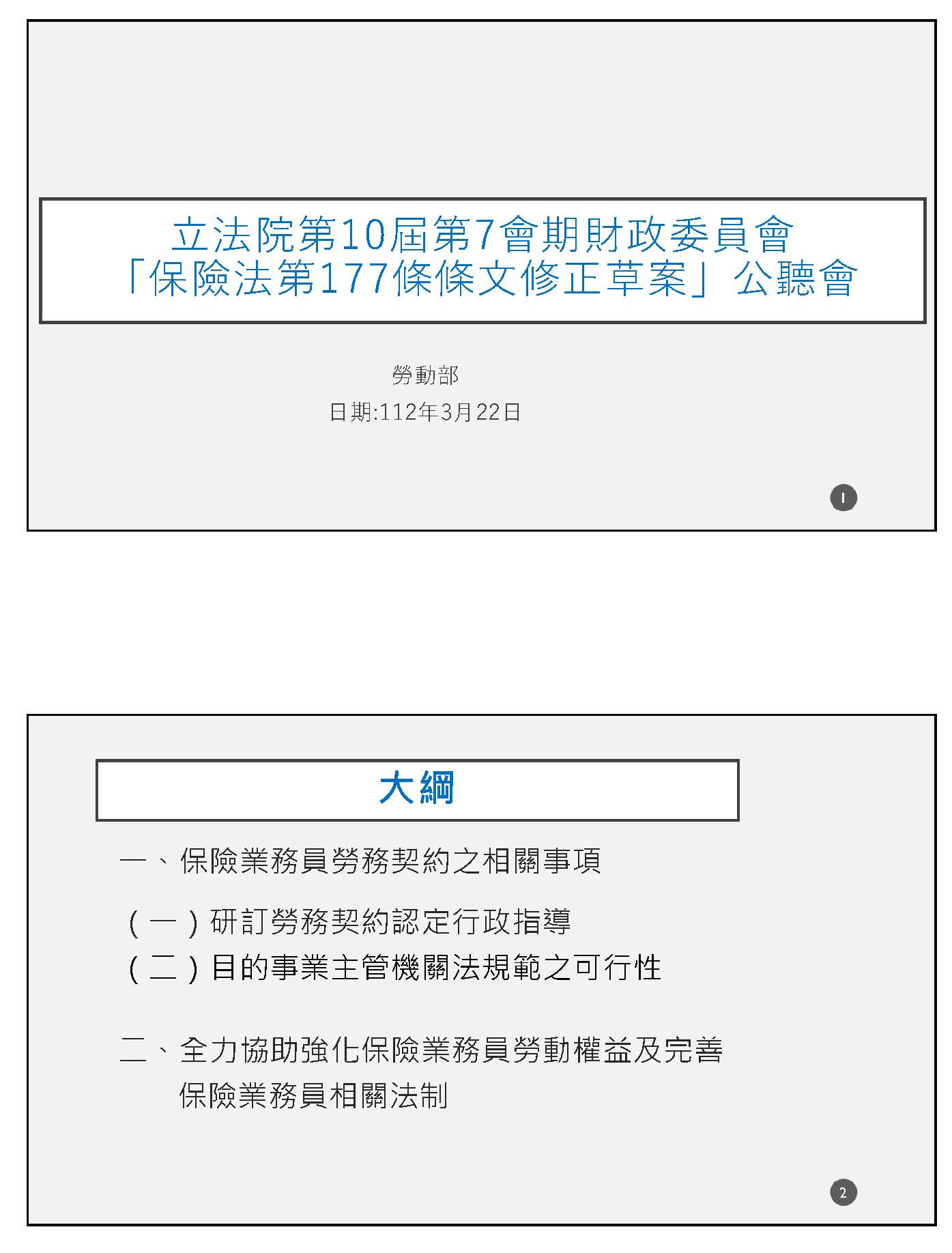 王司長厚偉:主席、各位與會的先進、學者專家、各位公會代表及各位伙伴。今天財政委員會召開有關「保險法第一百七十七條條文修正草案」公聽會,勞動部在此表示幾點看法。