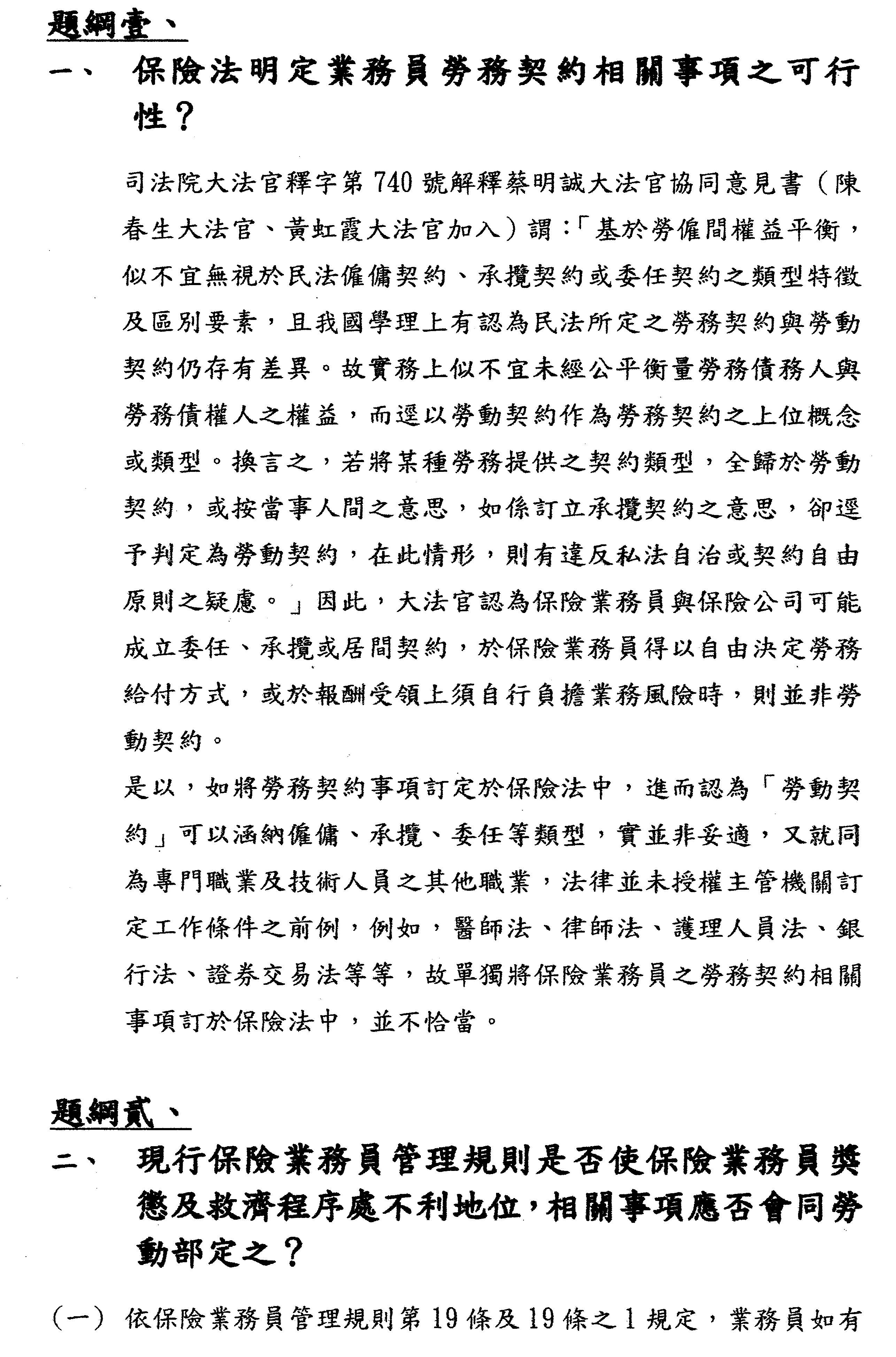 一、釋字第740號文未能解決保險公司與業務員契約關係認定歧異,保險法明定業務員勞務契約相關事項之可行性