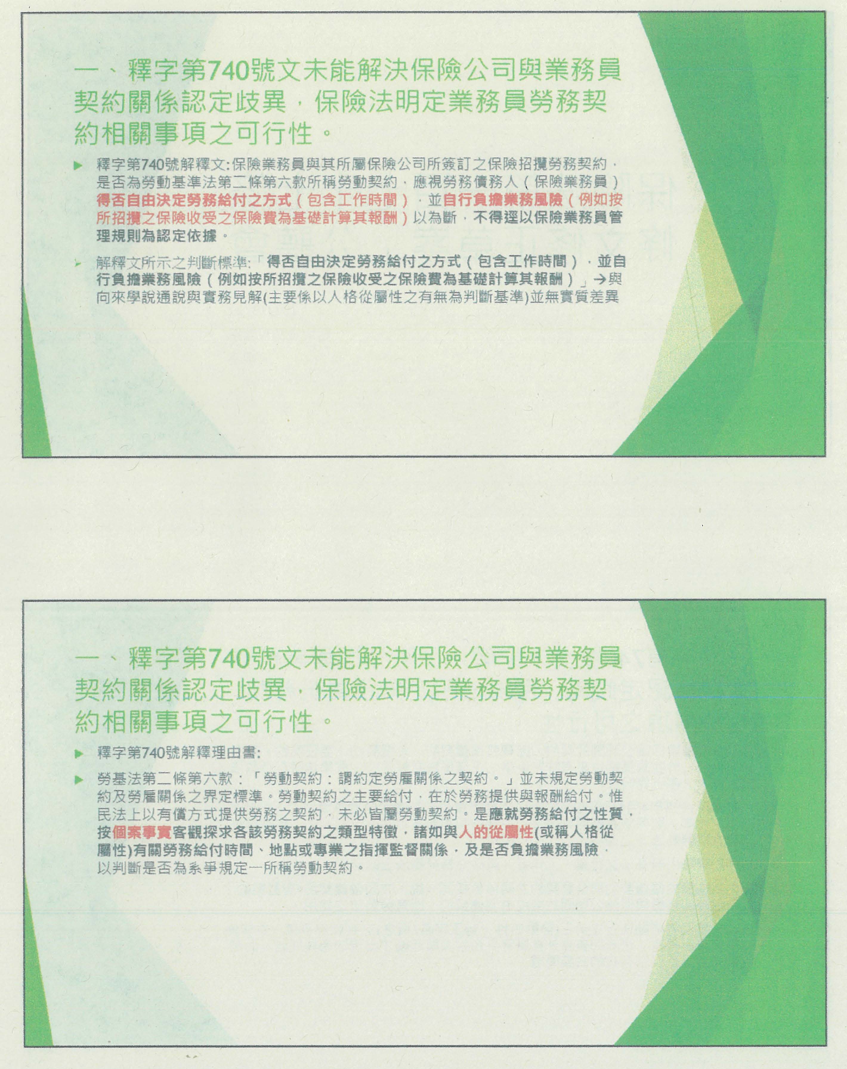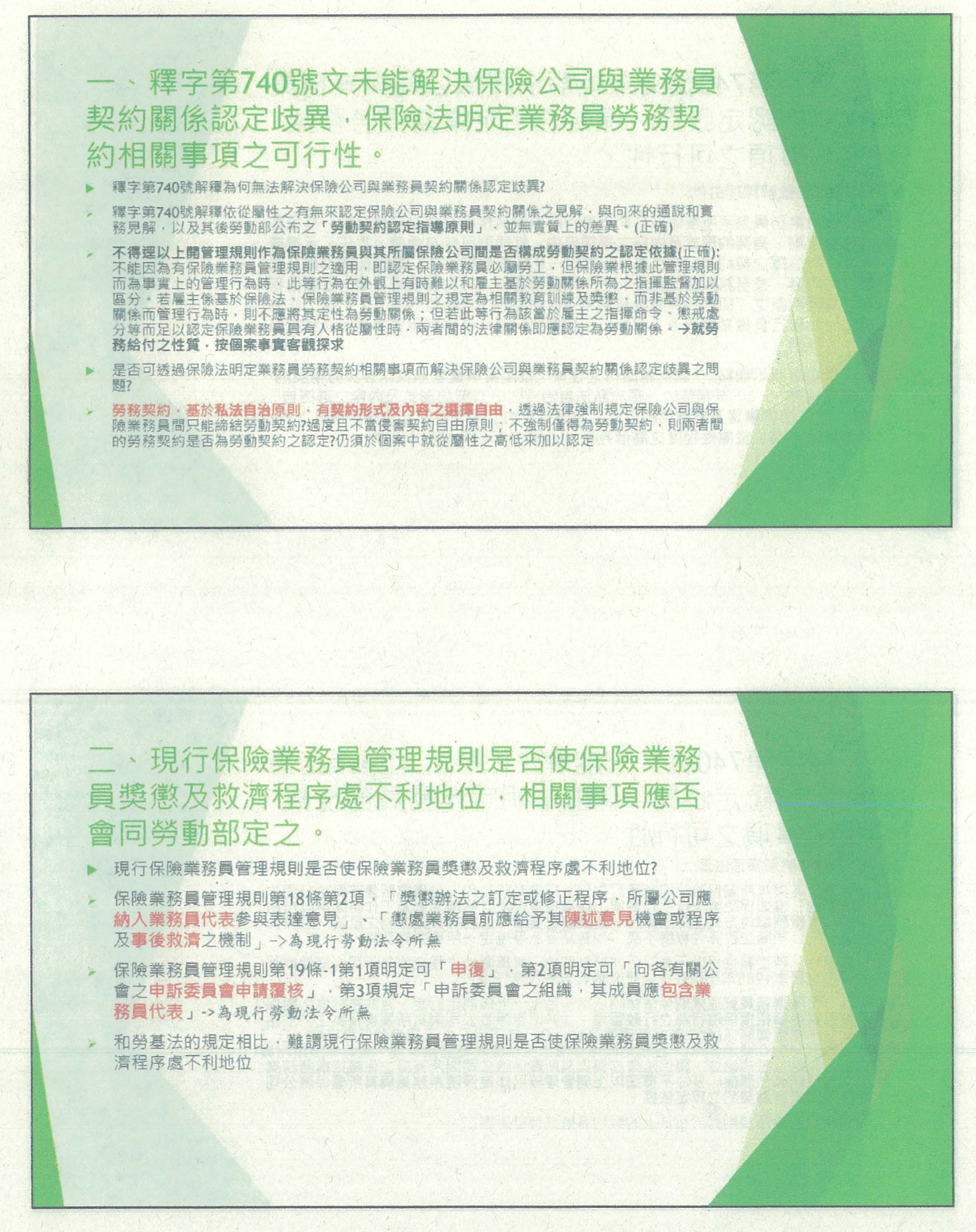 再來,我要特別強調,工會是贊成保險業務員管理規則的,所以不要再提我們反對保險業務員管理規則,我們是反對裡面沒有顧慮到勞工權益的條款,比如我解釋一下,司法院釋字第740號解釋文雖然提到工作時間自由、自負盈虧,可是還是有提到無底薪及一定業績要求。大家思考一下,當740號解釋文說工作時間自由,公司馬上會怎麼調整?大家不要再簽到了,晨會自由報到就可以了,它很容易就解決。自負盈虧的部分,影印開始要收費了,本來不用收費,現在變成要收費了。第三,無底薪,本來主管有津貼,取消了。第四,無一定業績要求,他就矇著眼睛說,它沒有說不可以,所以他照做;有業績要求者就繼續維持業績要求。所以我認為身為公司的法務,律師法第一條就說「律師以保障人權,實現社會正義及促進民主法治為使命。……維護社會公義及改善法律制度。」對於無一定業績要求,公司應該看著740號解釋文說,承攬就是無底薪及一定業績要求,而不能把它切一段,把這段做對他有利的論述。