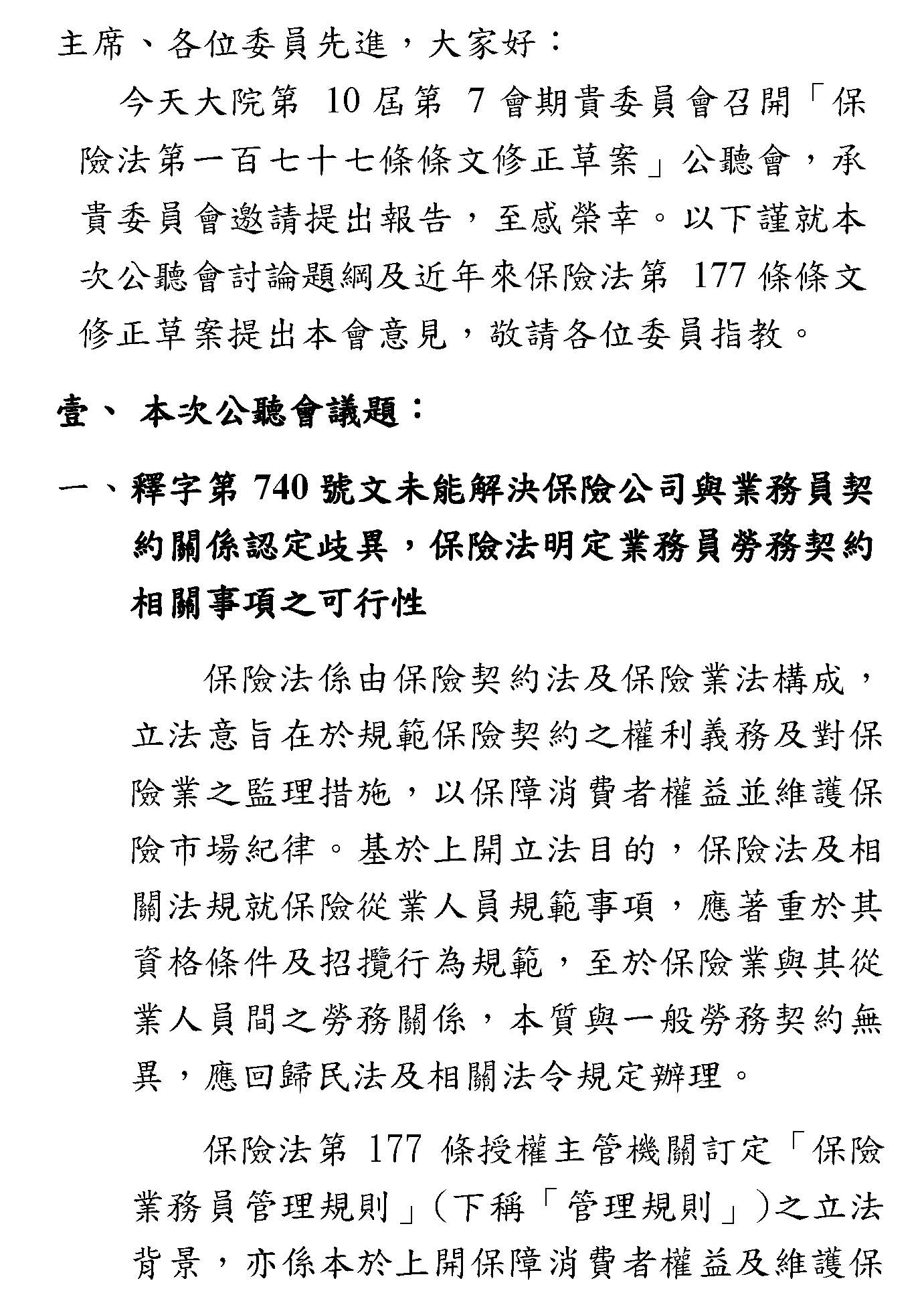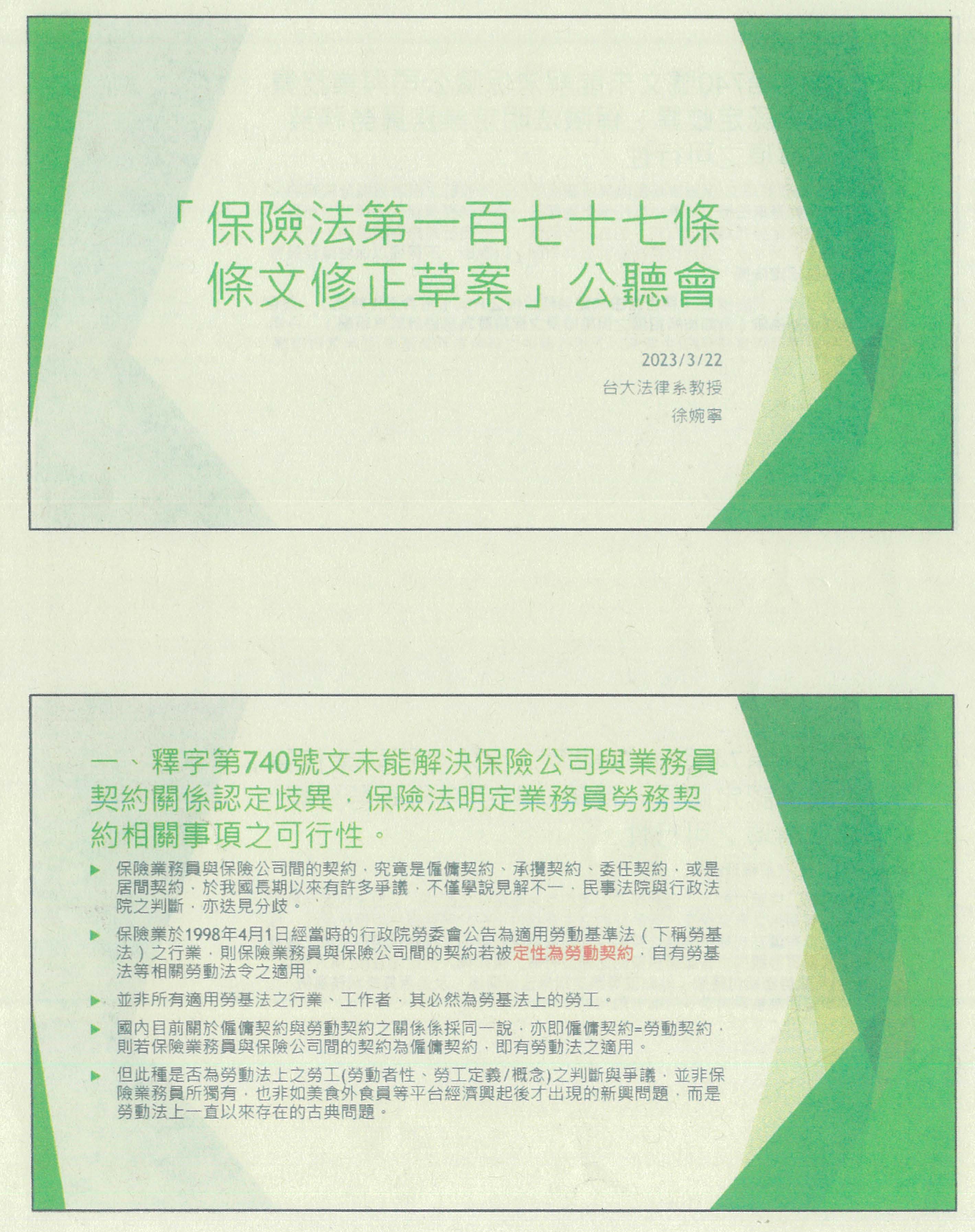 第一點,提到由保險法來明定業務員的勞務契約這部分,我們的看法還是會認為,現在去檢視一些專門職業人員的法令,似乎並沒有看到類似的規定,在這樣的情況下,剛剛葉啟洲老師和陳俊元教授也有提到,保險法是由保險契約法跟保險業法所組成的,保險業法的部分主要是針對保險業的財務業務層面,等於是以市場監理跟消費者保護等等面向去訂定相關的規範,甚至還有一些後面的罰則。如果是一個勞務給付型態的規範,以保險法本身原先的定性來講,並不是要去解決保險公司跟業務員之間的勞務契約關係,在這種情況下,適不適合在保險法裡面去訂定這樣的規範,我想這個部分在壽險公會的立場可能是持比較保留的態度。