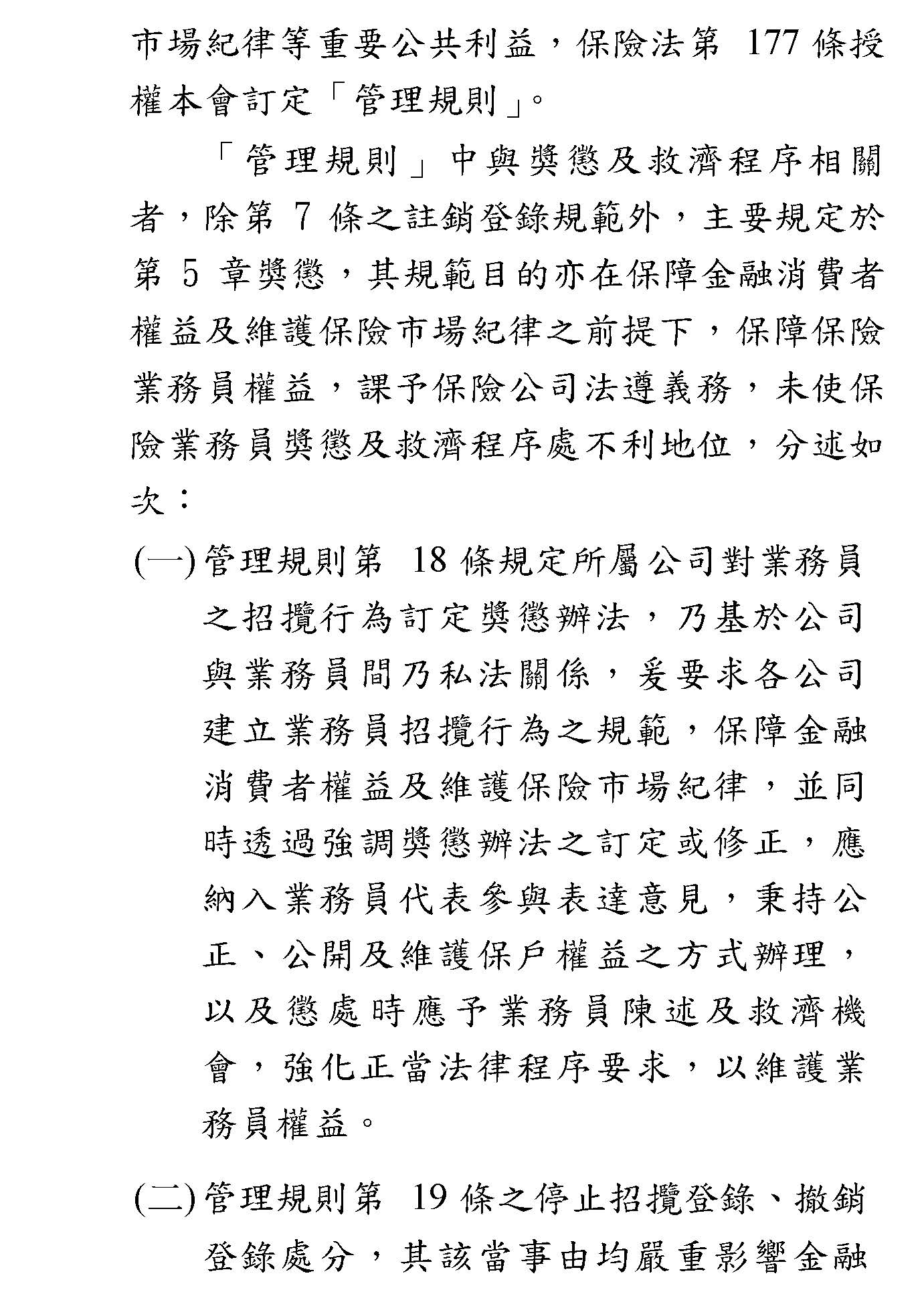(一)管理規則第18條規定所屬公司對業務員之招攬行為訂定獎懲辦法,乃基於公司與業務員間乃私法關係,爰要求各公司建立業務員招攬行為之規範,保障金融消費者權益及維護保險市場紀律,並同時透過強調獎懲辦法之訂定或修正,應納入業務員代表參與表達意見,秉持公正、公開及維護保戶權益之方式辦理,以及懲處時應予業務員陳述及救濟機會,強化正當法律程序要求,以維護業務員權益。