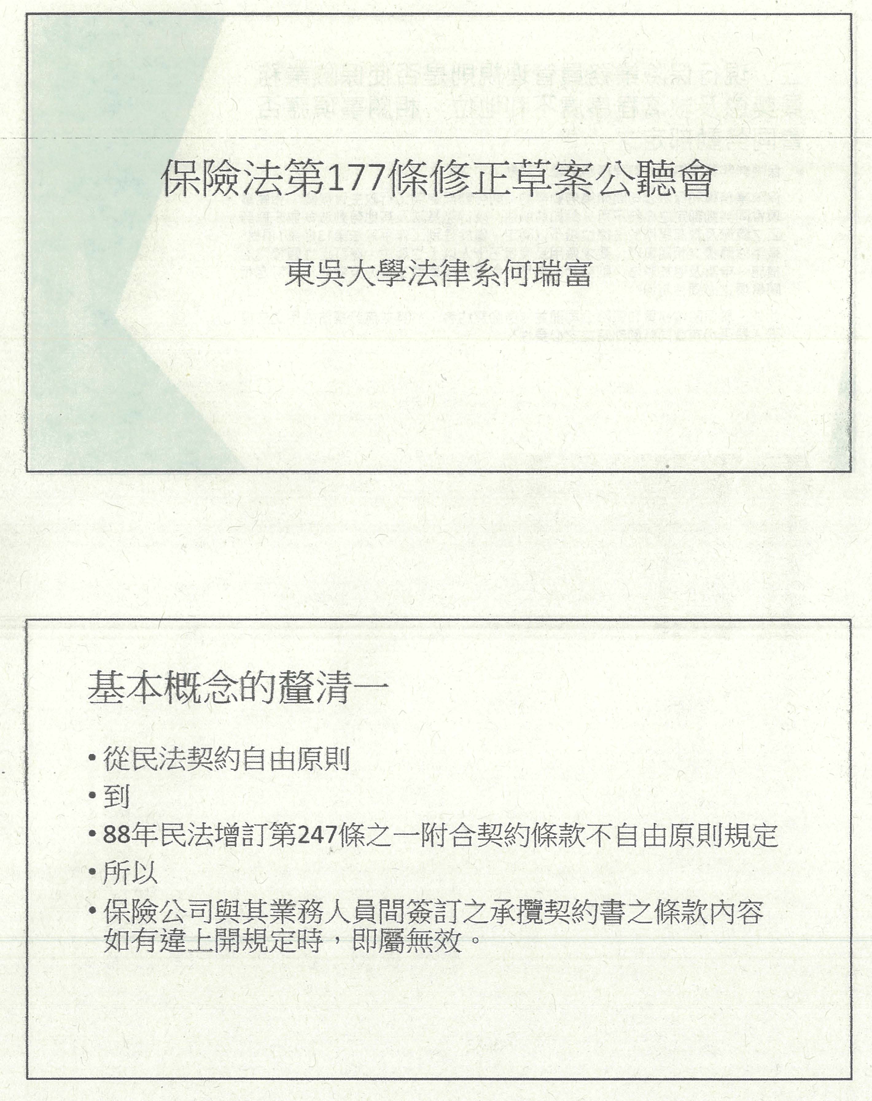 何瑞富副教授:主席、各位前輩、先進、記者朋友們,今天很高興能夠來到這邊跟大家一起討論有關於保險法第一百七十七條條文修正草案的問題。剛剛主席也特別講到我們要建立一個和諧的社會,對於勞工權益應該要加以保障,這是一個非常大的原則,剛剛幾位老師也有提到釋字第740號解釋,釋字第740號解釋並沒有說保險公司的業務人員到底是要採取僱傭契約或是承攬契約,當然這是所謂的契約自由原則,但是基本上也提供了兩個選擇的方式。要跟各位報告的就是,在這兩個選擇之下,有兩個基本概念需要跟大家澄清一下,第一個概念,剛剛也有老師提到,這是一個民法上的契約自由原則,但是我們必須注意一件事,就是民法的契約自由原則到了88年的時候,我們增訂了第二百四十七條之一,這個規定是仿自於消保法第十七條的規定,還有消保法定型化契約的相關規定。