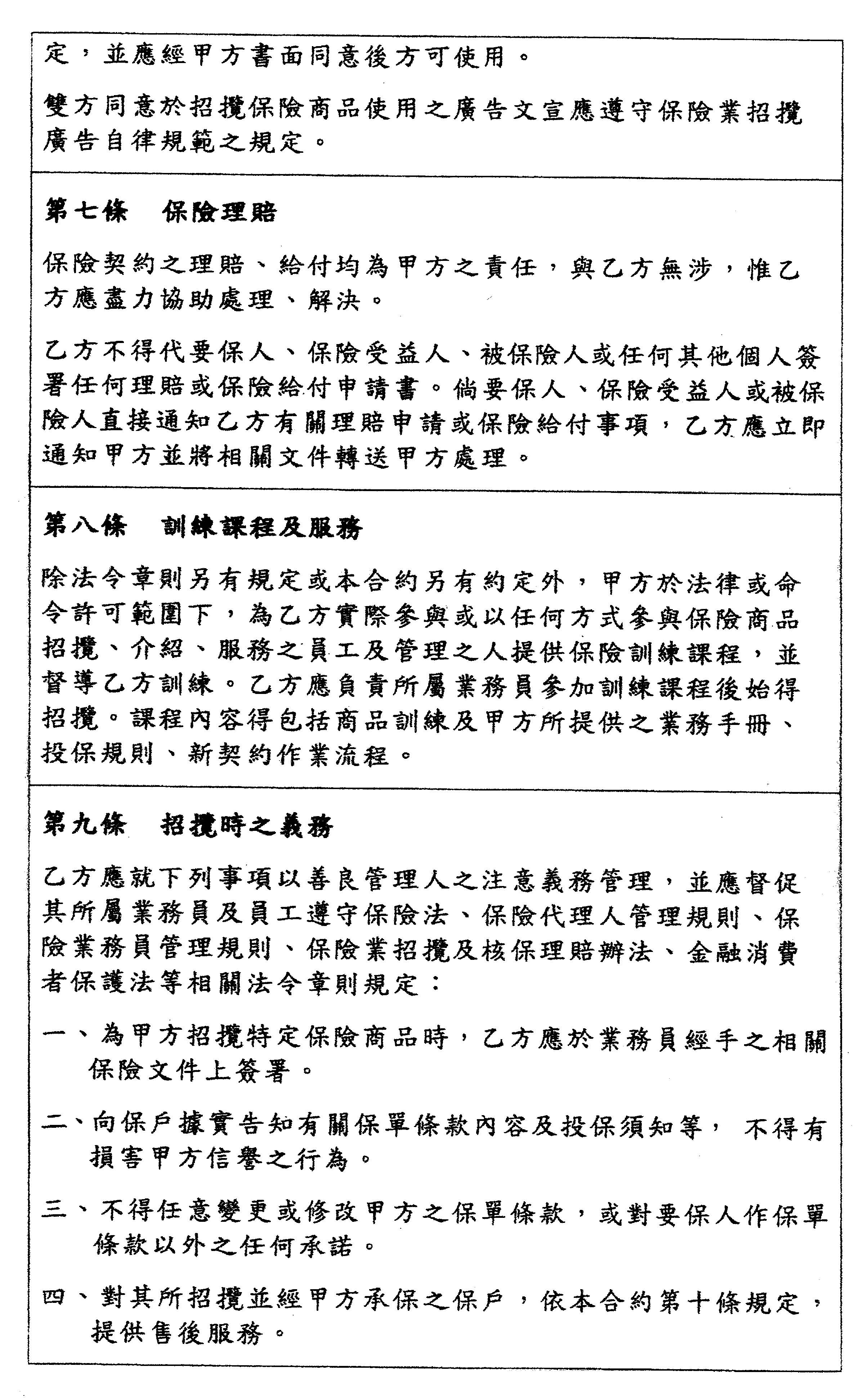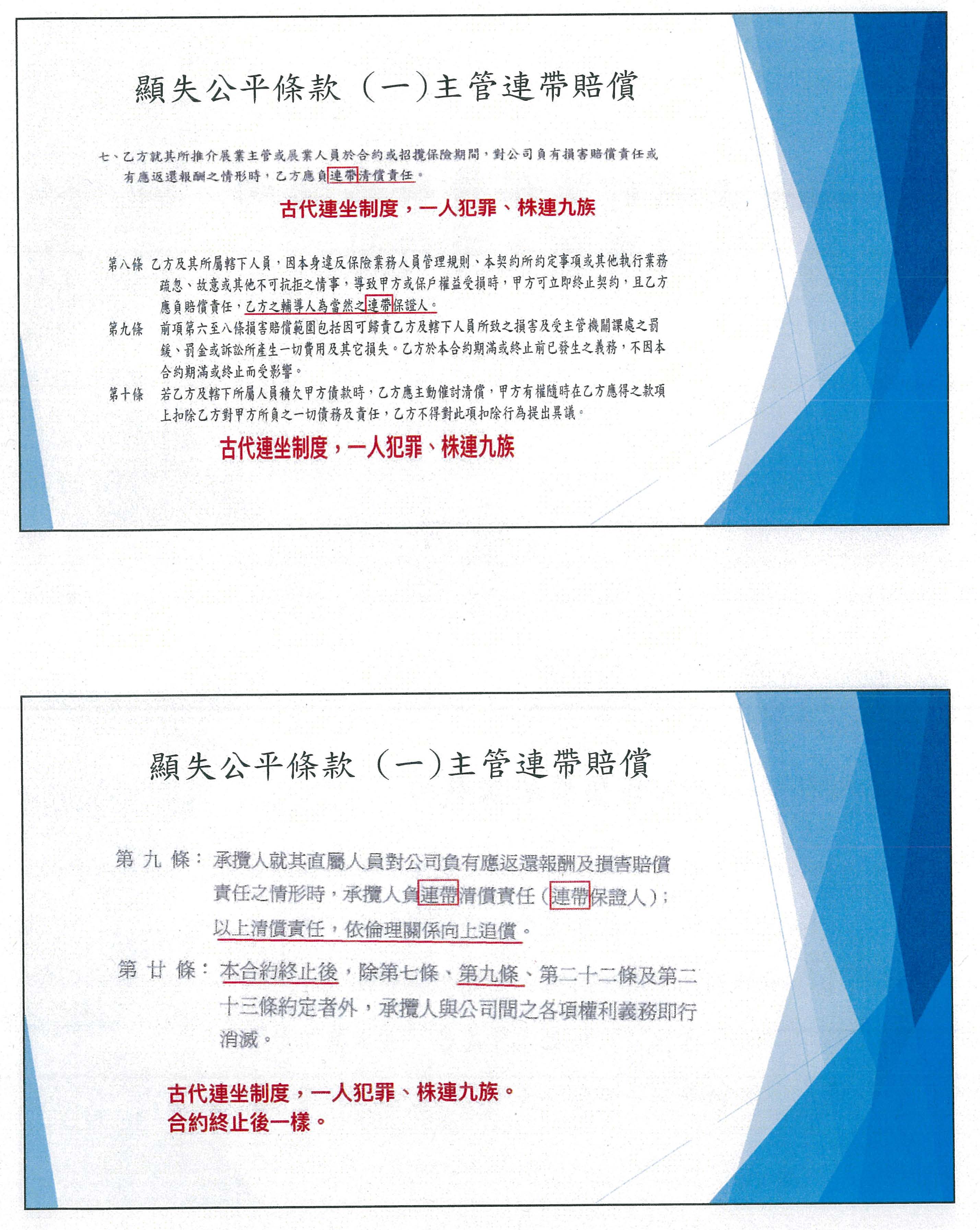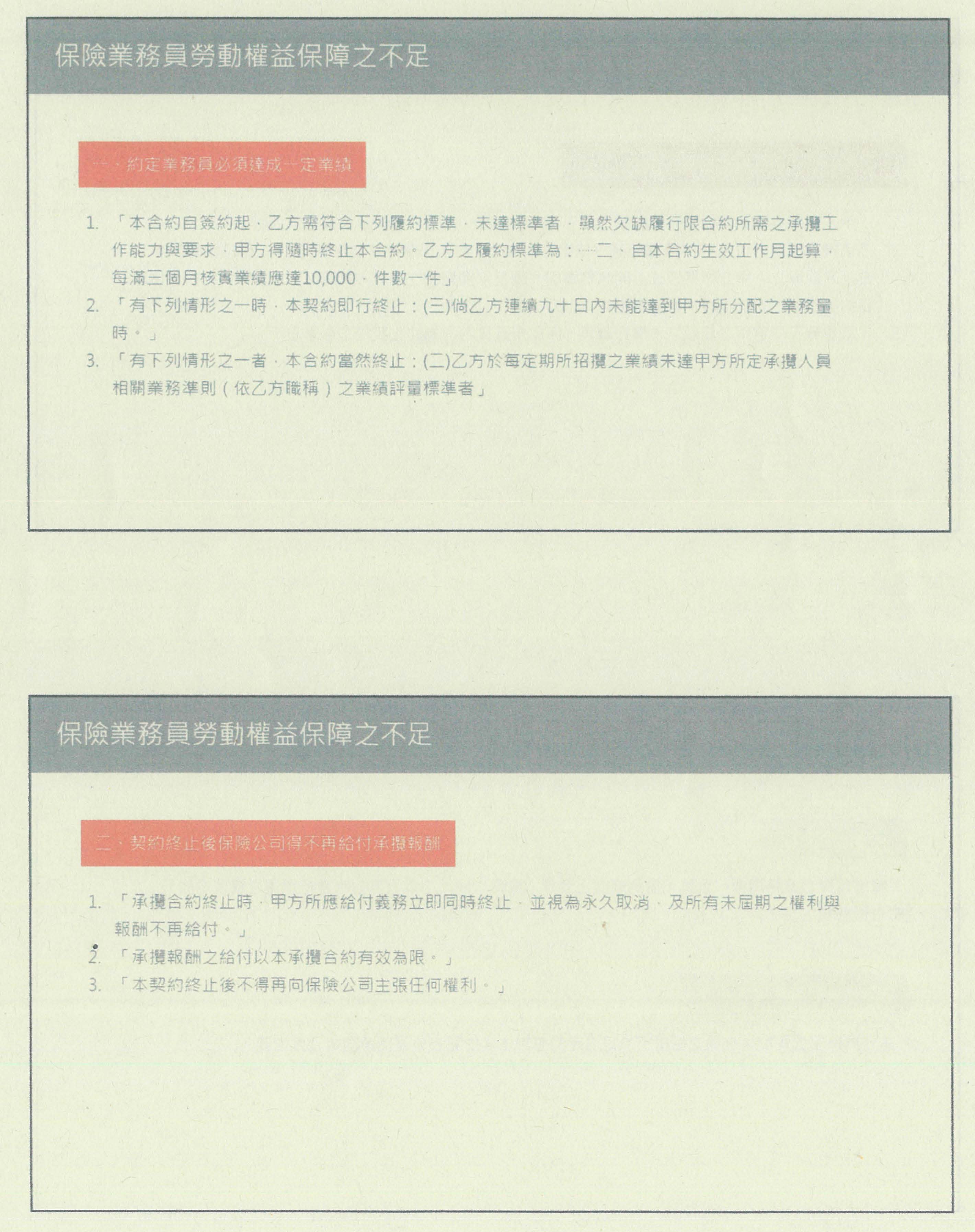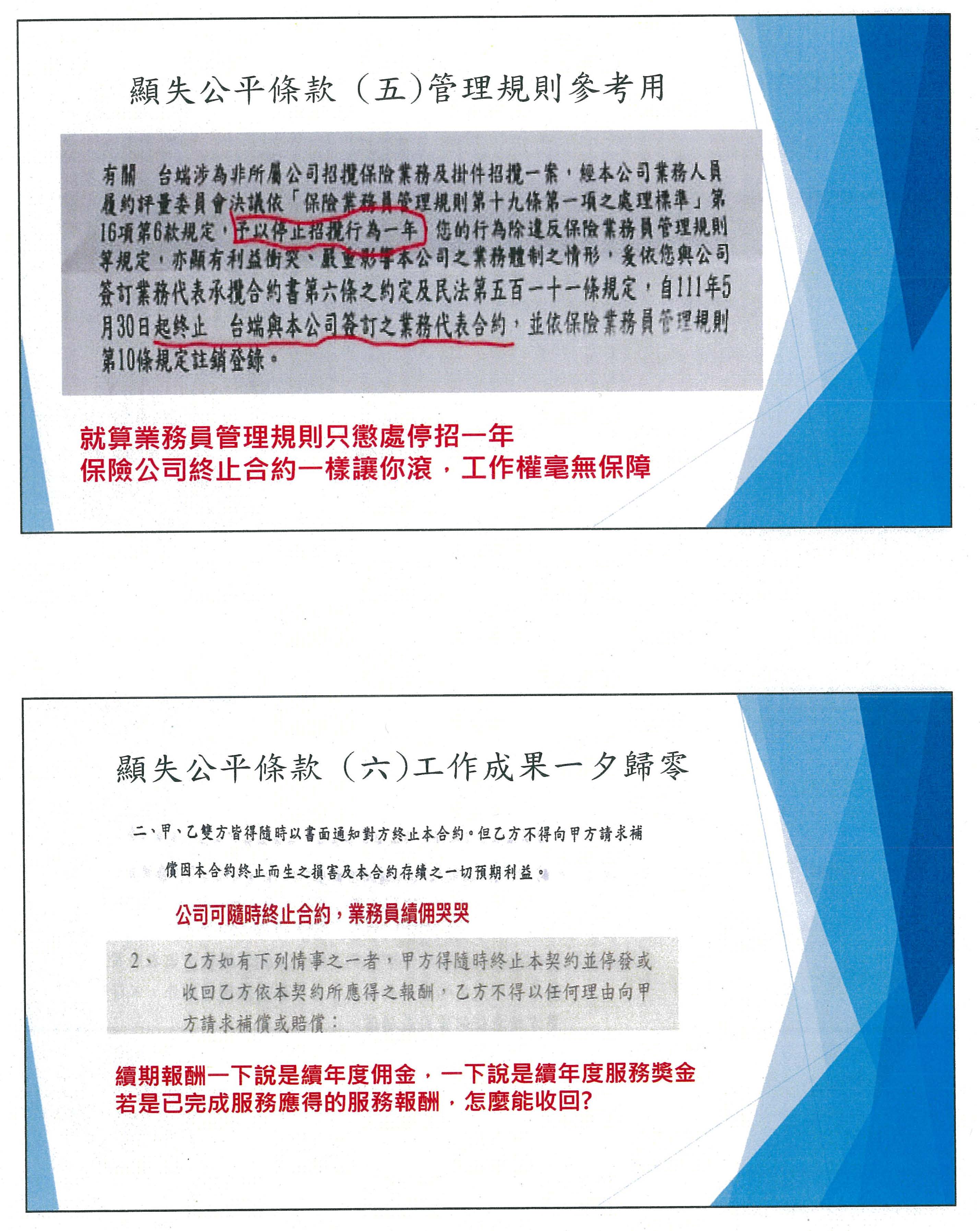 再來,我必須聲明的是,委員剛剛提到,在這裡必須做到社會祥和和勞資和諧,這是我們最終的目的。我們討論了這麼多,也接受業務員必須受到規則的規範和管理,這些我們都能接受,但是有幾個非常顯失公平的問題。公司的合約標題就寫了「承攬合約」,我就簡單地唸幾個裡面的條文。保險公司無須為業務員投保勞、健保,縱使國家法令規定公司必須為業務員投保勞、健保,業務員也必須支付全額的成本,請問這有沒有違反民法第二百四十七條之一顯失公平的規定?