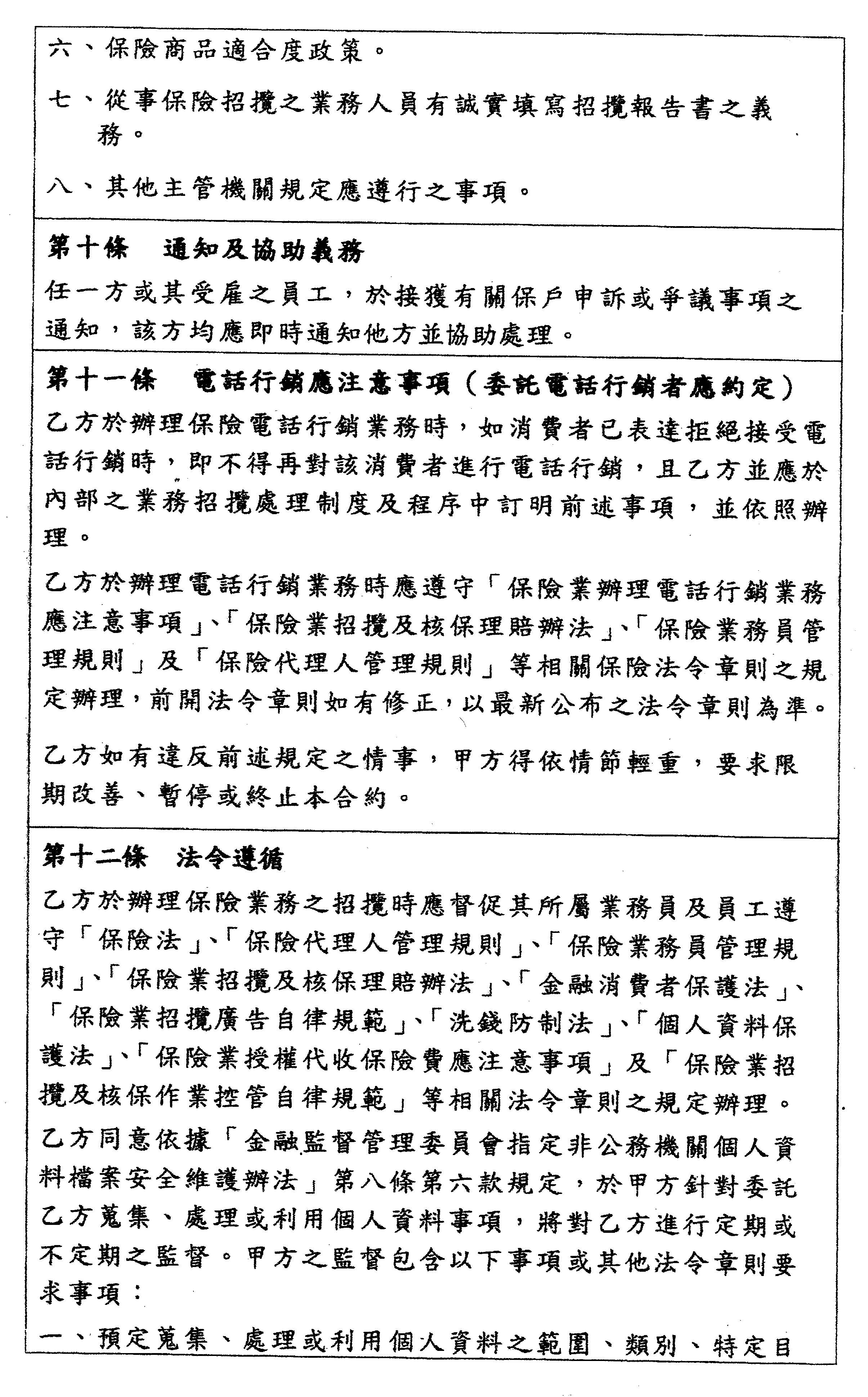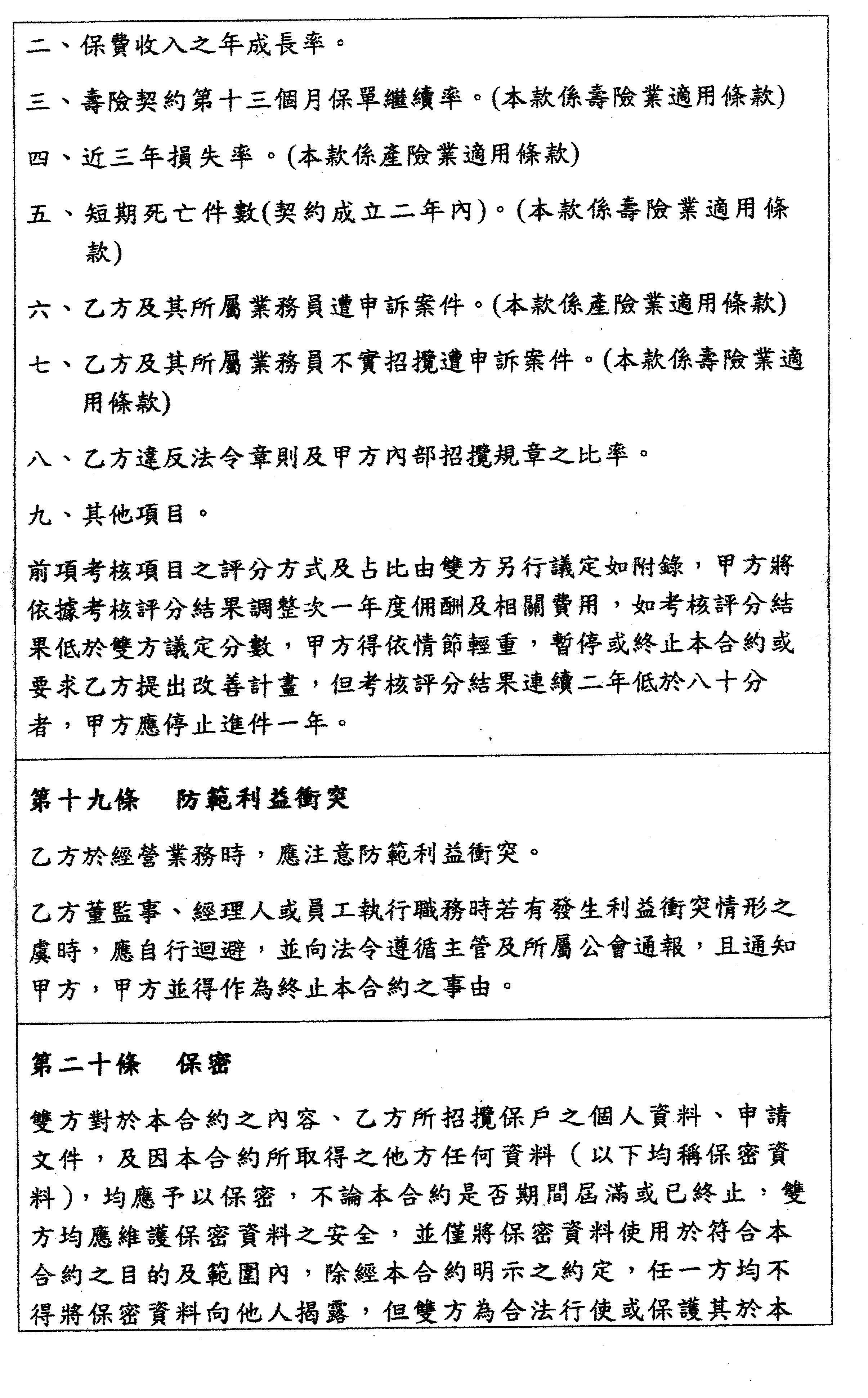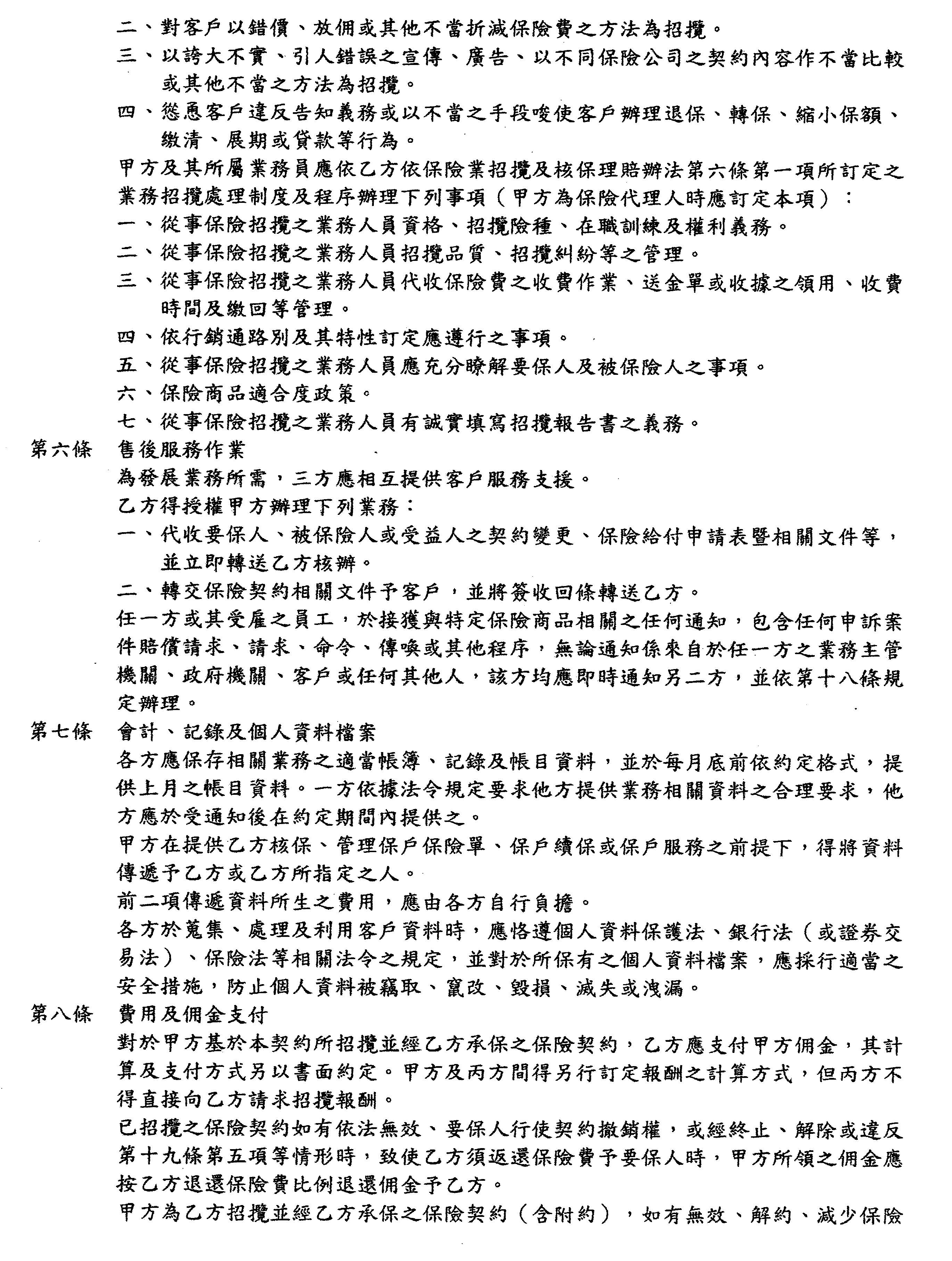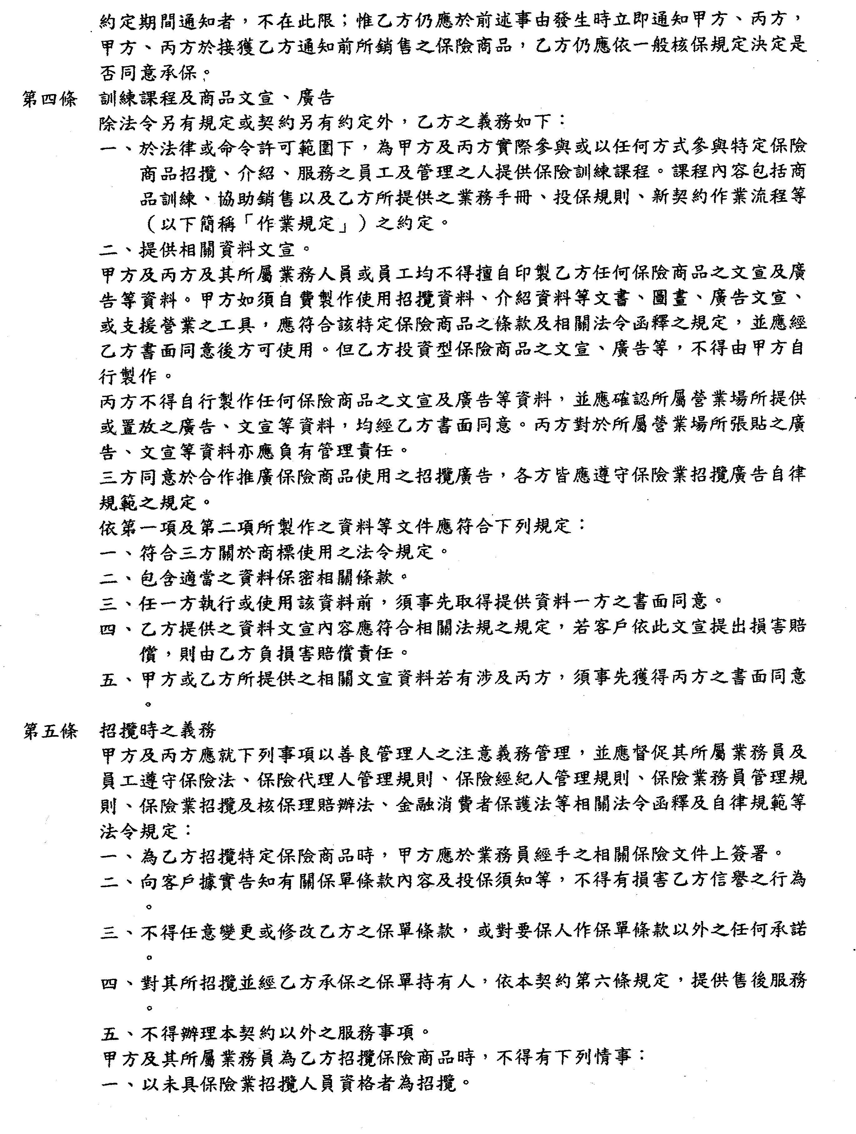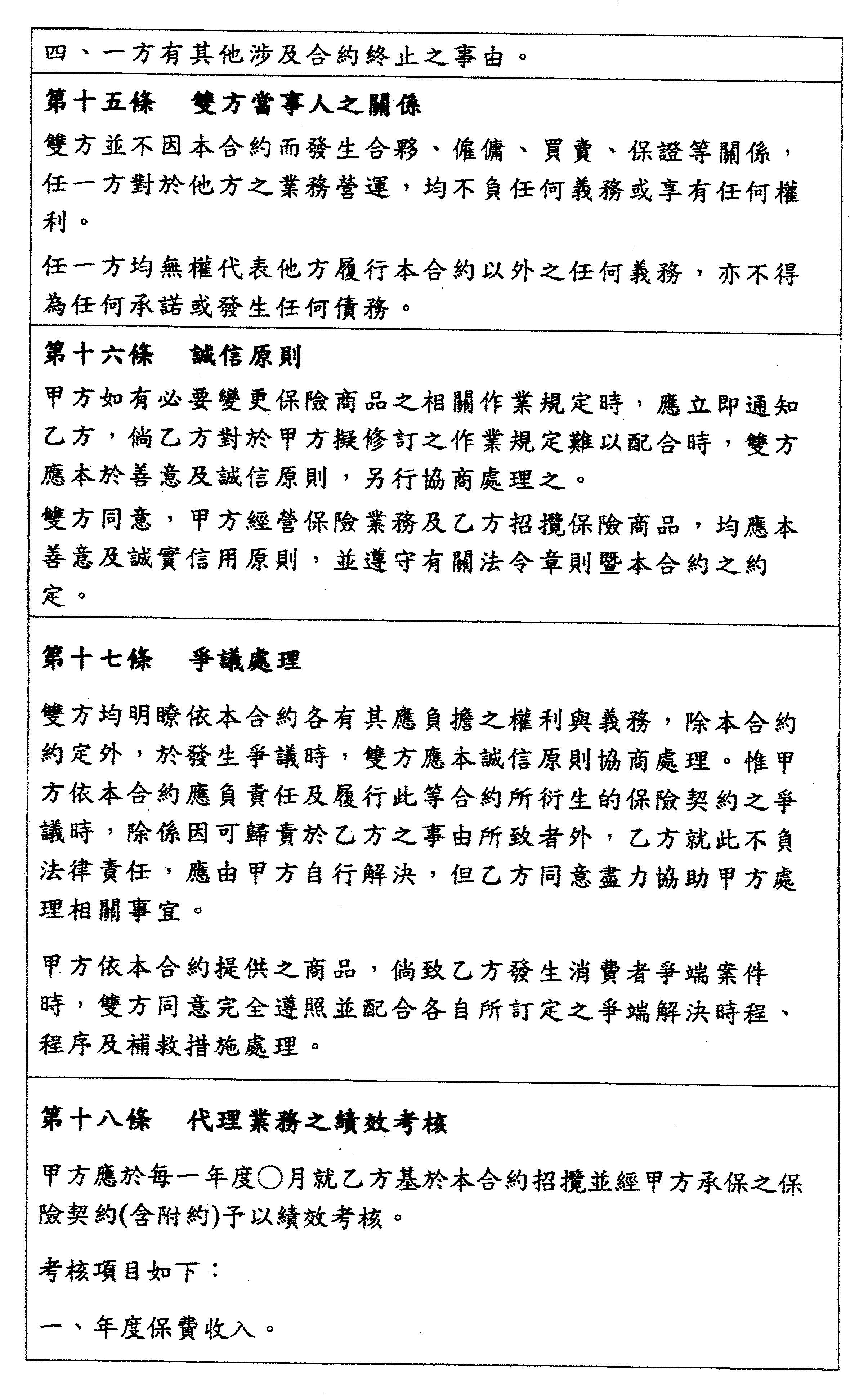 再來,我必須聲明的是,委員剛剛提到,在這裡必須做到社會祥和和勞資和諧,這是我們最終的目的。我們討論了這麼多,也接受業務員必須受到規則的規範和管理,這些我們都能接受,但是有幾個非常顯失公平的問題。公司的合約標題就寫了「承攬合約」,我就簡單地唸幾個裡面的條文。保險公司無須為業務員投保勞、健保,縱使國家法令規定公司必須為業務員投保勞、健保,業務員也必須支付全額的成本,請問這有沒有違反民法第二百四十七條之一顯失公平的規定?