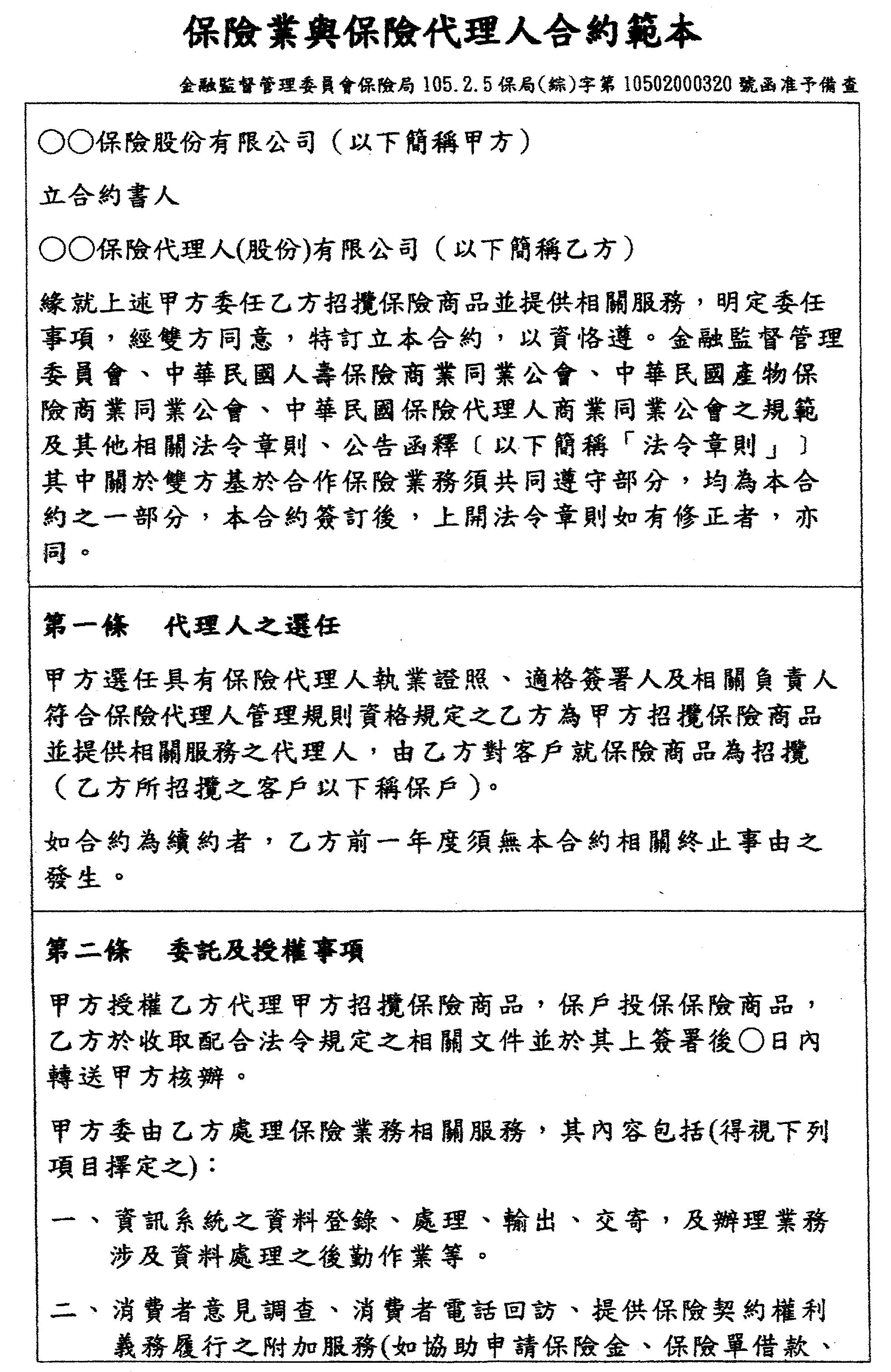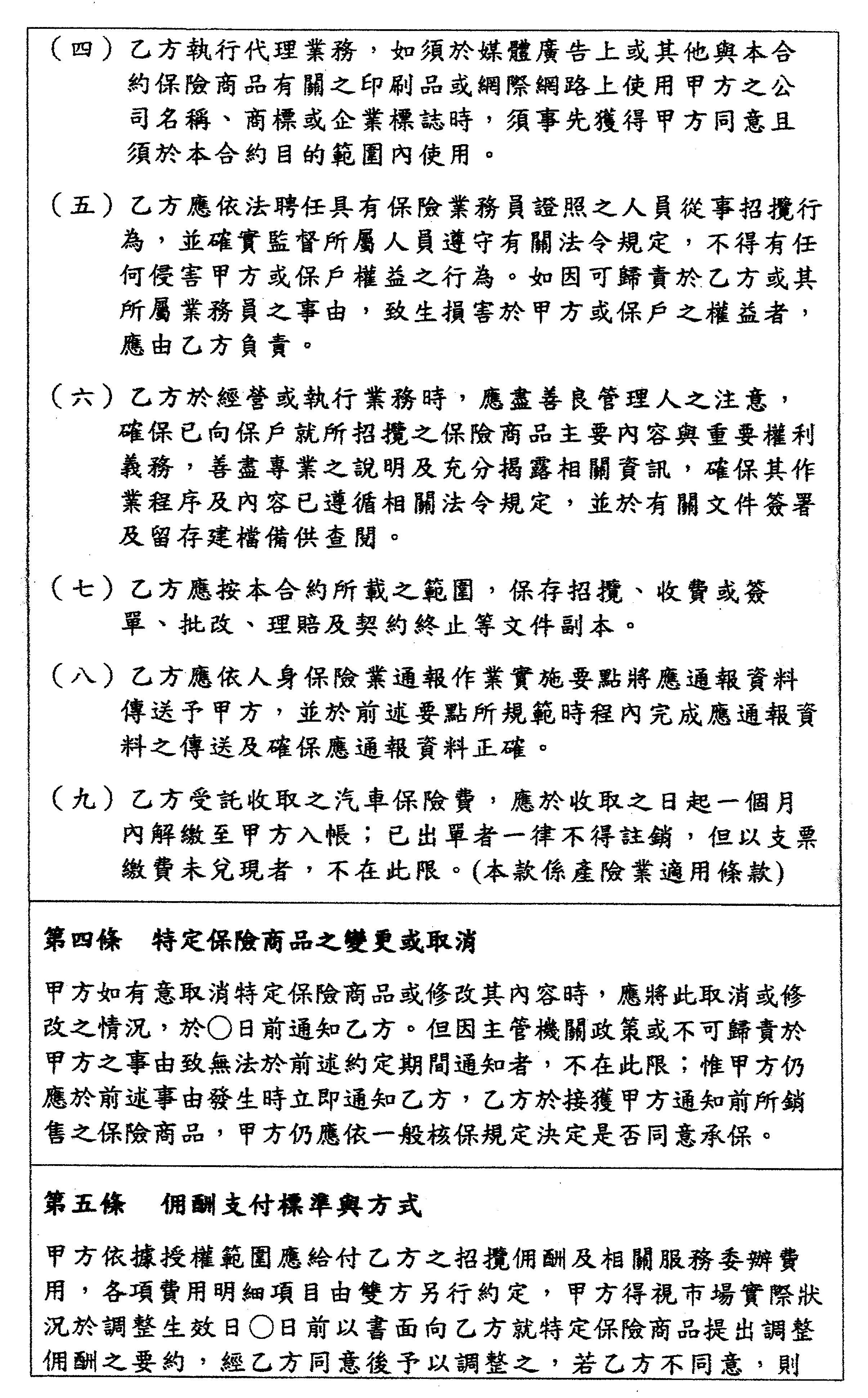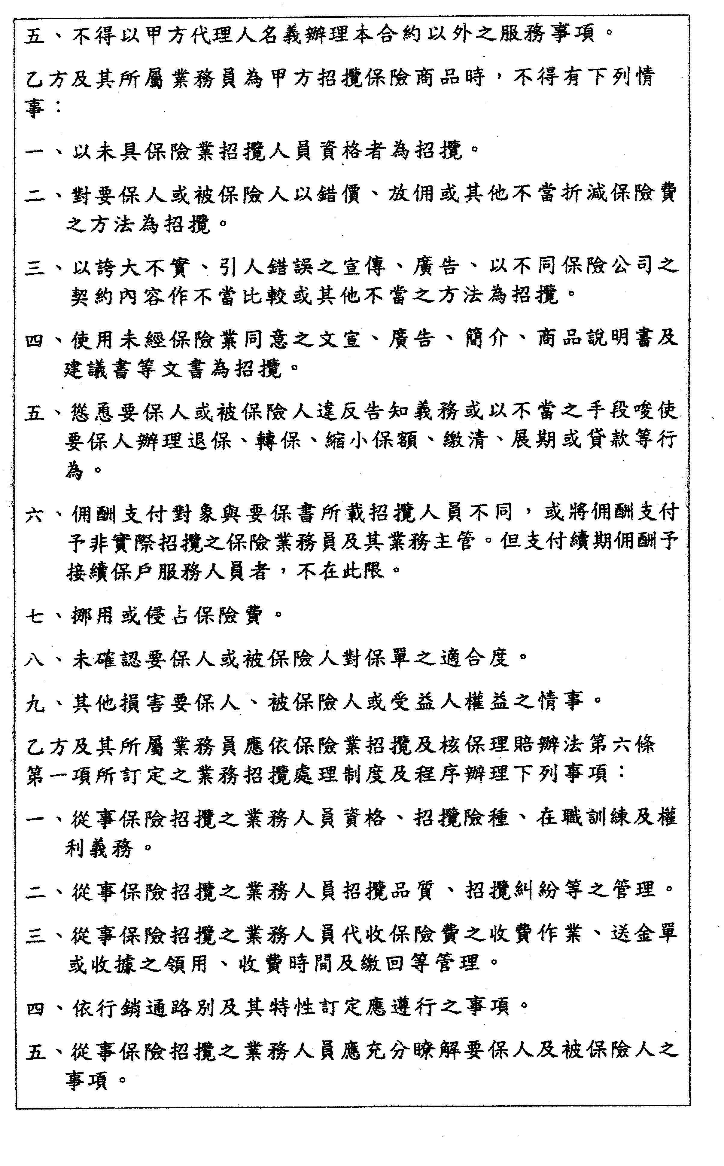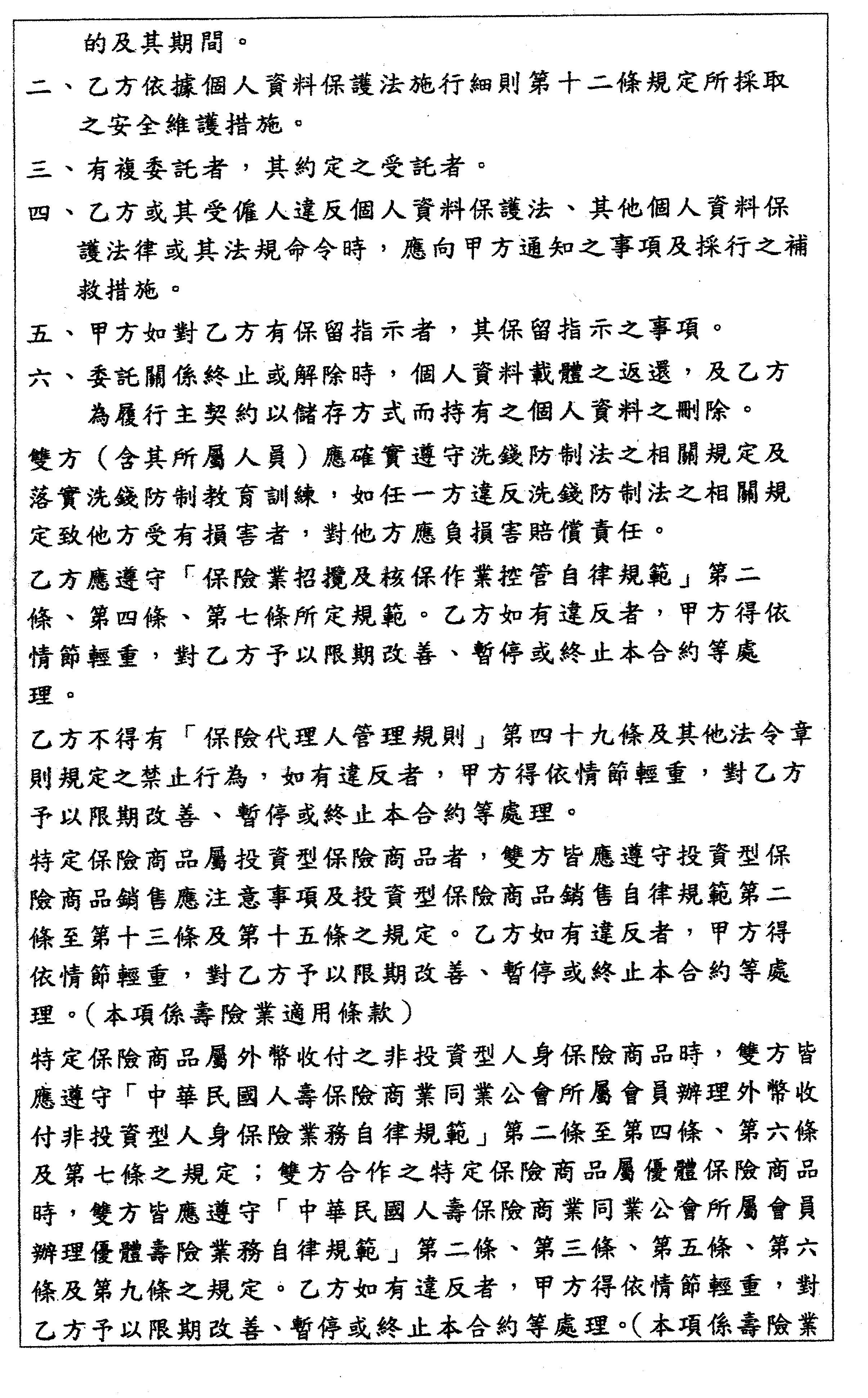 再來,我必須聲明的是,委員剛剛提到,在這裡必須做到社會祥和和勞資和諧,這是我們最終的目的。我們討論了這麼多,也接受業務員必須受到規則的規範和管理,這些我們都能接受,但是有幾個非常顯失公平的問題。公司的合約標題就寫了「承攬合約」,我就簡單地唸幾個裡面的條文。保險公司無須為業務員投保勞、健保,縱使國家法令規定公司必須為業務員投保勞、健保,業務員也必須支付全額的成本,請問這有沒有違反民法第二百四十七條之一顯失公平的規定?