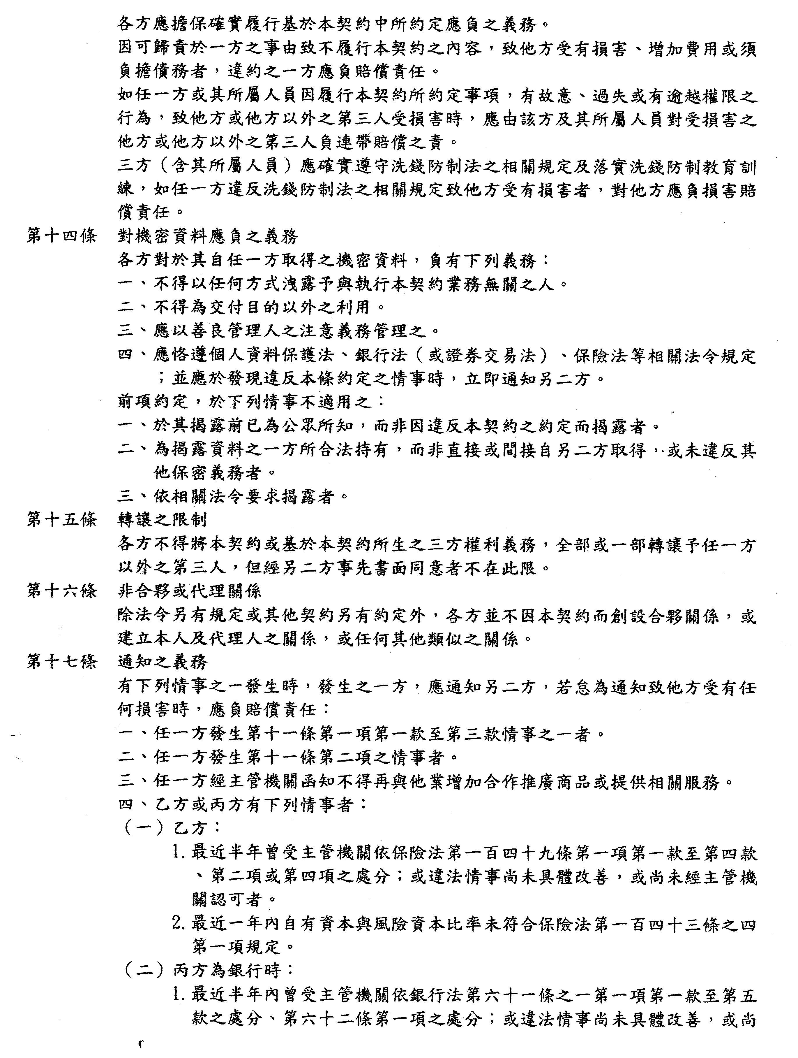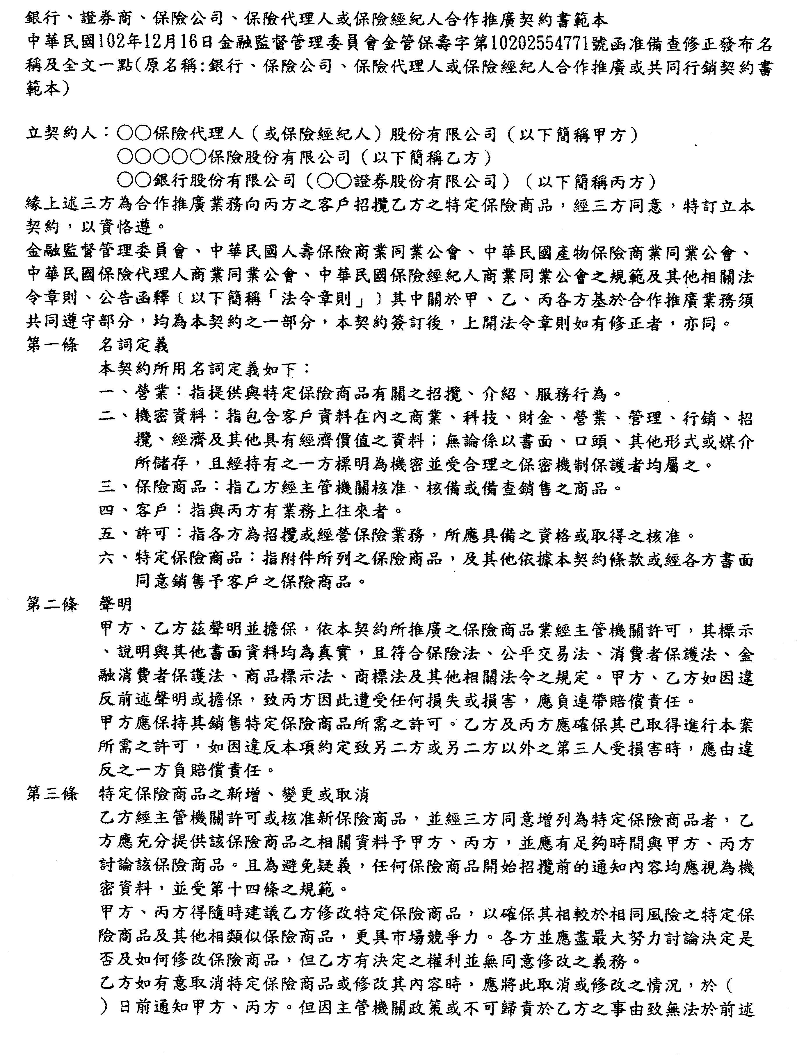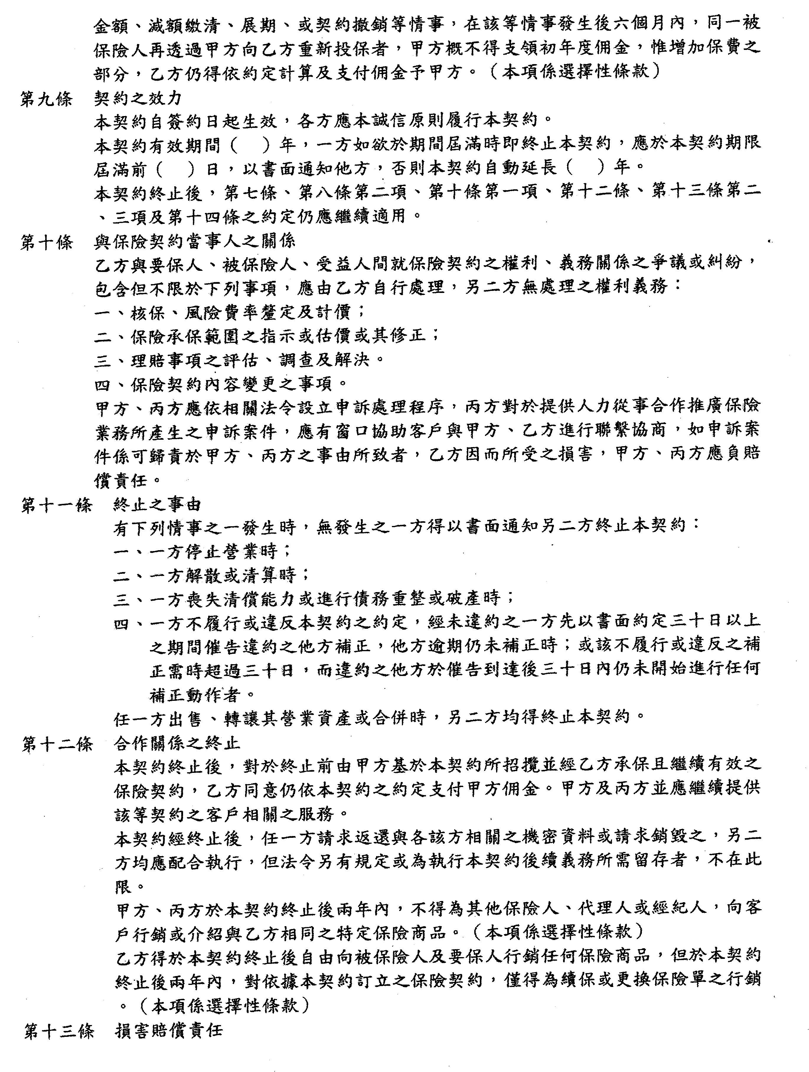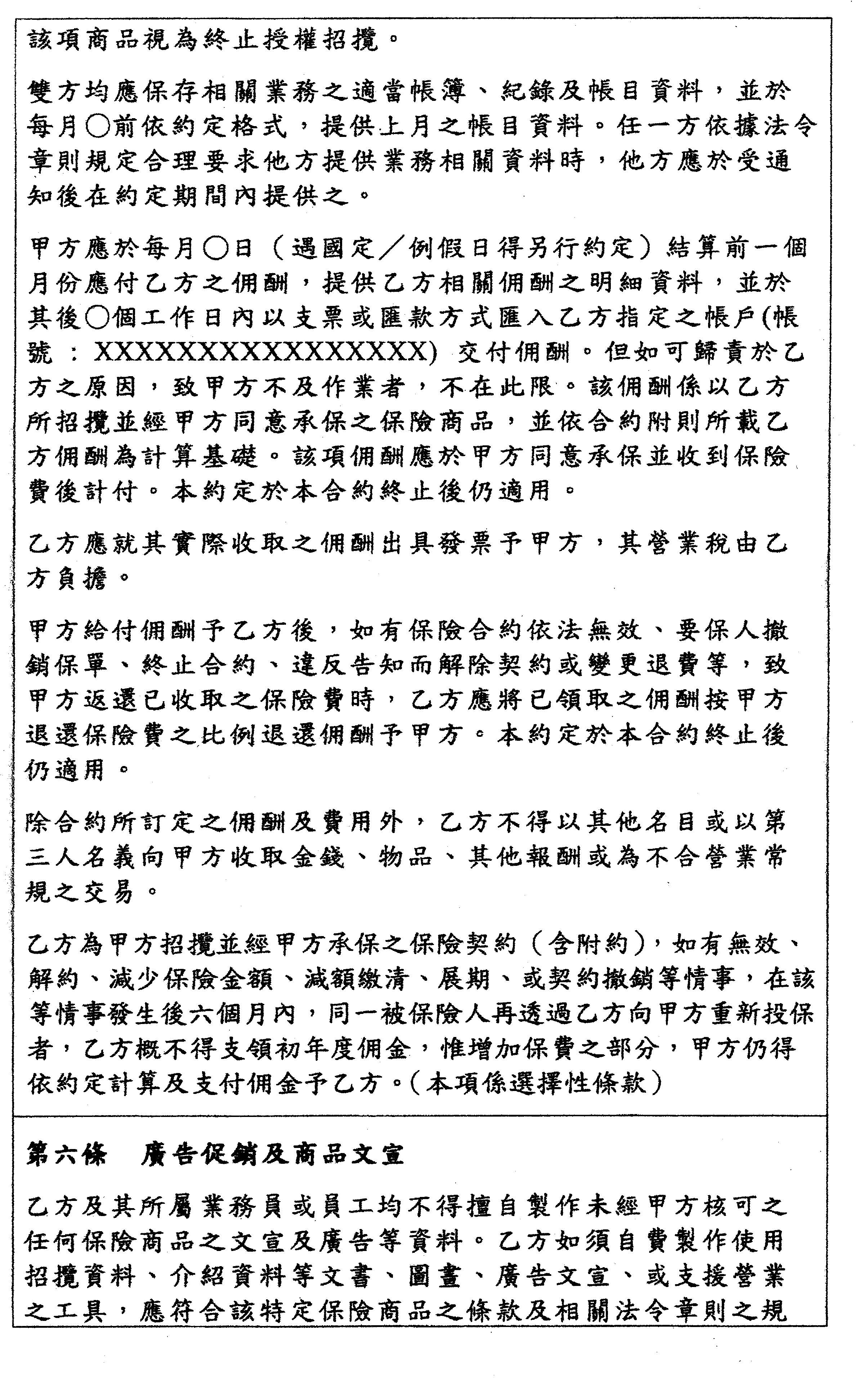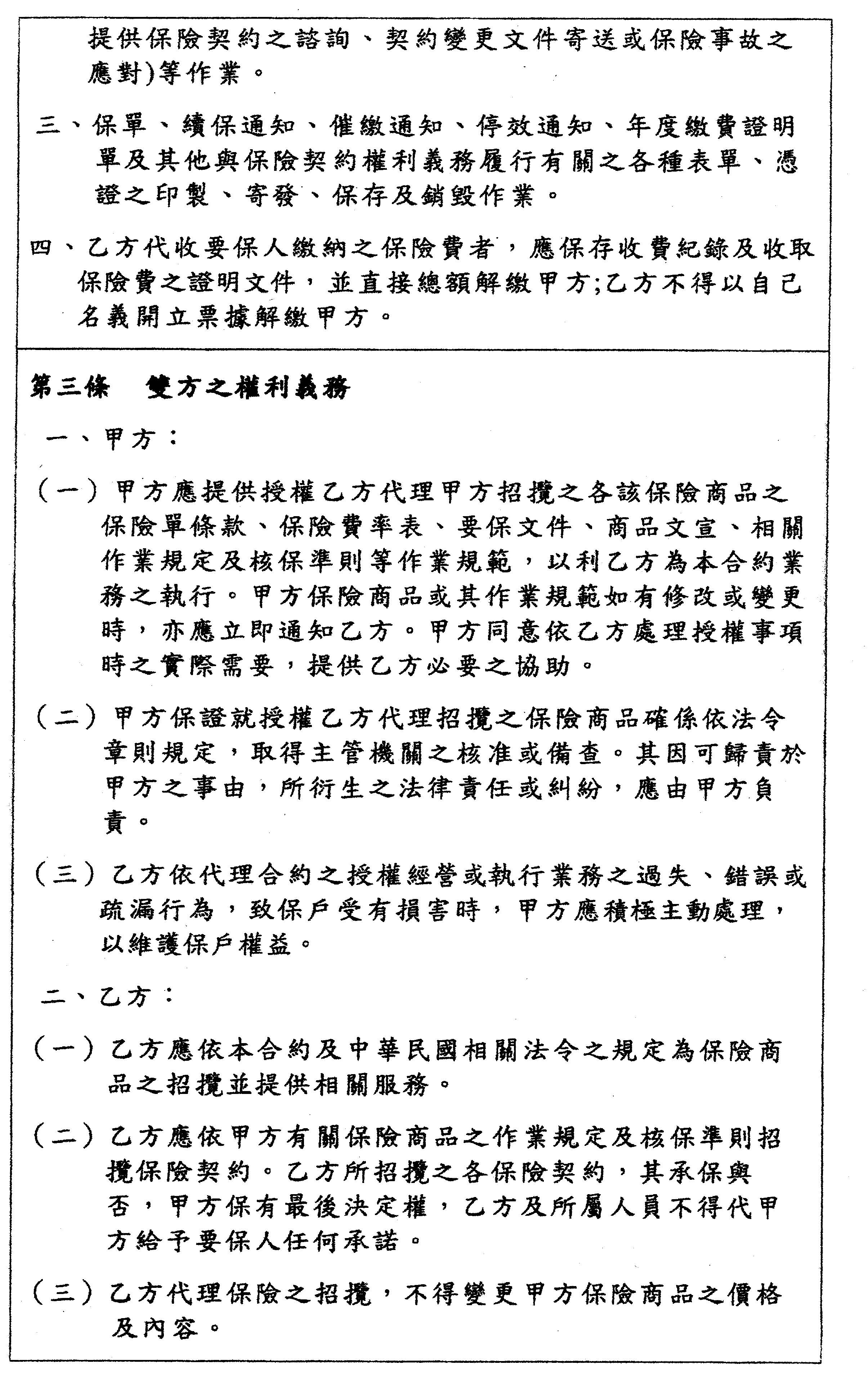 再來,我必須聲明的是,委員剛剛提到,在這裡必須做到社會祥和和勞資和諧,這是我們最終的目的。我們討論了這麼多,也接受業務員必須受到規則的規範和管理,這些我們都能接受,但是有幾個非常顯失公平的問題。公司的合約標題就寫了「承攬合約」,我就簡單地唸幾個裡面的條文。保險公司無須為業務員投保勞、健保,縱使國家法令規定公司必須為業務員投保勞、健保,業務員也必須支付全額的成本,請問這有沒有違反民法第二百四十七條之一顯失公平的規定?