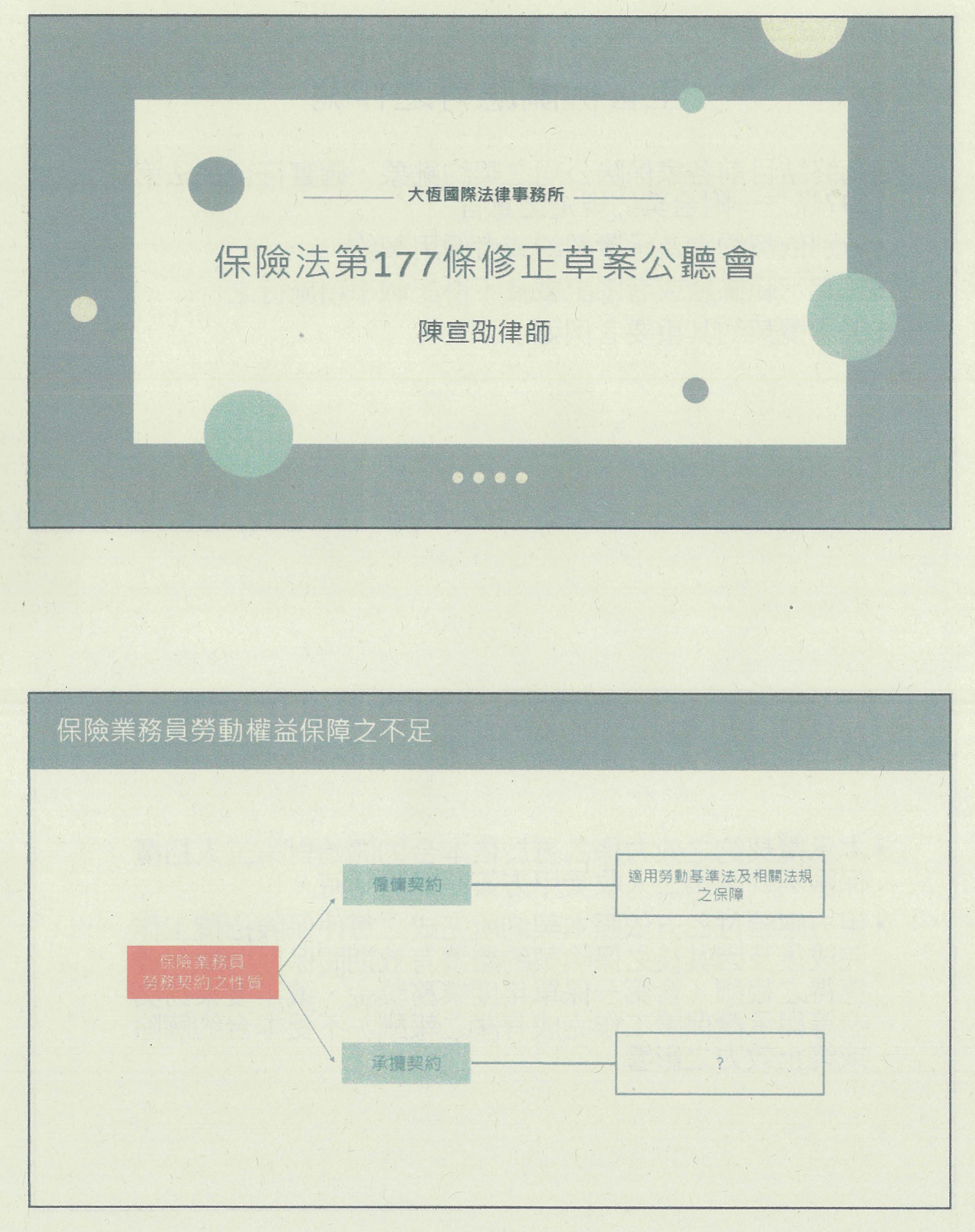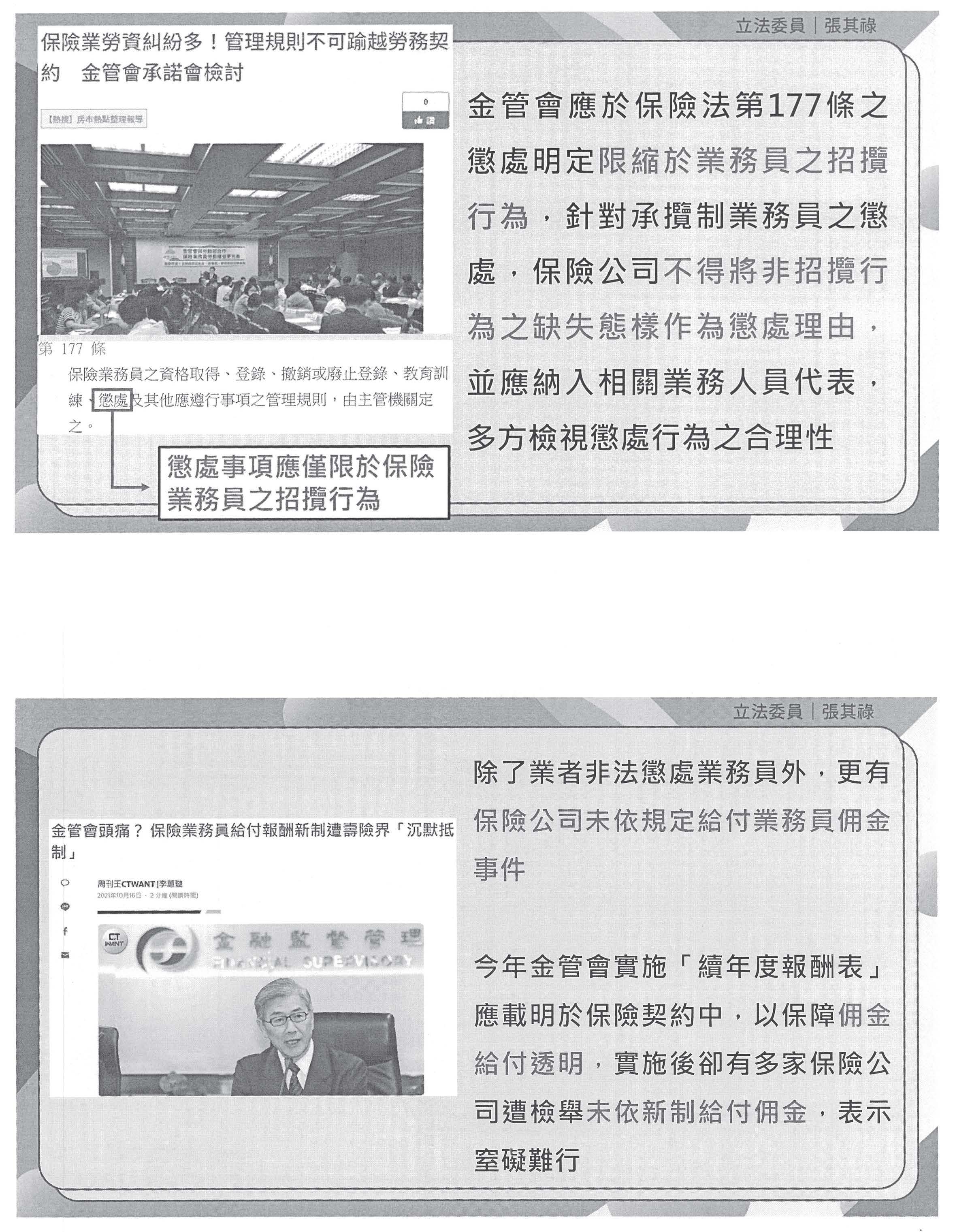 另外,今天可能還有一個爭議的點就是招攬業務傭金的給付方式,因為有時承攬的業務員會離職,所以這一部分就會失去保證。事實上,我們最主要是希望保險法第一百七十七條能夠上位到不是只用行政規則來加以規範,而是拉到母法的位階。