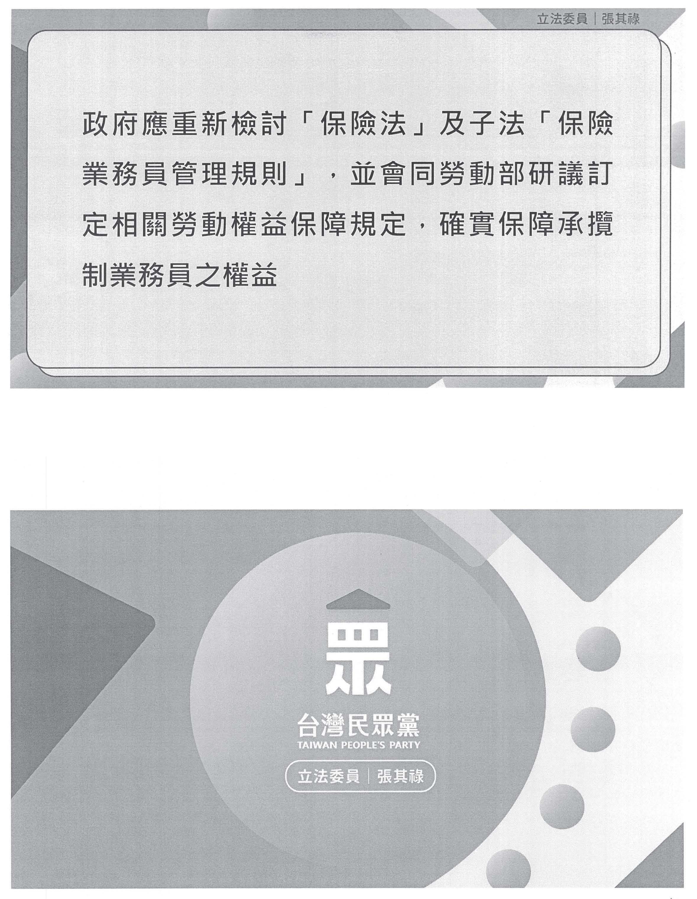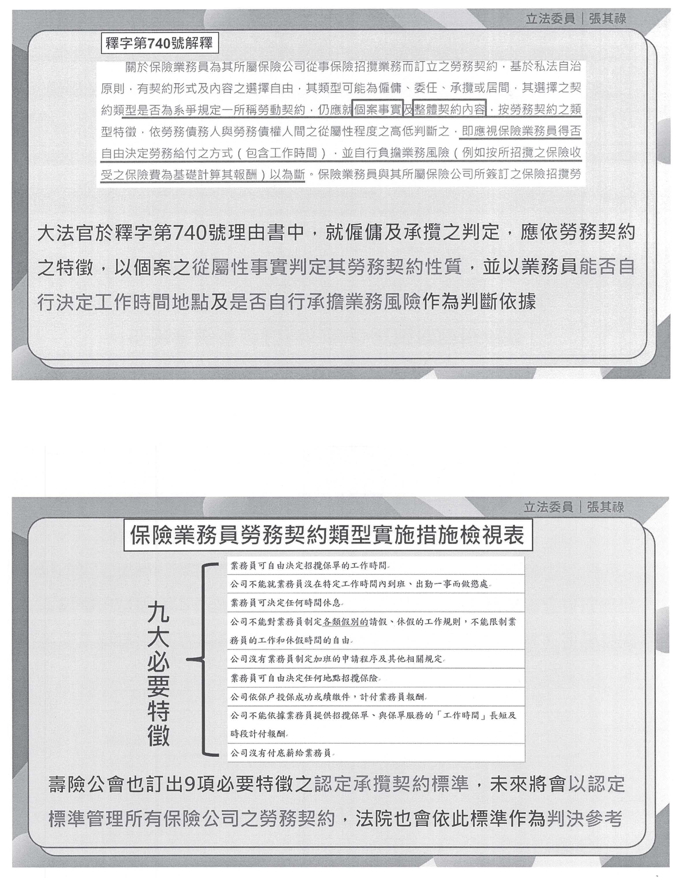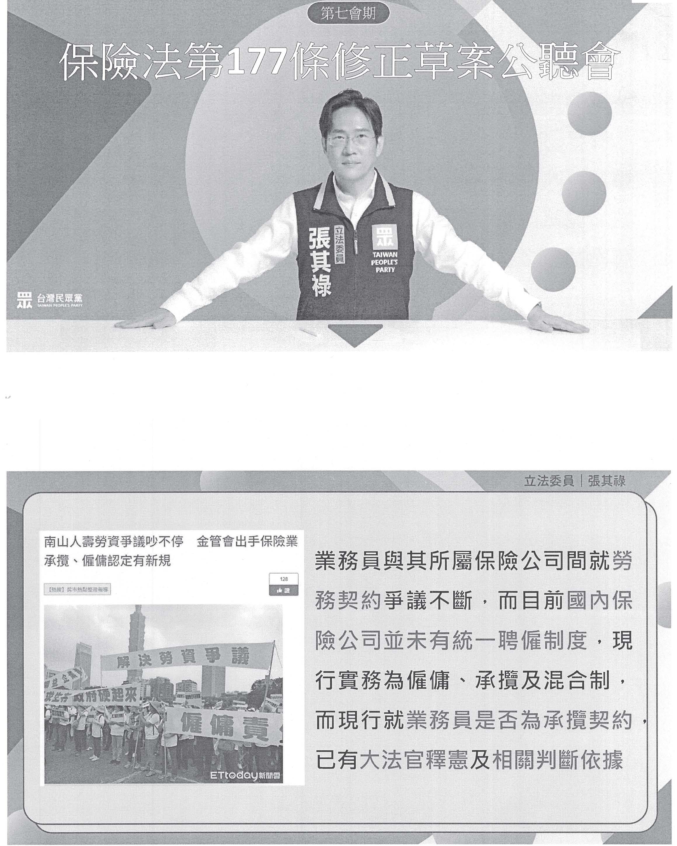 張委員其祿:謝謝召委。我是民眾黨不分區立法委員張其祿,感謝召委今天召開「保險法第一百七十七條條文修正草案檢討」公聽會,在此要向所有業界代表及學者專家報告,這次民眾黨針對第一百七十七條條文也有提出修法版本,在此謹說明本黨修法版本的主要精神。我想這次公聽會的召開最主要就是針對保險業務員到底是承攬還是僱傭關係加以釐清,我相信這件事情的背景大家都已經很清楚,無須再贅述。事實上,大法官第740號解釋令已經講得很清楚,目前我們是用行政命令的方式加以規範,包括壽險公會也訂出必要的承攬契約標準,簡單講就是它的規範。其實我們也清楚知道,重點在於現在很多保險公司的懲處,尤其是承攬制的,應該還是要限制在招攬業務的部分,而不是隨意逾越授權項目,任意進行懲處。